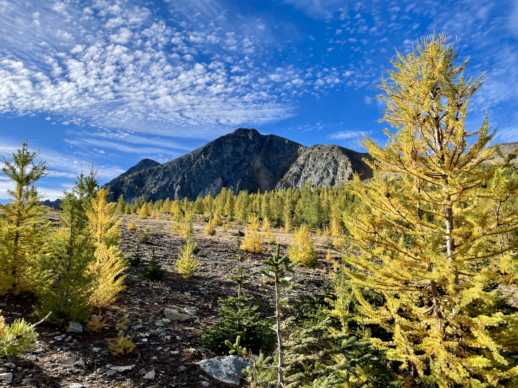 Over the past two days, we had observed that most larch trees were still one or two weeks shy of their full color change. Around Lake Doris and Rolo Pass, however, most larches appeared to be at peak gold. It’s always interesting to see how golden larches form in localized and seemingly random patches every autumn.
