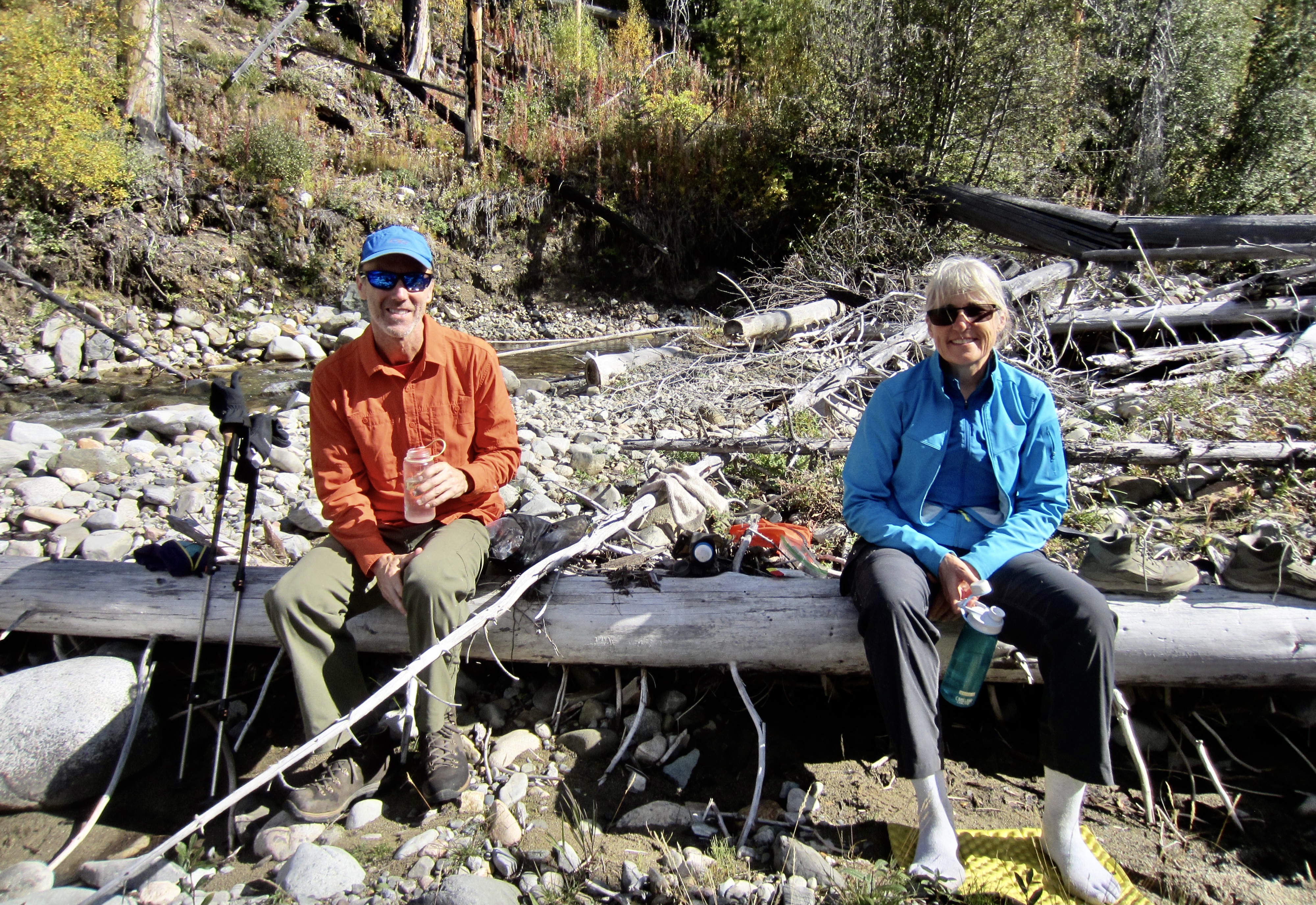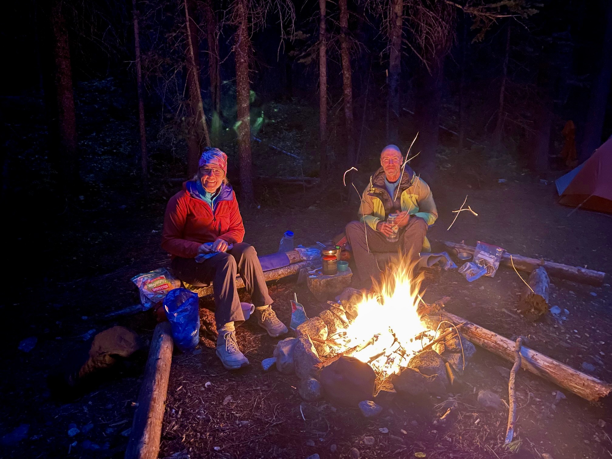 An intersection with the Robinson Creek Trail marked the closure of our loop. From there, we retraced our inbound route along the valley trail until arriving at Middle Fork Riverside Camp shortly before 6:00pm (9.3 hours + 2200 feet from Camp 3). This large campsite hosted Eileen and me on the final night of our 2006 Golden Larch Trip, so it felt good to end another trip here after 18 years. In keeping with tradition, Eileen built a campfire to add some much-appreciated ambience and warmth to our dinner.