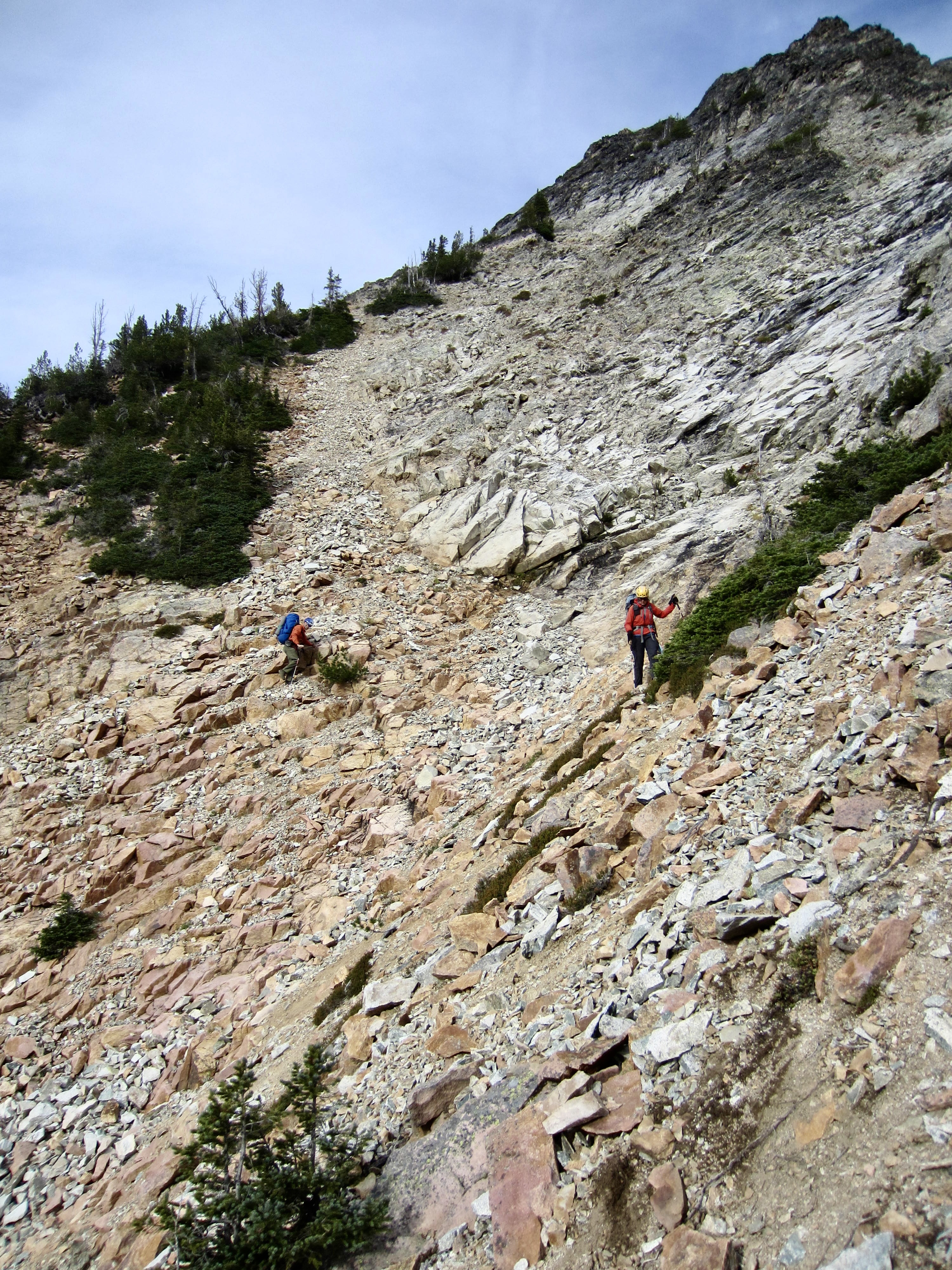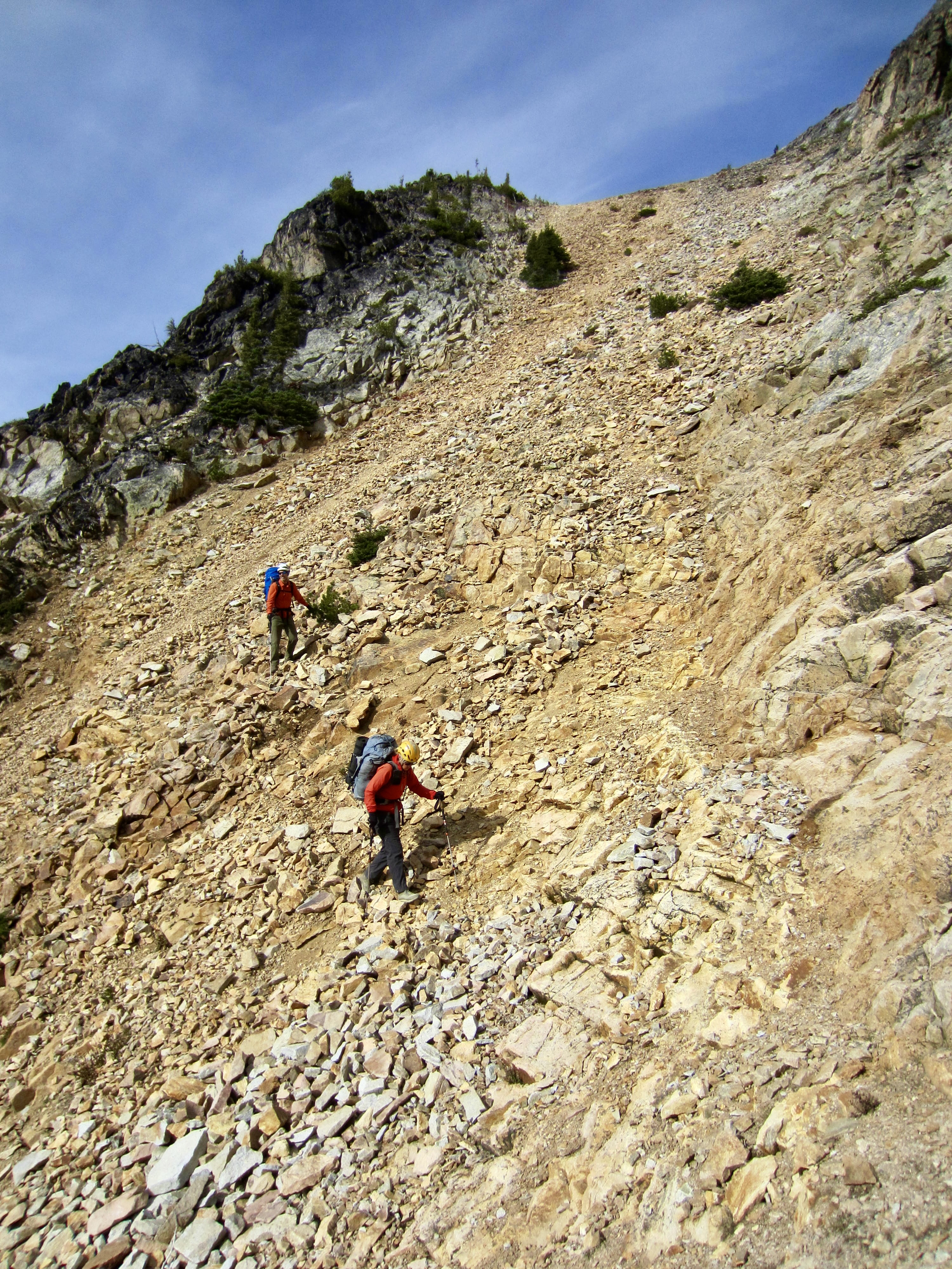 Our traverse started with a descent of a super-steep scree and talus chute. The debris in this chute is so unstable, it tended to form small, slow-moving avalanches below every footstep! After dropping 300 feet down the chute, we began angling across the steep hillside. This involved crossing a long series of ribs and gullies, all composed of loose volcanic rhyolite and andesite. Given the large number of people who climb Ptarmigan Peak every year, you might expect to see some sort of established route, but there was almost no evidence of previous travel.