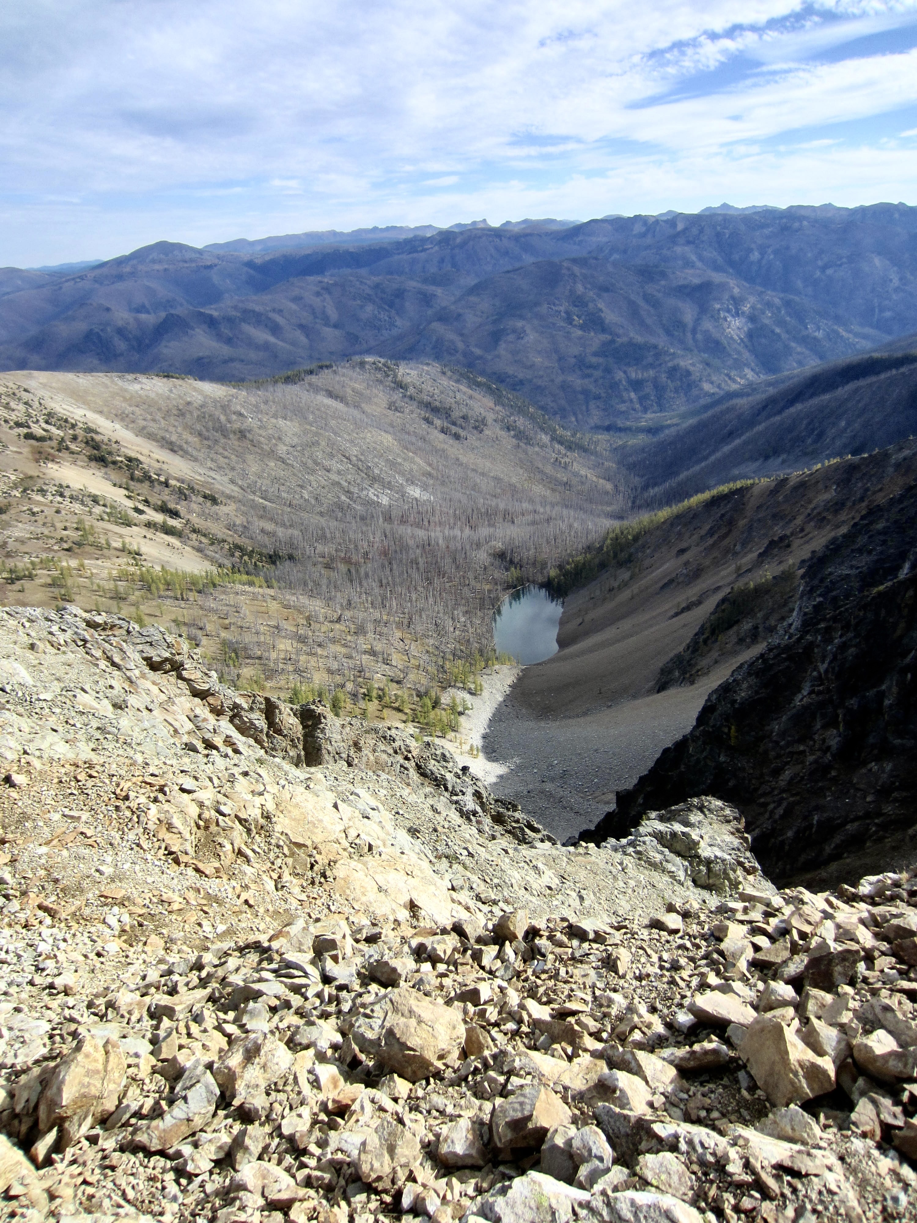 Our ridge descent took us above Dot Lakes, which sit in a shallow bowl down to the east. In another week or two, the larch trees surrounding these lakes will turn the bowl ablaze with gold. We were sorry to miss it. Upon reaching the saddle between Dot Mountain and Point 8165, we stopped for a late lunch.