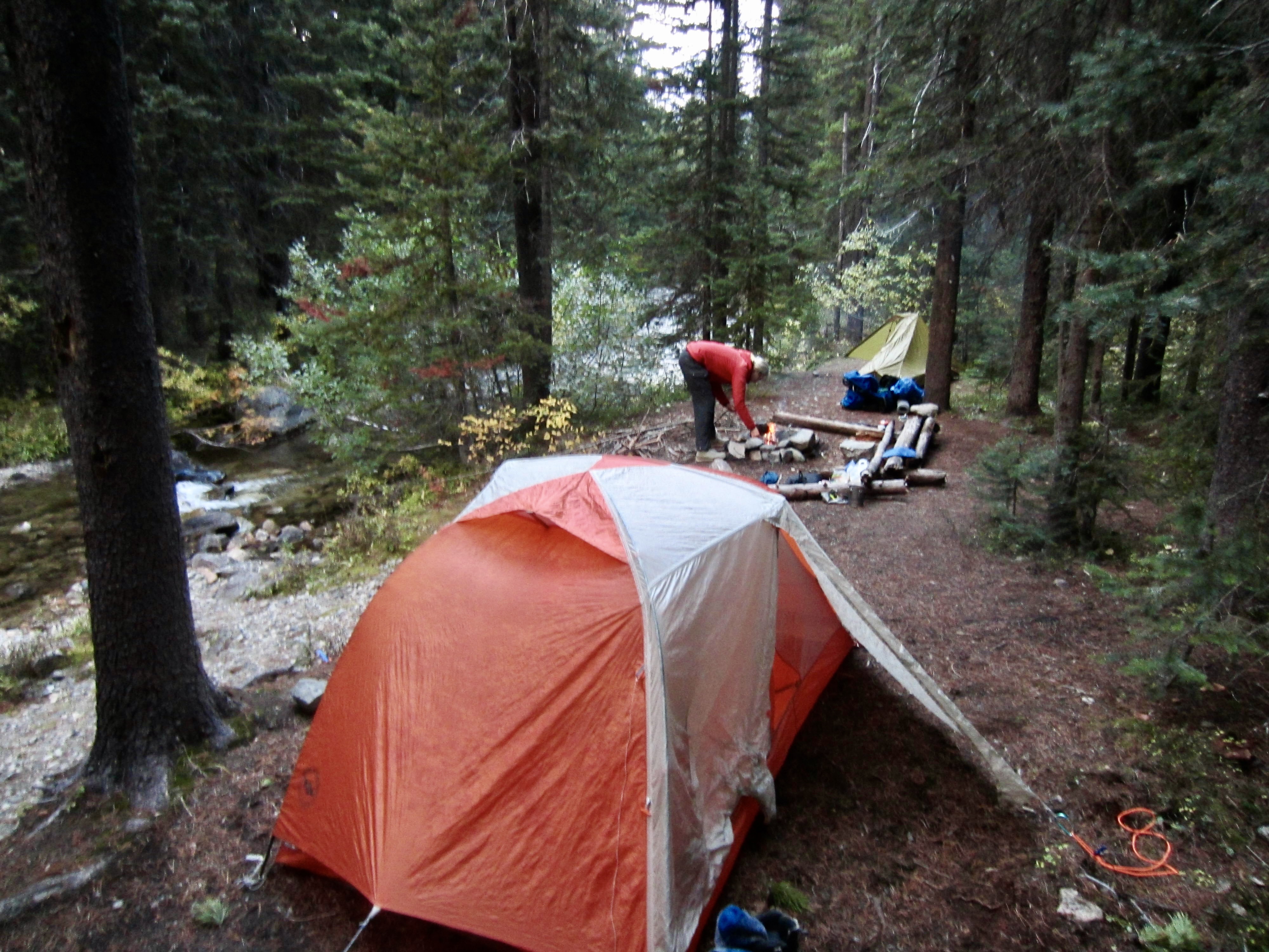 It was raining steadily by the time we reached the Shellrock Pass Trail junction in early evening (4.3 hours + 9.0 miles + 450 feet – 2300 feet from TH). Just 100 yards beyond this junction, we found a small established campsite adjacent to Berk Creek and gladly stopped for the day.