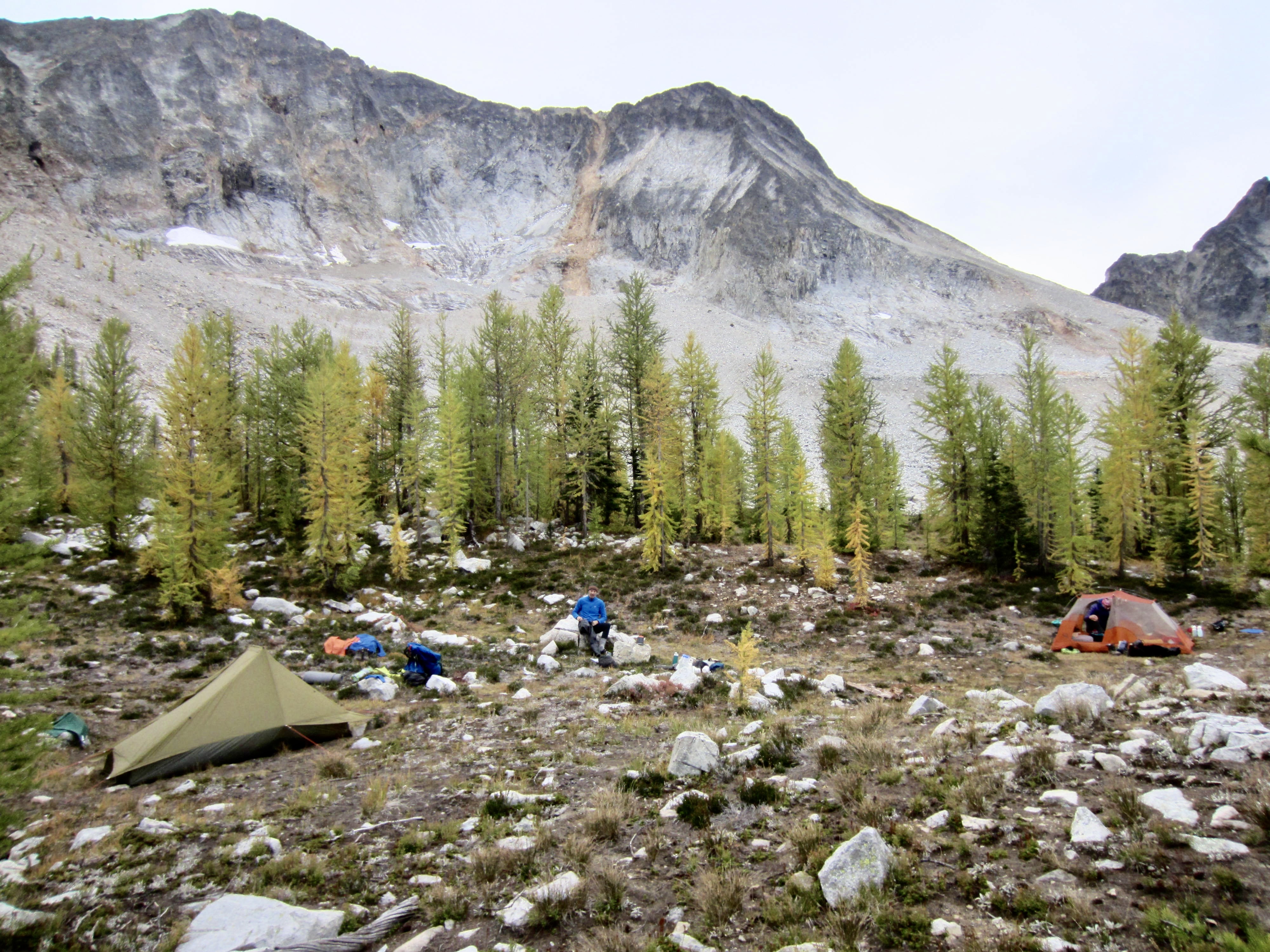 After 2 hours of slow and altogether unsavory traversing, we reached the relatively friendly talus fields of Lago Basin. We descended to a cascading creek to water up, then hiked uphill in search of a suitable campsite. At 7050 feet, we found a grassy bowl surrounded by larch trees, and here we stopped for the day (8.2 hours + 2300 feet from Camp 2). Our original plan was to camp in Shellrock Basin tonight, but yesterday’s jackstraw forest and today’s awful traverse had put us a half-day behind schedule. On the positive side, Lago Basin is actually a more scenic campsite than Shellrock Basin.