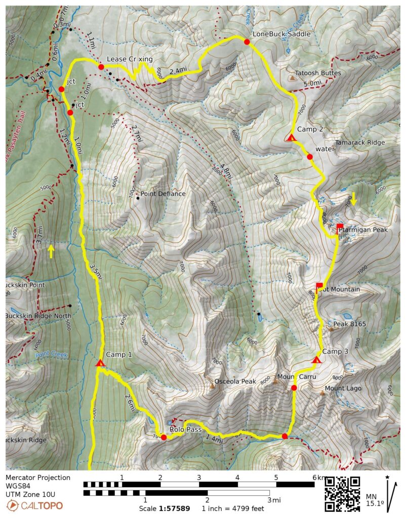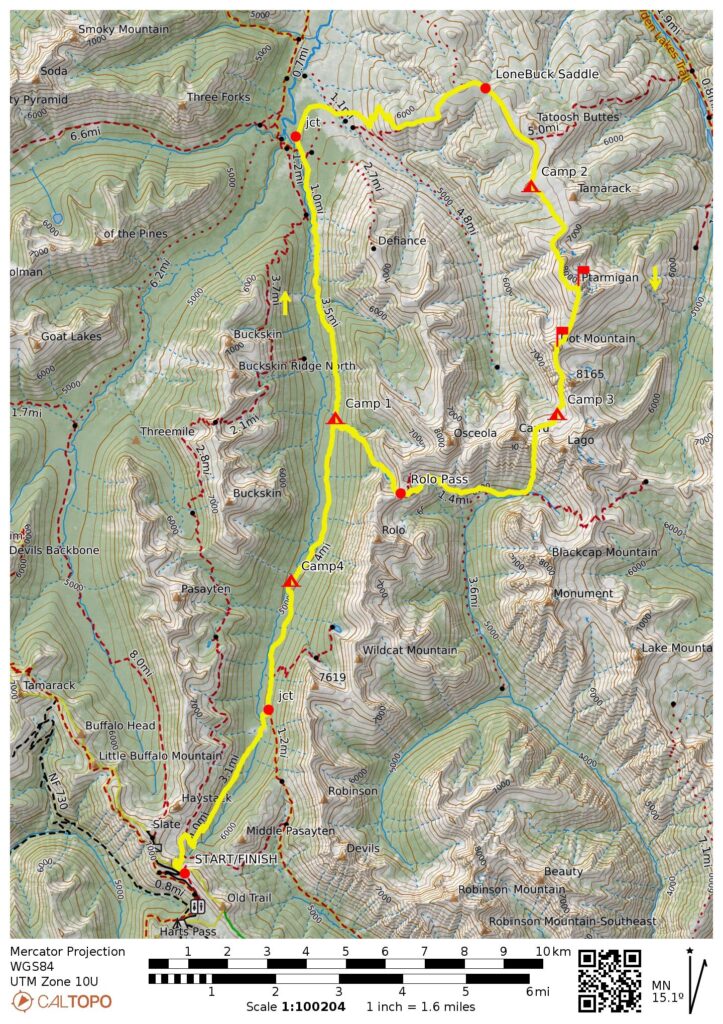 Way Points: Slate Pass & Middle Fork Pasayten River crossing & Robinson Creek Trail junction & Middle Fork Riverside Camp & Shellrock Pass Trail junction & Berk Creek crossing & Tatoosh Buttes Trail junction & Lease Creek crossing & Lone Buck Saddle & Tamarack Ridge / Point 7042 & North Ptarmigan Peak Saddle & Ptarmigan Peak summit & Ptarmigan–Dot Saddle & Dot Mountain summit & South Dot Mountain Saddle & Lago Basin & Lago–Carru Col & Eureka Creek Trail junction & Shellrock Pass Trail junction & Rolo Pass & Fred’s Lake & Robinson Creek Trail junction & Middle Fork Riverside Camp & Whistler Cutoff junction & Slate Pass & Buckskin Ridge Trailhead (trail hike & off-trail hike & rock scramble)