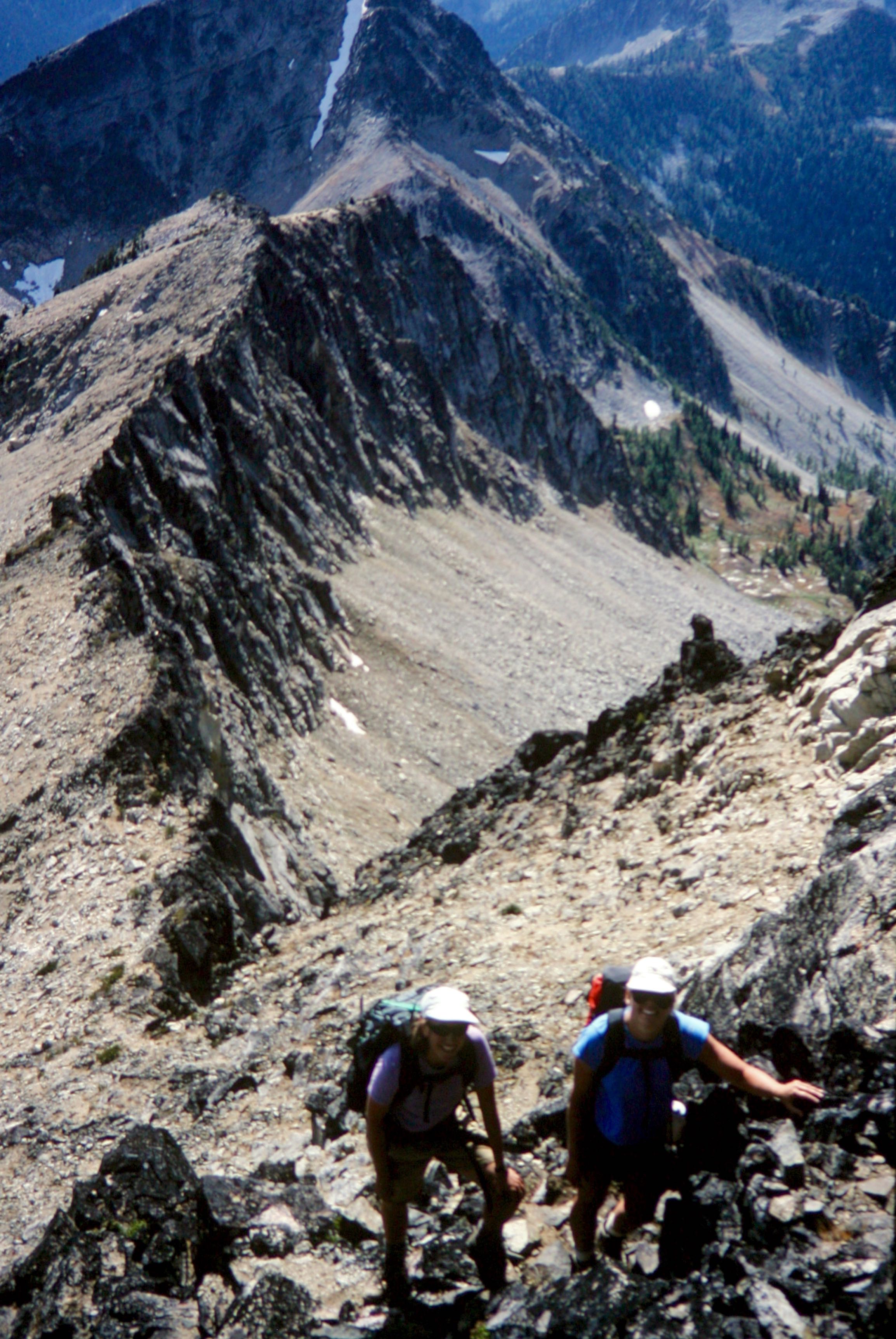 The overcast was dissipating and allowed nice views in all directions, including straight down to Lake Chelan—6300 feet below us. We groaned at the thought of our impending plunge to lake level but were hoping to catch the Lady Express before she left Stehekin at 11:45. About 3 hours and a thousand swithbacks later, we hiked across the concrete landing (4.5 hours from Camp 2) and directly onto the waiting boat, scant minutes before departure!