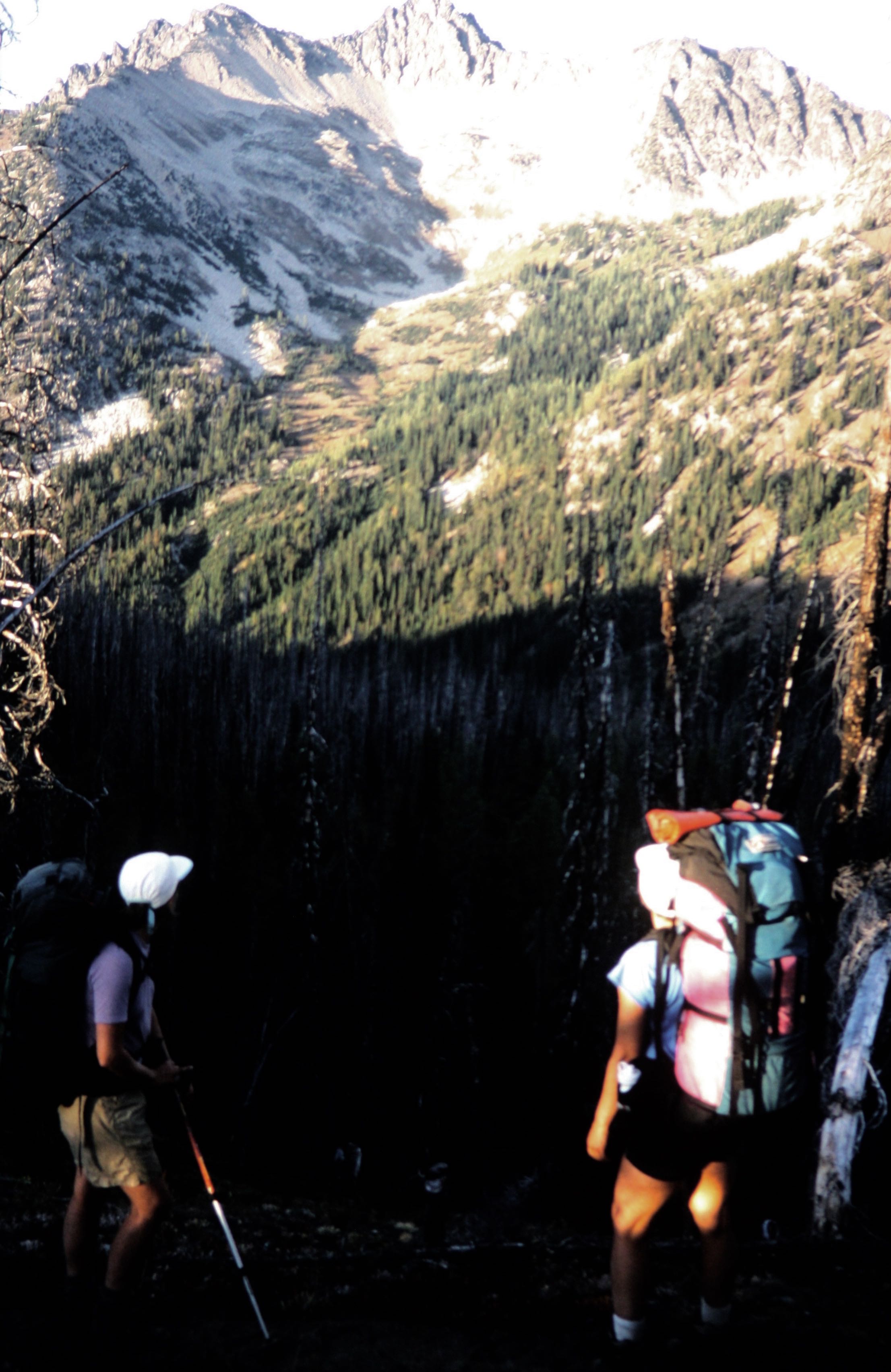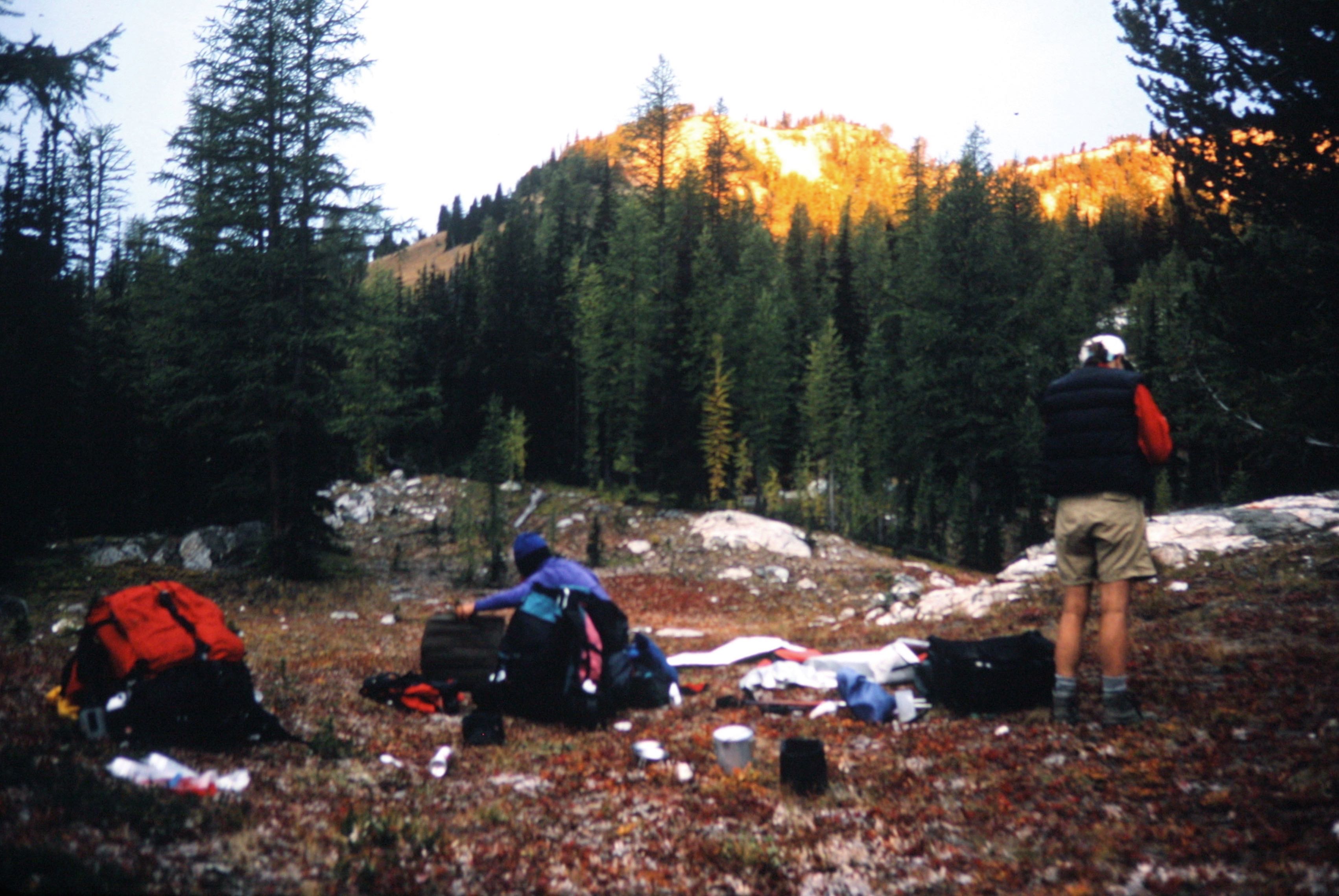 After a leisurely breakfast on Saturday morning, we shouldered summit packs and struck off through the forest on an eastward bearing. Dense firs gradually gave way to sparse larches and heather slopes below Reynolds Peak.