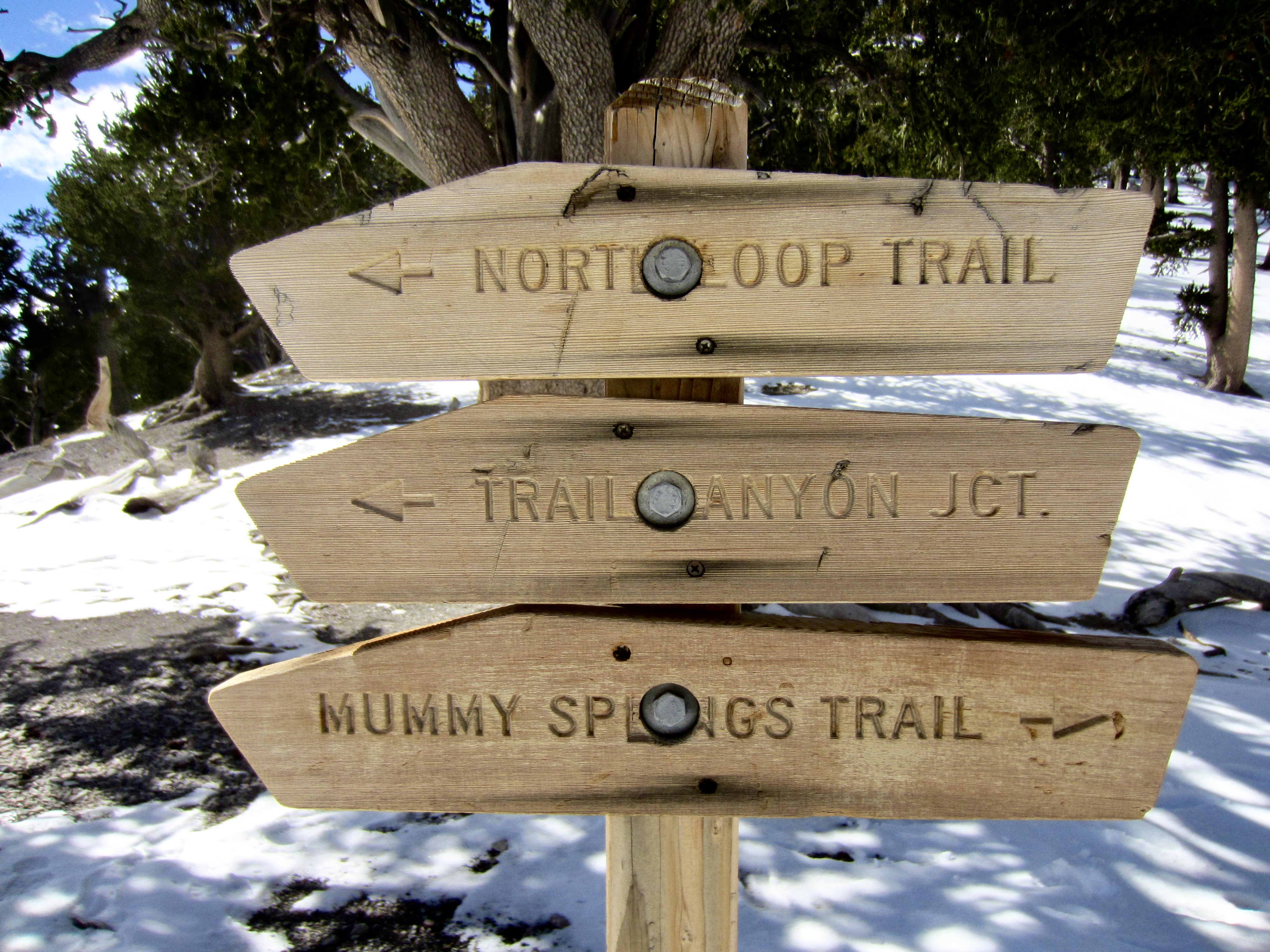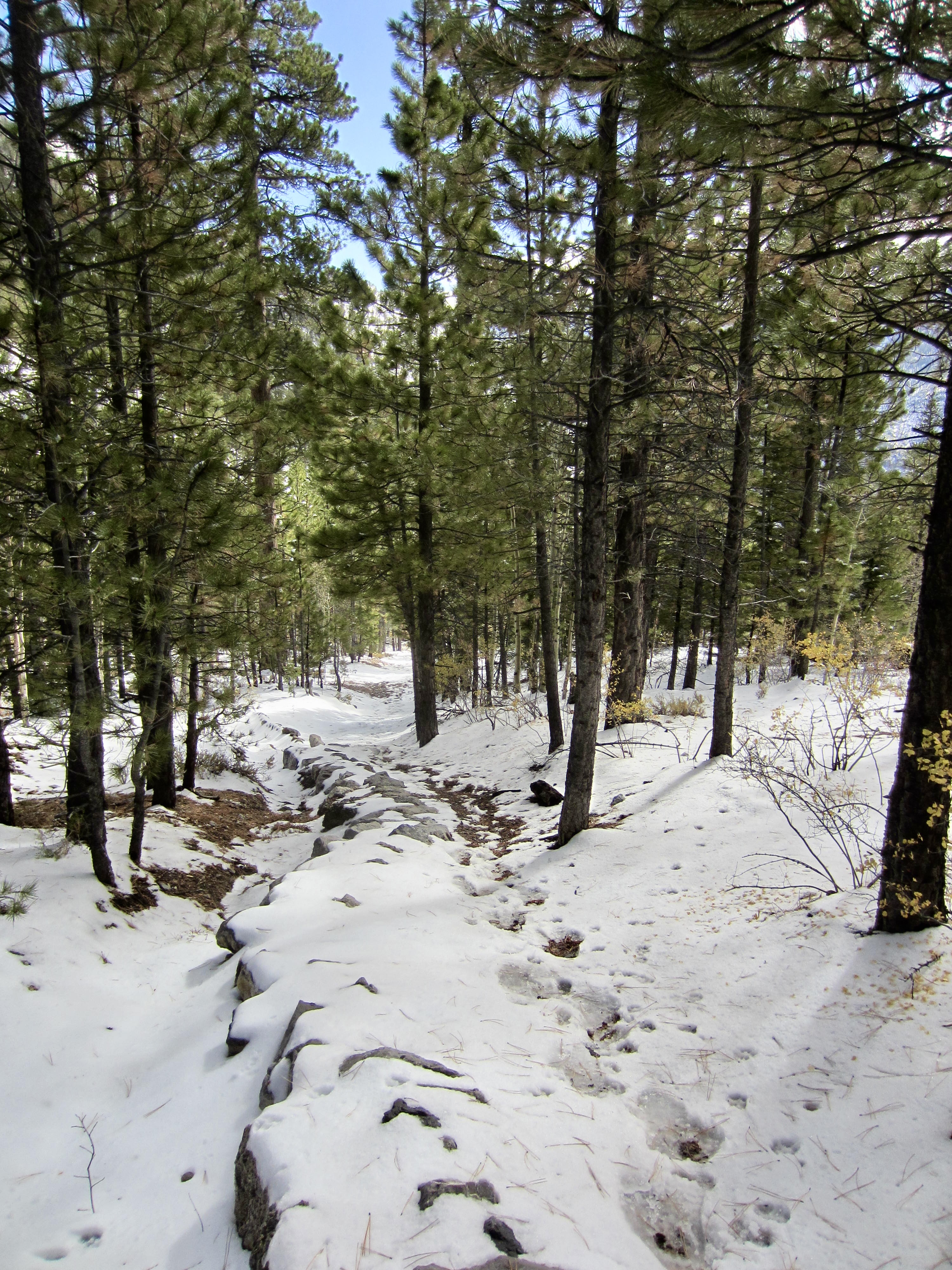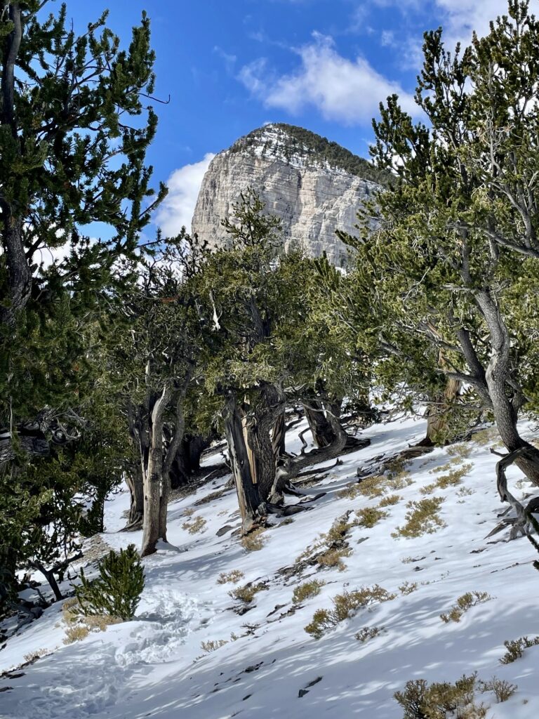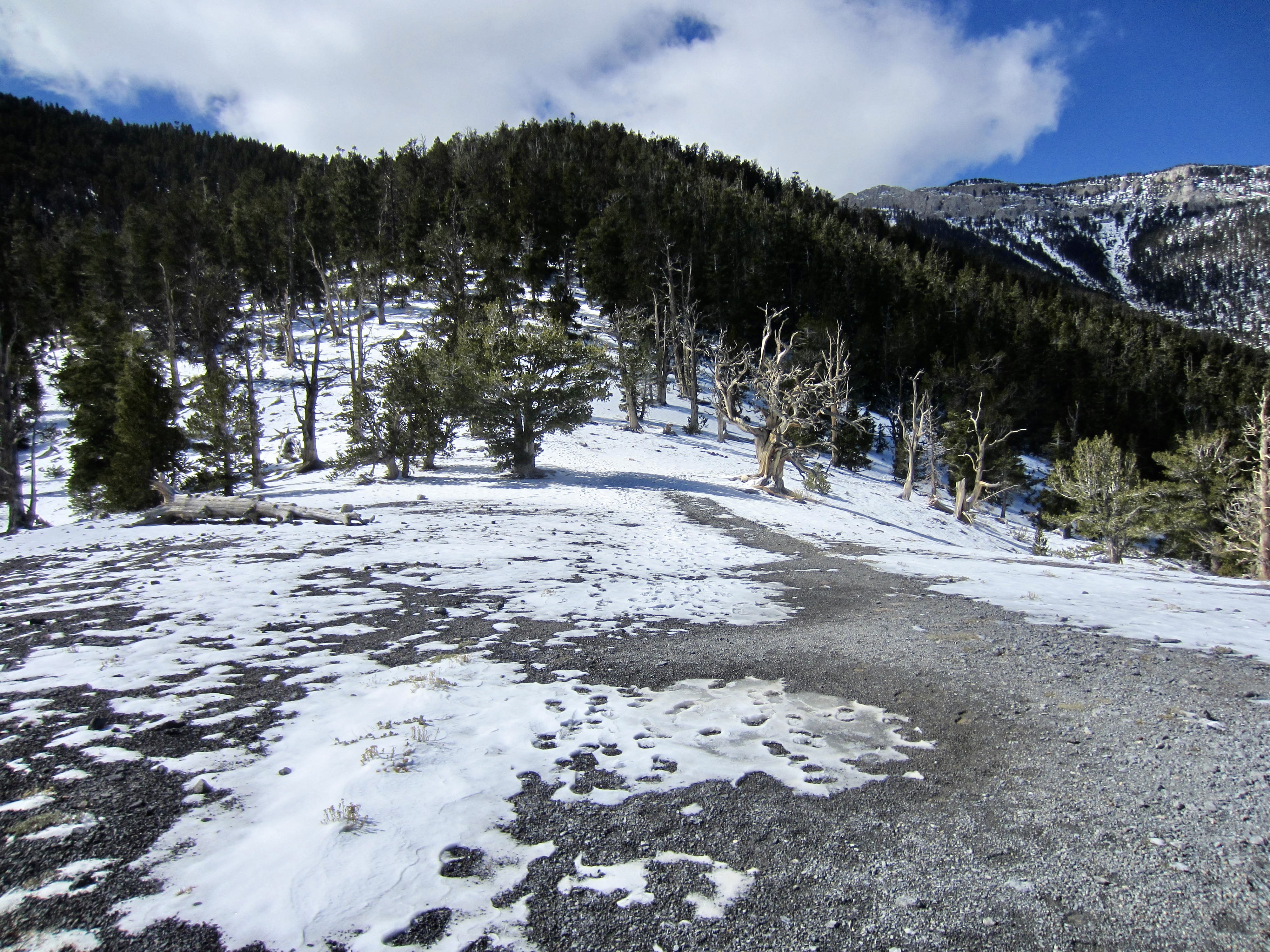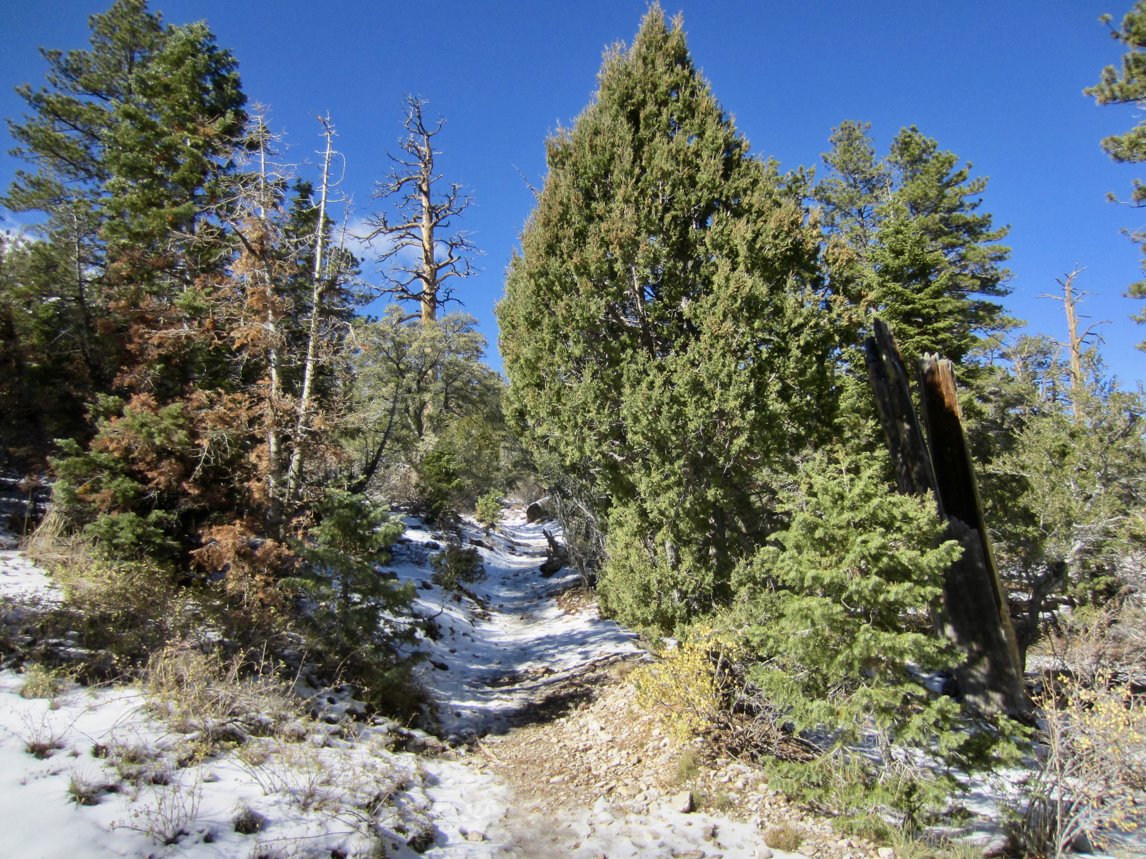 Starting at the North Loop Trailhead on a cold, sunny Thursday morning, I hiked up the southwest-trending trail and soon entered the Mt. Charleston Wilderness. Most of the trail was covered by a thin layer of compact snow and ice, so traction was sketchy. I wished that I’d brought my microspikes from home—a wish that became much more emphatic in the coming days.