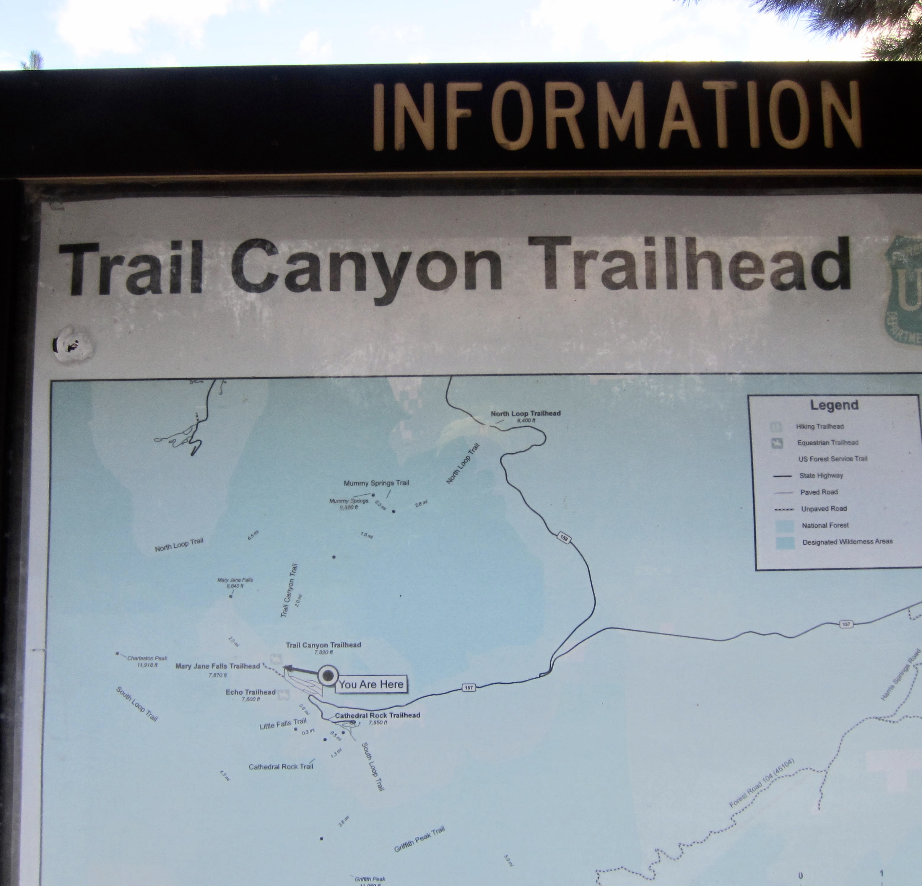 On our first full day in this unfamiliar area, I did a 6-mile trail traverse over Mummy Pass, from Deer Creek Road to Echo Road in Kyle Canyon. Eileen was on injured-reserve, so she dropped me off at the North Loop Trailhead and then planned to pick me up at the Trail Canyon Trailhead on the other side of the pass. We both figured that this would allow me to reconnoiter trail and snow conditions in preparation for subsequent hikes. It turned out to be not only a good reconnaissance but also a very scenic and, in several ways, very surprising hike.