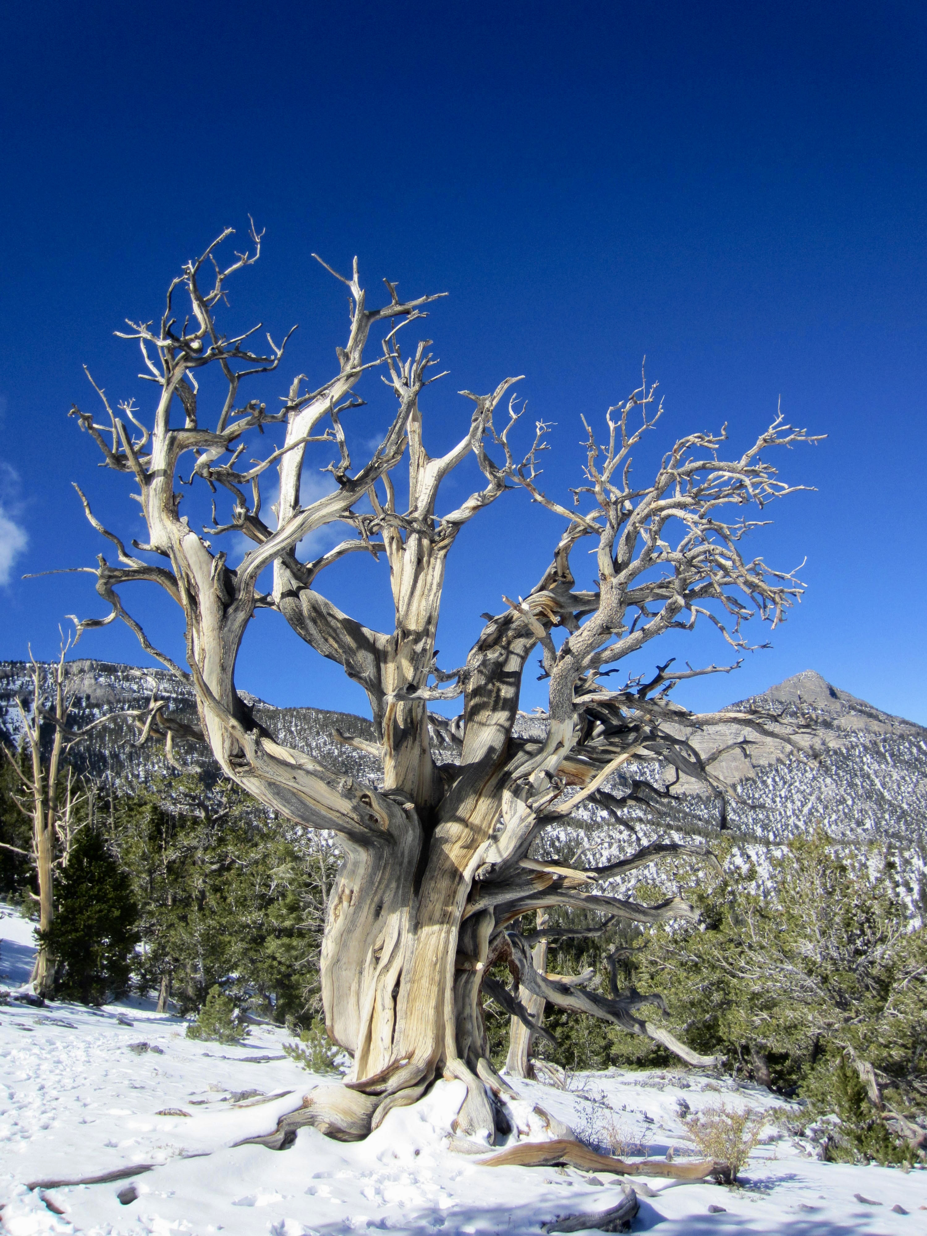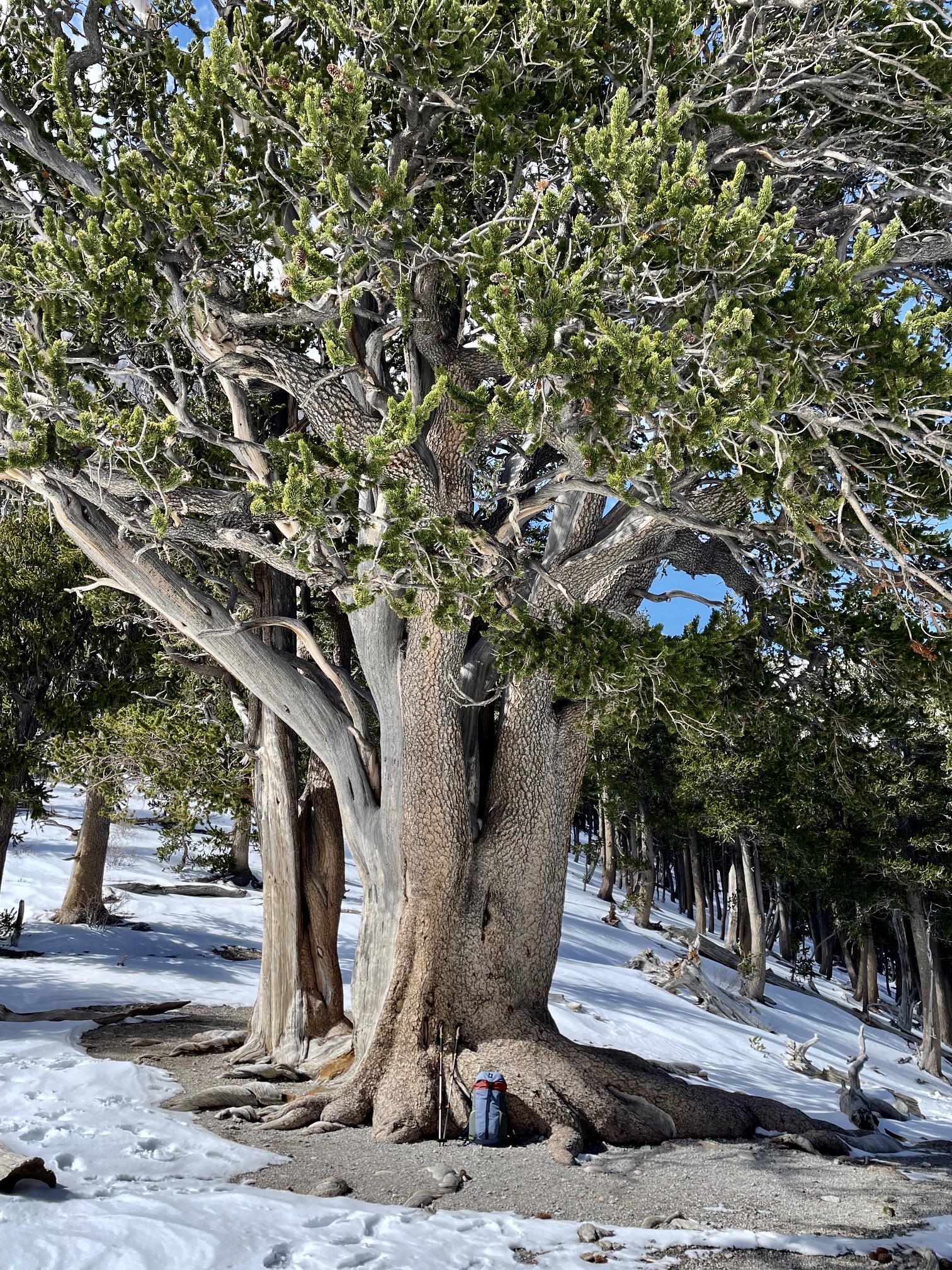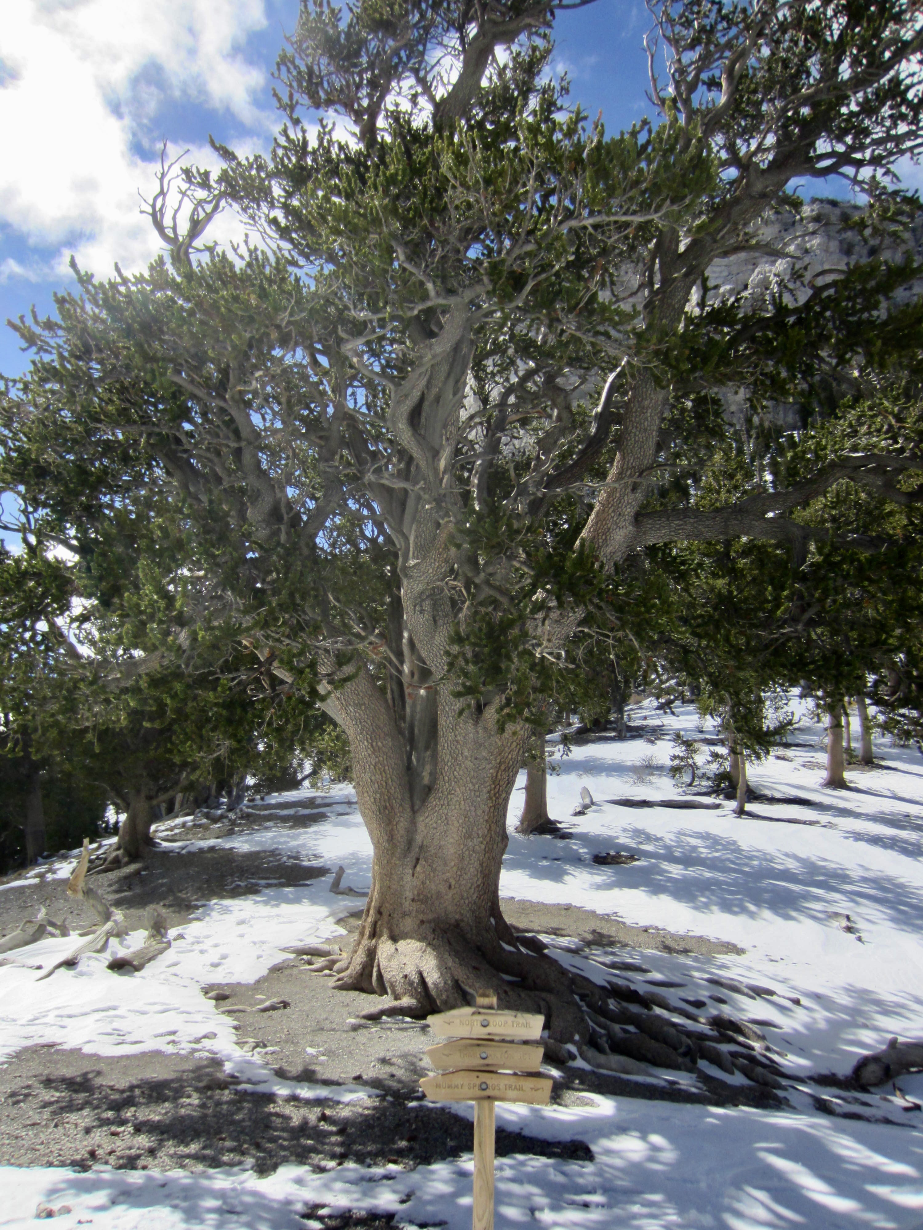 From Raintree Shoulder, the trail wove me through two closely spaced saddles in the ridge crest and quickly brought me to Raintree Junction at a third saddle. Here, a spur trail angles right (northwest) to Mummy Springs, and the North Loop Trail angles left (southwest) to Mummy Pass. Most notable, though, is a gigantic bristlecone pine tree that stands guard at the junction. This majestic specimen, formally known as The Raintree, has been estimated to be 3000 years old, making it the oldest living thing in Nevada!
