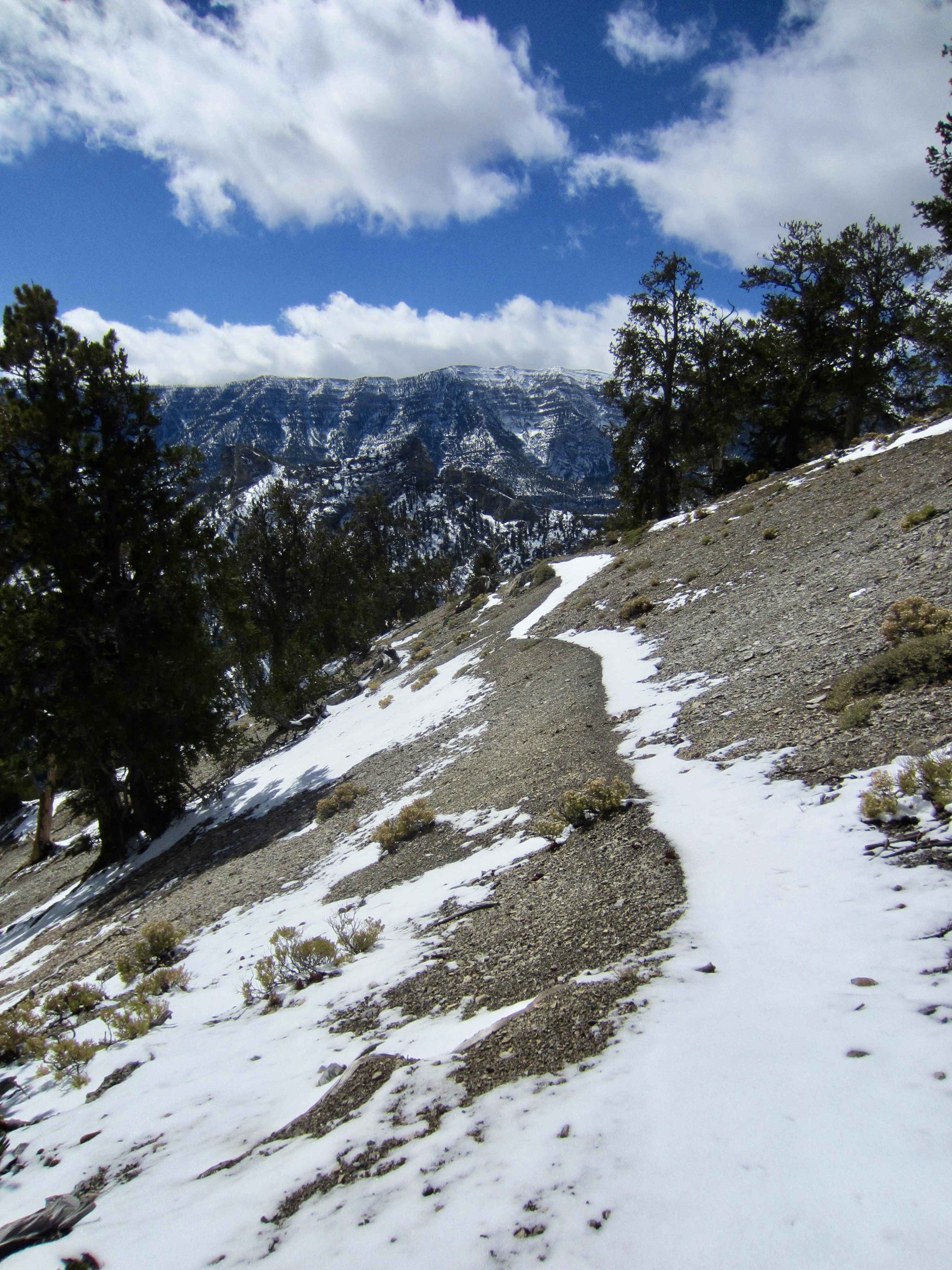 The North Loop Trail constitutes half of a National Recreation Trail (the South Loop Trail being the other half) that crosses over the summit of Charleston Peak. I quickly saw how it gained this national status, as I passed through forests of ponderosa and bristlecone pine trees with views of high peaks above and sprawling desert plains below.