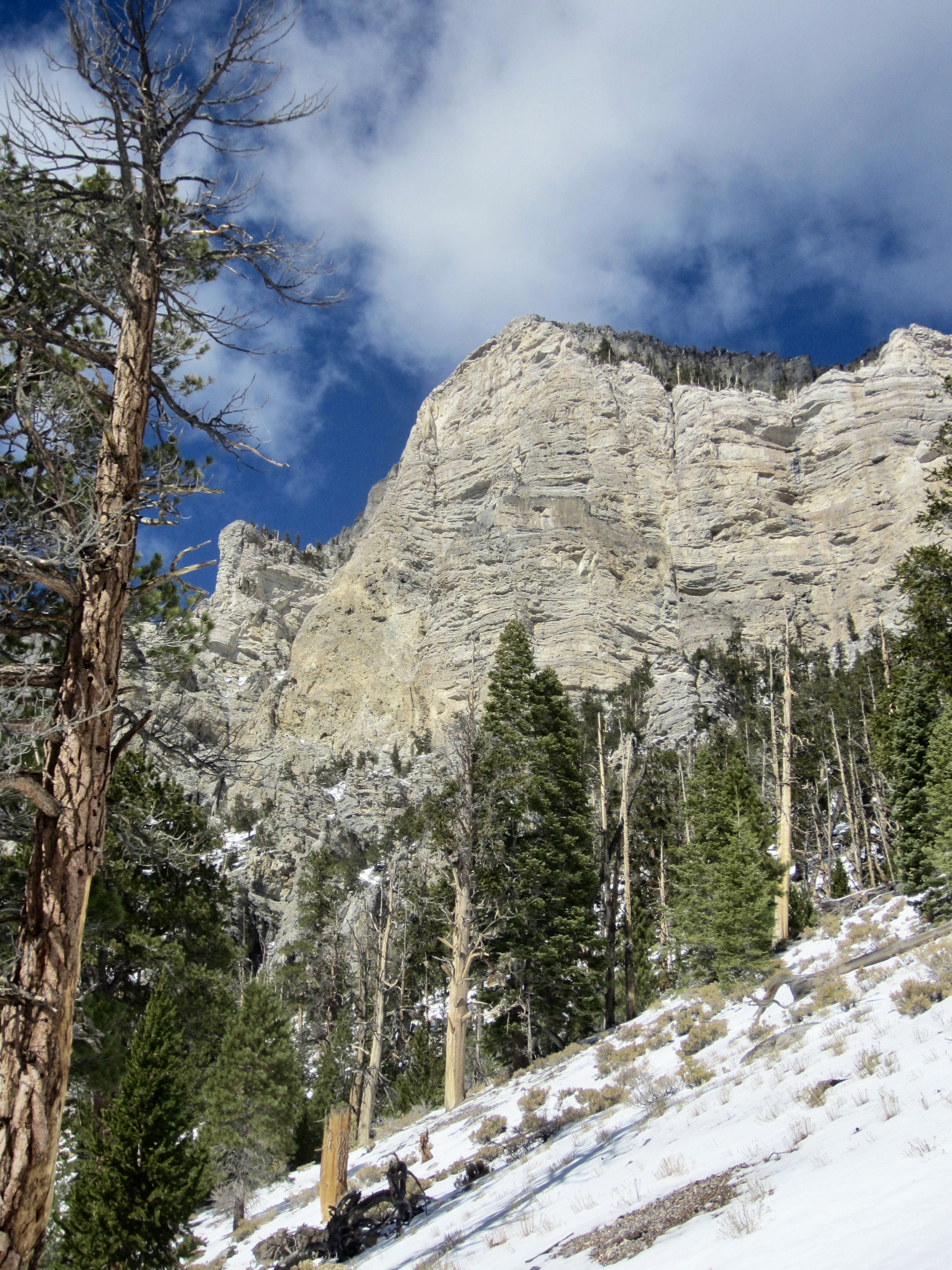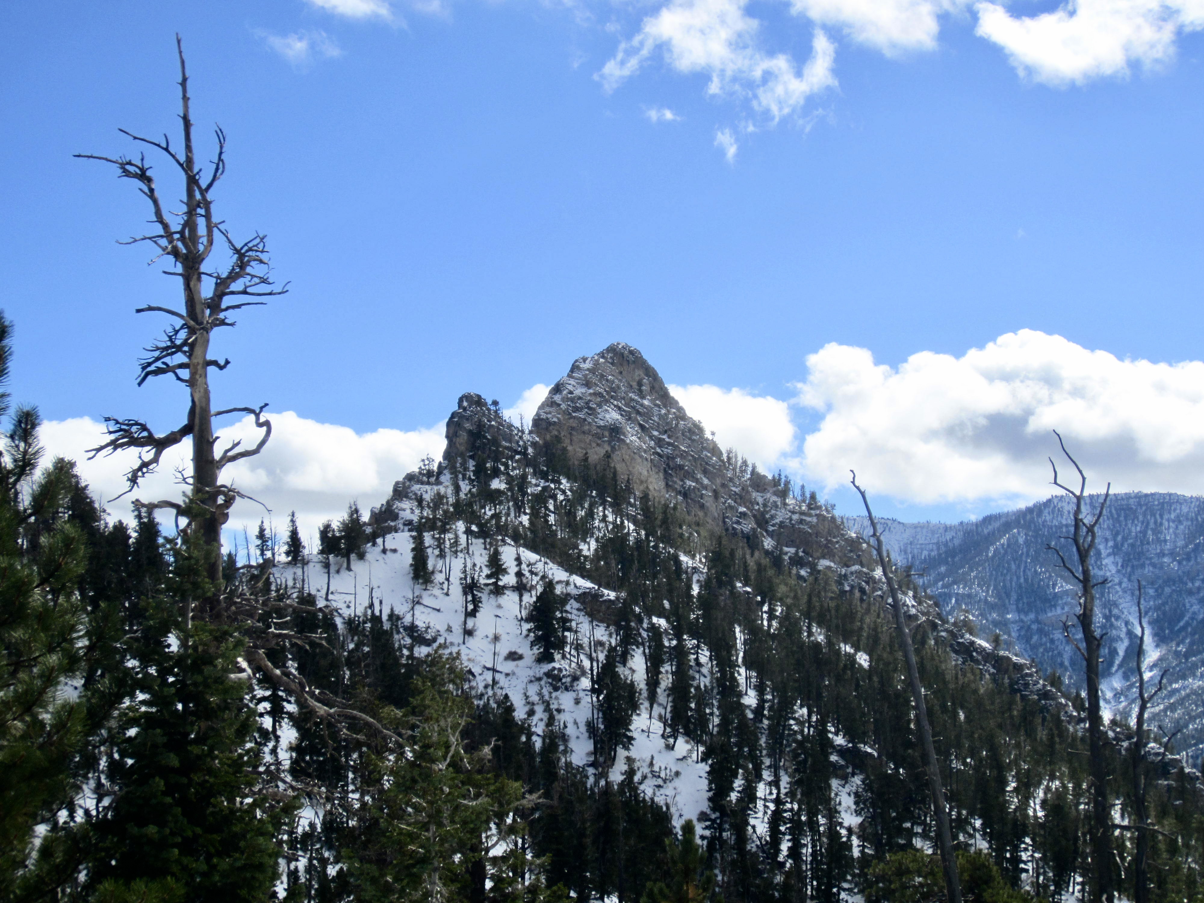 Farther along the trail, I got a clear view of Charleston Peak—with an elevation of nearly 12,000 feet, it is the highest point of the Mt. Charleston massif and the Spring Mountains. For me, the snow-capped summit, horizontal bedding, and snow-filled gullies represented an irresistible goal for another day. Mummy Pass was now visible in the foreground below.