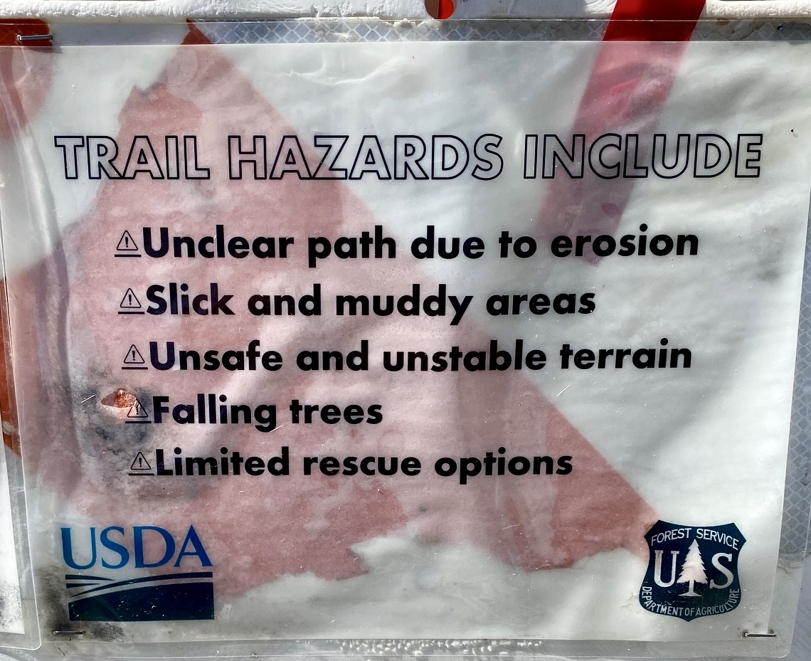 Upon reaching the Trail Canyon Trailhead, Eileen showed me the warning sign—a small sheet of paper attached to a temporary barricade. It listed five hazards, including an unclear path with slick and muddy areas and unstable terrain with falling trees. We both had to laugh, because none of these hazards even remotely described the current trail conditions!