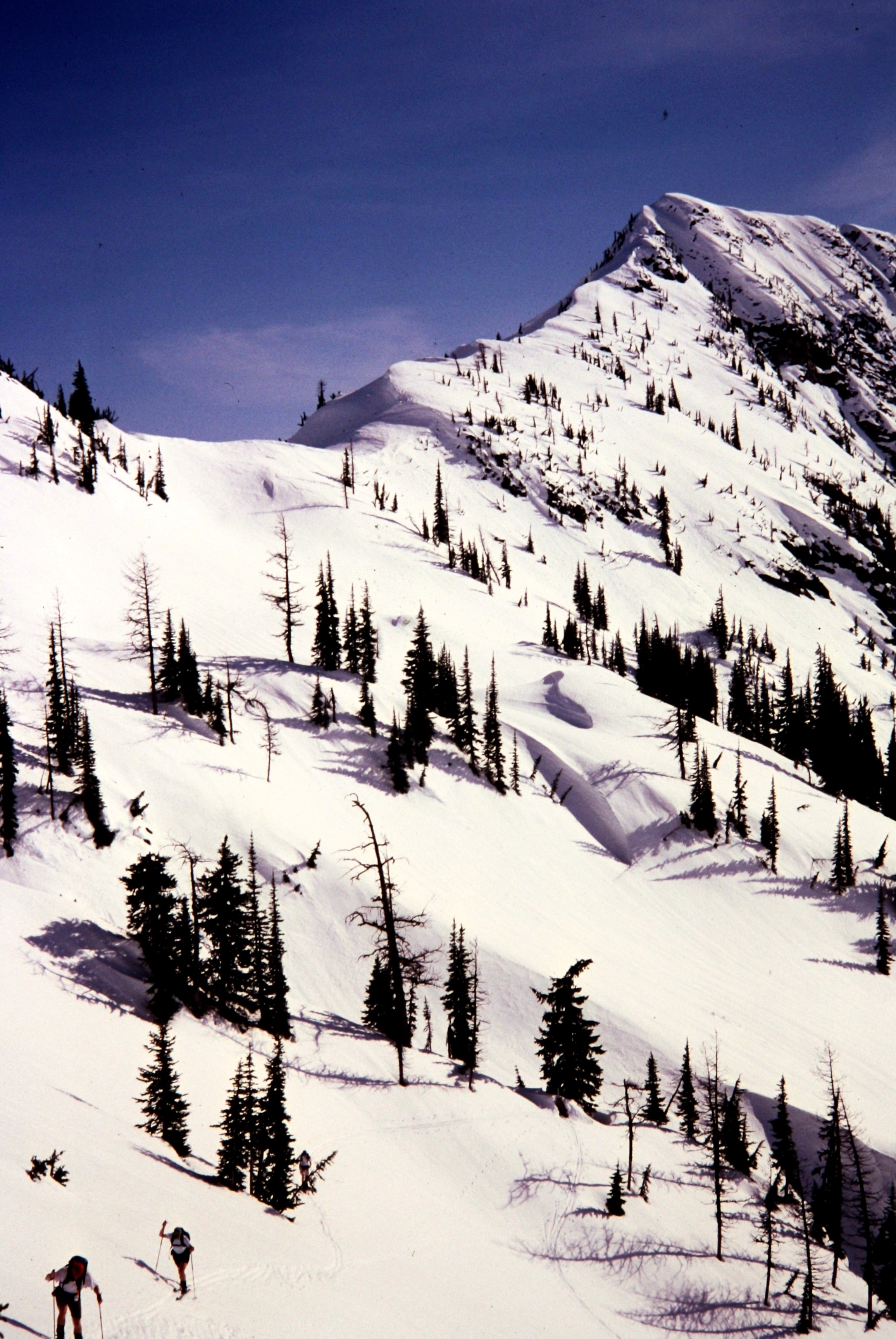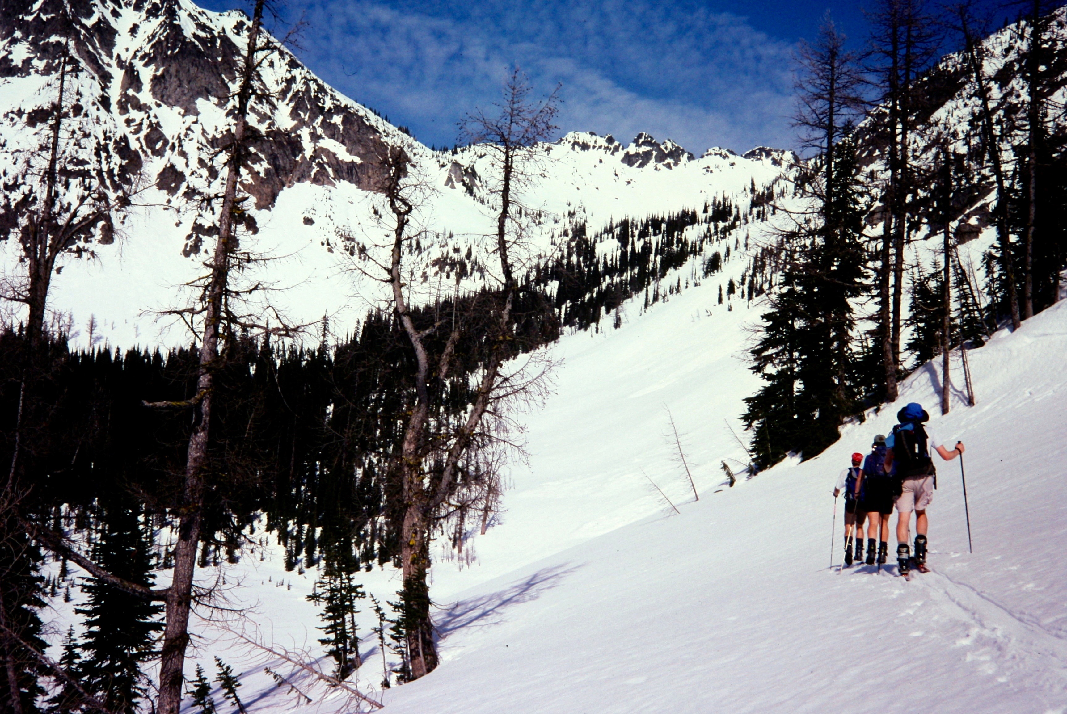 Next, we gradually descended open forest to Bridge Creek and followed its southward curve to near Copper Creek. At 4200 feet, we crossed Bridge Creek on a snow bridge (1.7 hours from Rainy Pass), applied skins, and headed up along the north bank of Copper Creek. Or, I should say, what I thought was Copper Creek. After 10 minutes of climbing, I realized that I had been suckered up State Creek instead. A check of map and compass, together with some group head-scratching, got us redirected on a southeastward bearing to the correct creek.