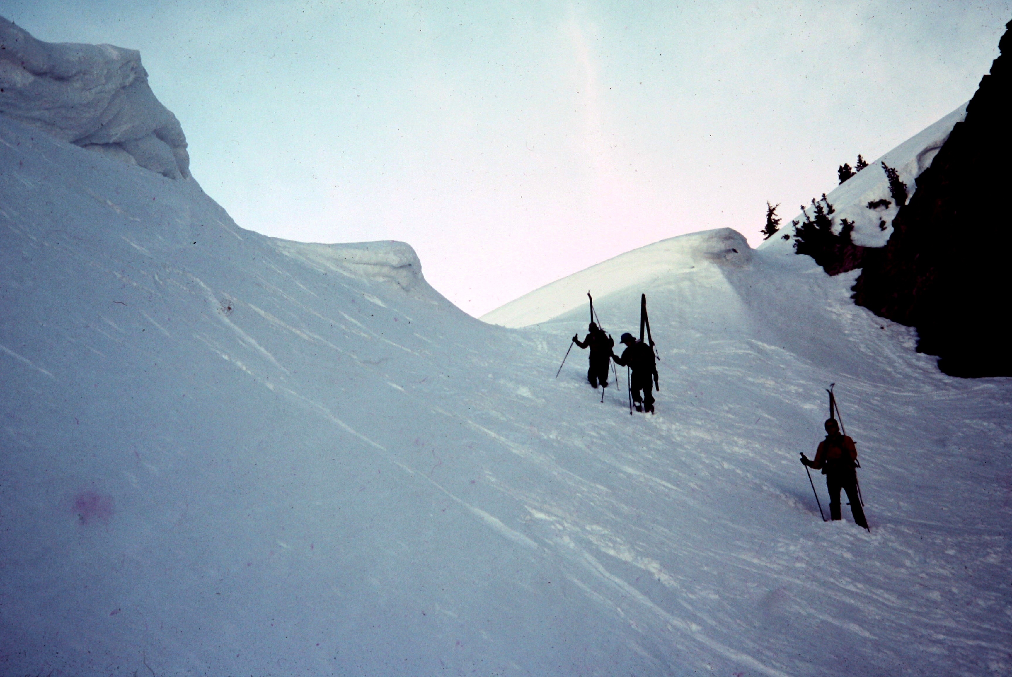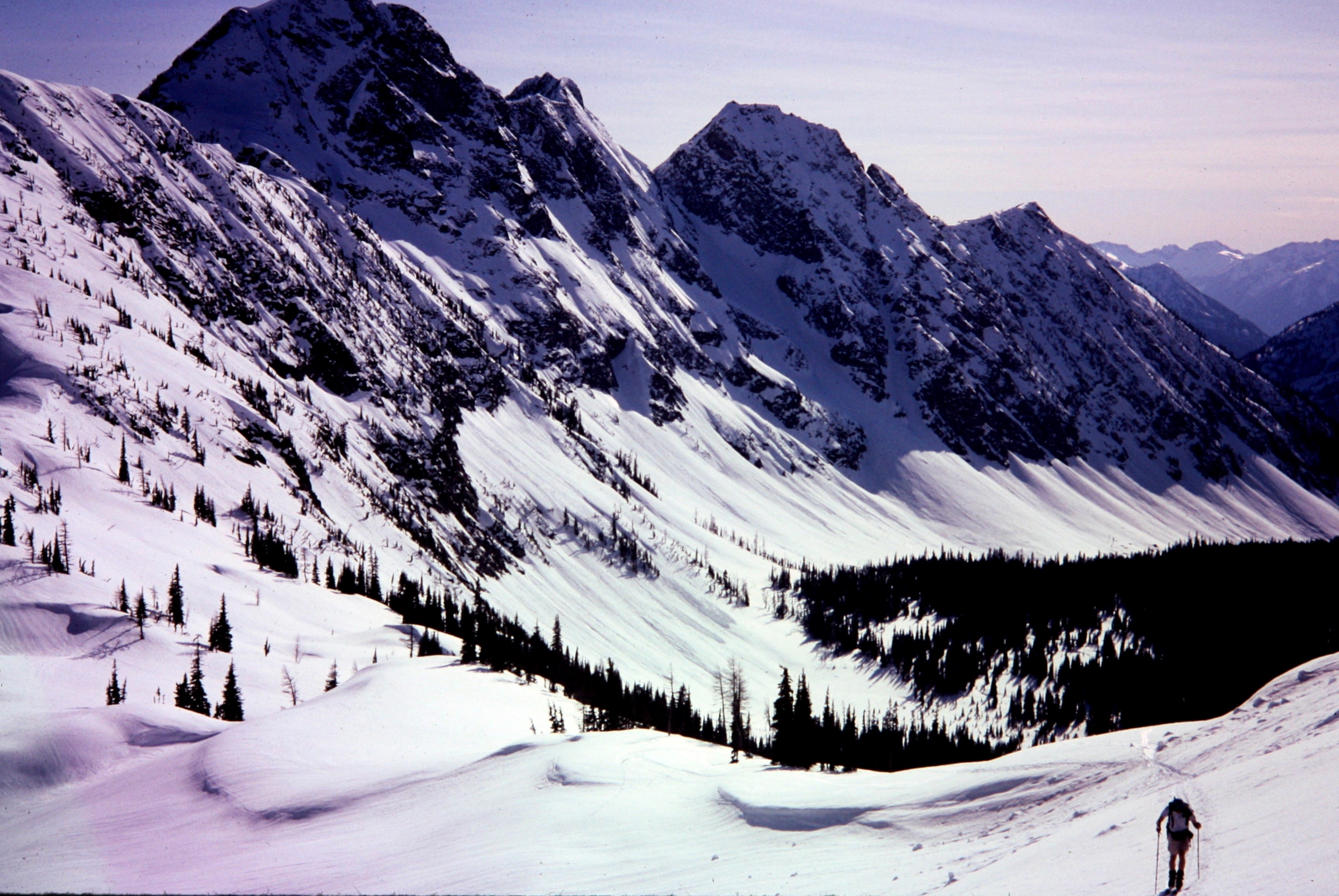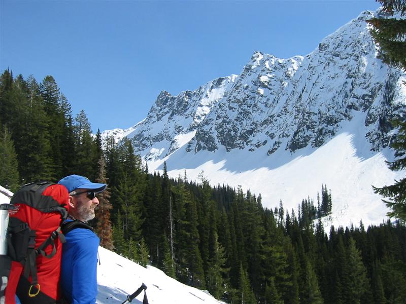 Copper Col gave easy access to a short but moderately steep couloir leading down to the broad slopes of Early Winters Basin. Being on the shady side of the ridge, this couloir was now developing its night-crust, so we all elected to boot down until reaching gentler slopes. I explained to my partners that all real backcountry ski tours invariably have a skis-on-pack component.