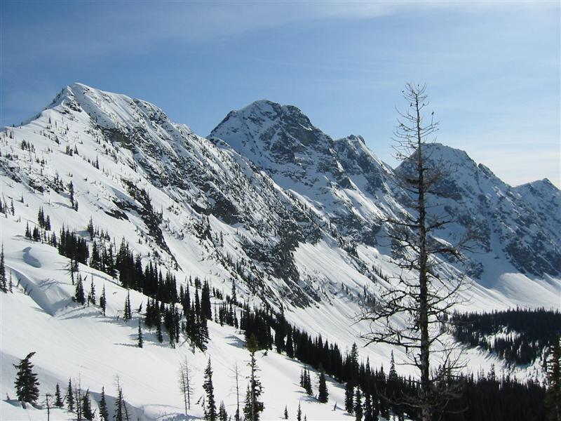 We spent the next hour skinning up unpleasantly steep and dense forest before emerging in a clearing at 5000 feet, with glorious views of Switchblade Peak, Stiletto Peak, Bowan Mountain, and McGregor Mountain.