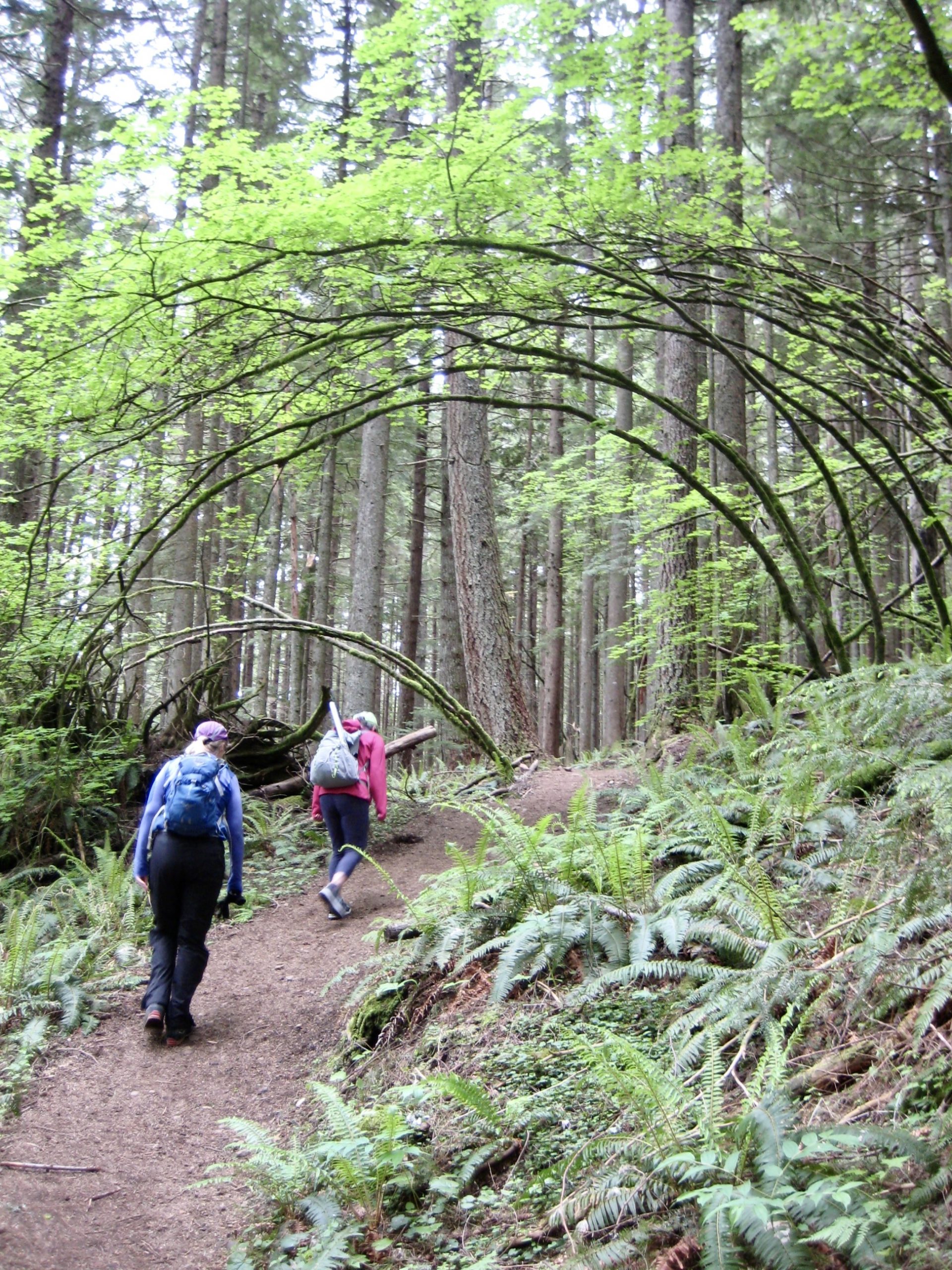 From the mossy road switchback, the RMT proceeds straight ahead, staying closely below the ridge crest and offering one last brief look up at the tall radio tower on East Rattlesnake Peak.  You will then re-enter deep forest and twice more cross the same mossy road.  Gradually, the RMT gradient increases as it drops off the crest of Rattlesnake Mountain.  Other hikers become noticeably more prevalent with increasing distance.