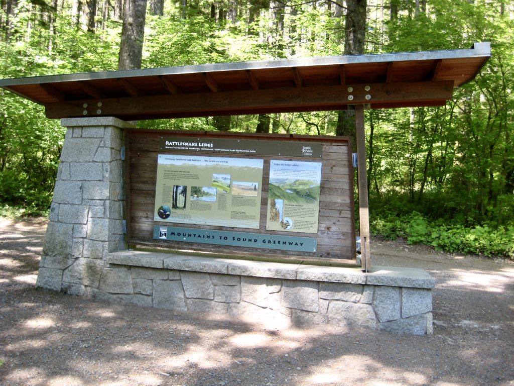 From Lower Rattlesnake Ledge, the RMT descends through dense forest for 2 miles until reaching its official eastern terminus at Rattlesnake Lake, marked by another handsome kiosk.  You will likely see scores of hikers milling about here.  From the kiosk, turn left and walk an additional ¼ mile along a gravel access road that curves around to a gate adjacent to the main parking lot (10.8 miles + 2800 feet from starting point).