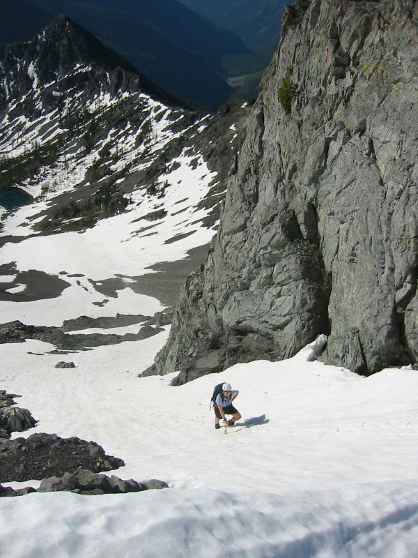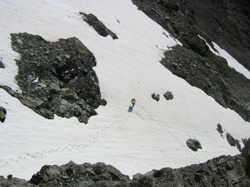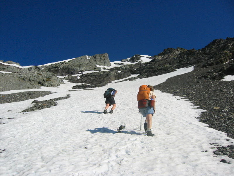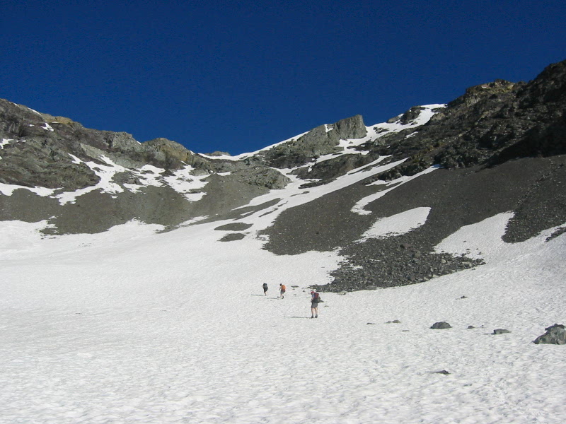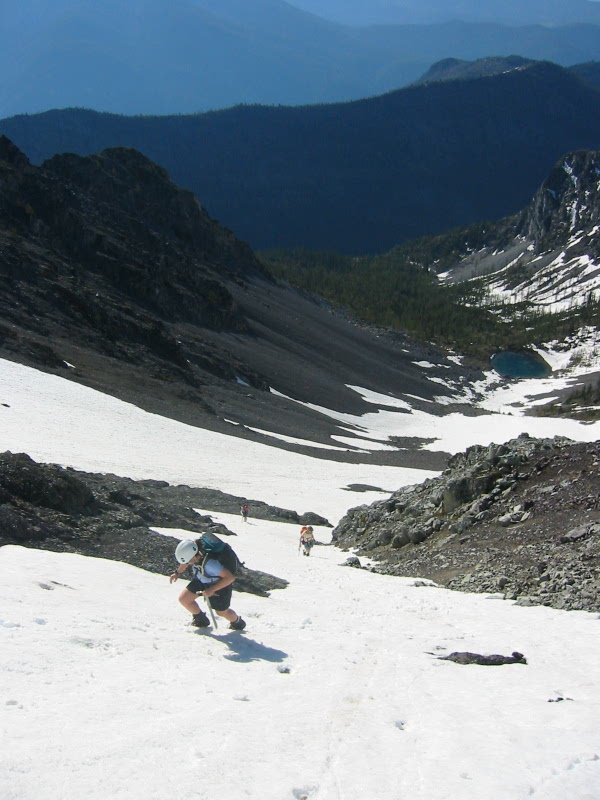 At 6:00am the next morning, we were eating breakfast in the first rays of sun and had already stripped down to shorts and tee-shirts. Obviously, this was going to be another hot day. Shortly after 7:00am, we headed uphill through larch forest, passed the 6700-foot tarn, and continued up steepening snowfields in Robinson’s southern basin.