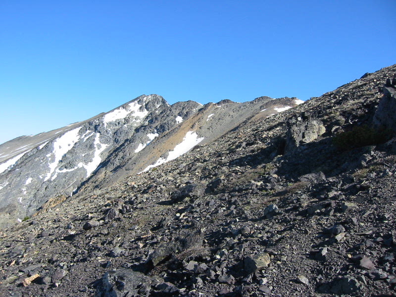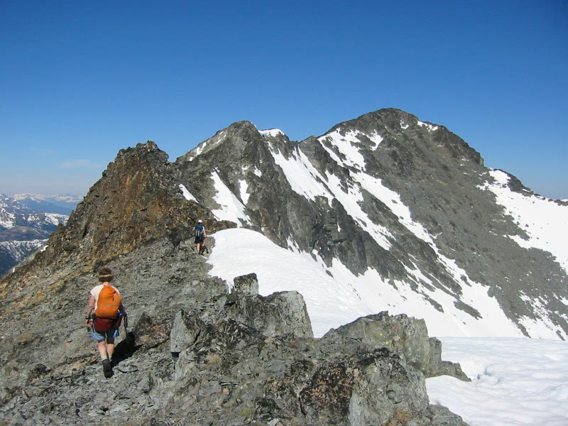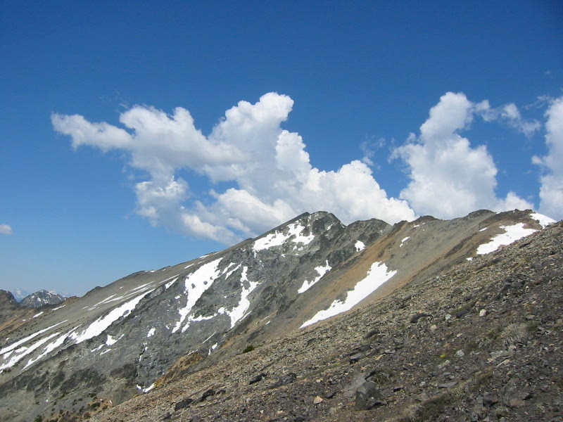 From the 8000-foot notch, Robinson Mountain’s summit looked far away, but the ridge leading over to it seemed pretty straight-forward. We traversed easy talus slopes upward to a saddle, then followed the ridge crest until coming to a col with a steep horn on the other side.