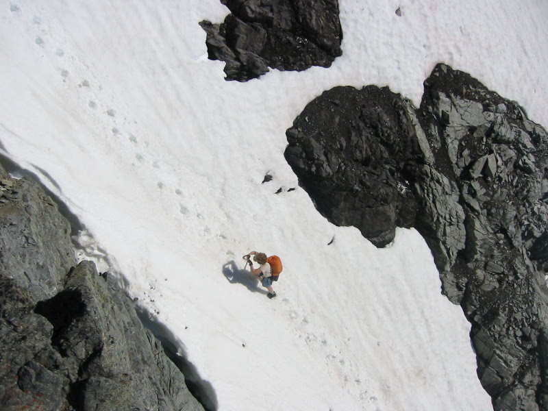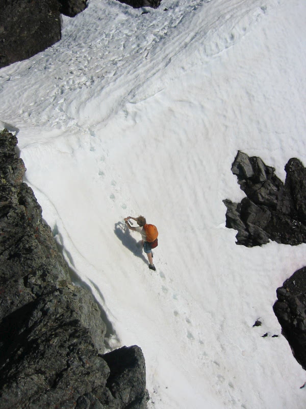 Unfortunately, Janet was feeling a bit out of kilter and decided to turn back below the notch. Beth graciously assisted her down to the lower snowfields, then climbed up again to join Suzanne and me at the notch.