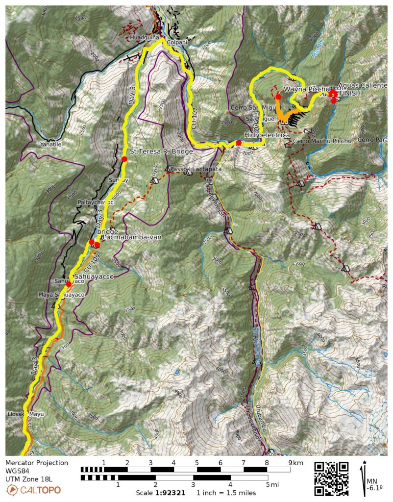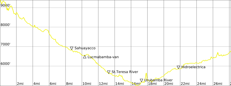Way Points: Inca Canal & Soraypampa & Salkantaypampa & The Seven Snakes & Soiroccocha & Salkantay Pass & Huayracmachay & Chaullay & St. Teresa River Bridge & Sahuayacco & Lucmabamba (trail hike);  St. Teresa River Bridge & Hidroelectrica (van ride);  Urubamba River Railroad Bridge & Aguas Calientes (railroad walk);  Ollantaytambo (train ride)