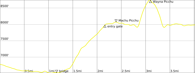 Everyone met in the hotel lobby at 4:00am, prepared for a full morning at Machu Picchu.  Brooke, Clara, and I headed out on foot, walking through the dark town and an additional mile down to the lower gate.  When the gate opened at 5:00am, we started up the stairway trail, along with several dozen other headlamp-clad hikers.  The early morning was comfortably cool, and the many hundreds of stone steps quickly passed under our sneakers.  We reached the entry gate at the top of the stairs scant minutes before 6:00am (1.7 hours + 1400 feet from hotel).