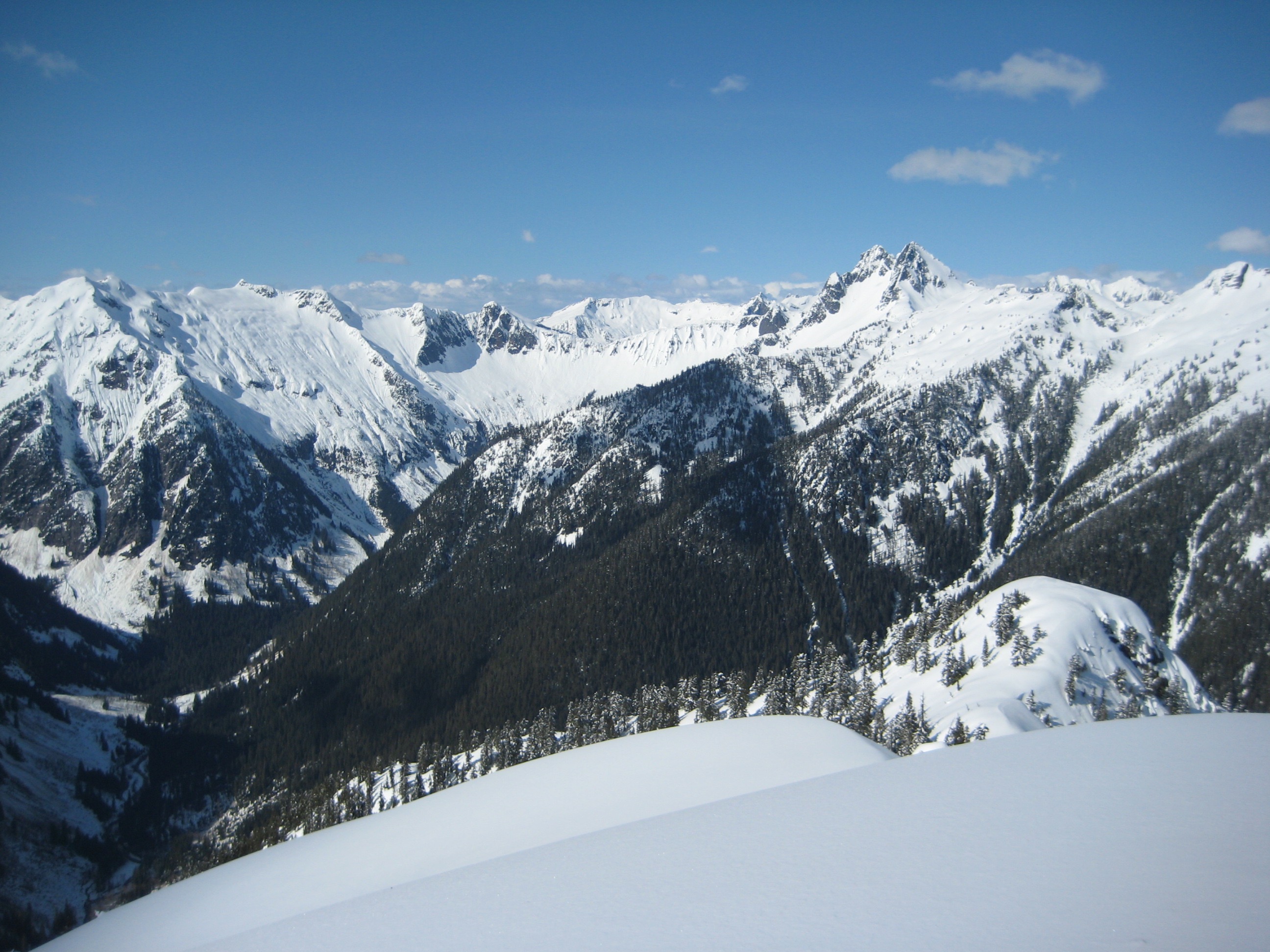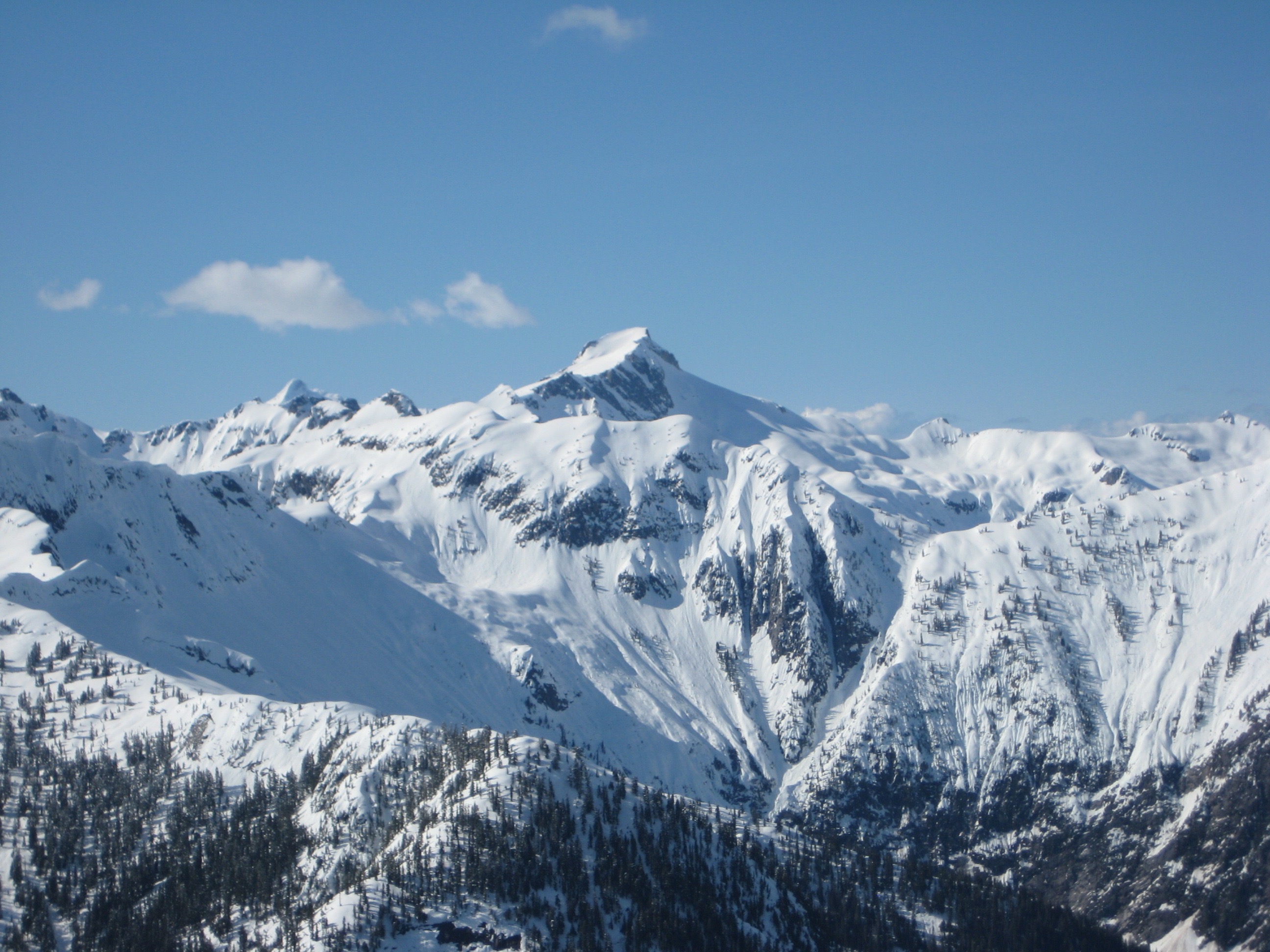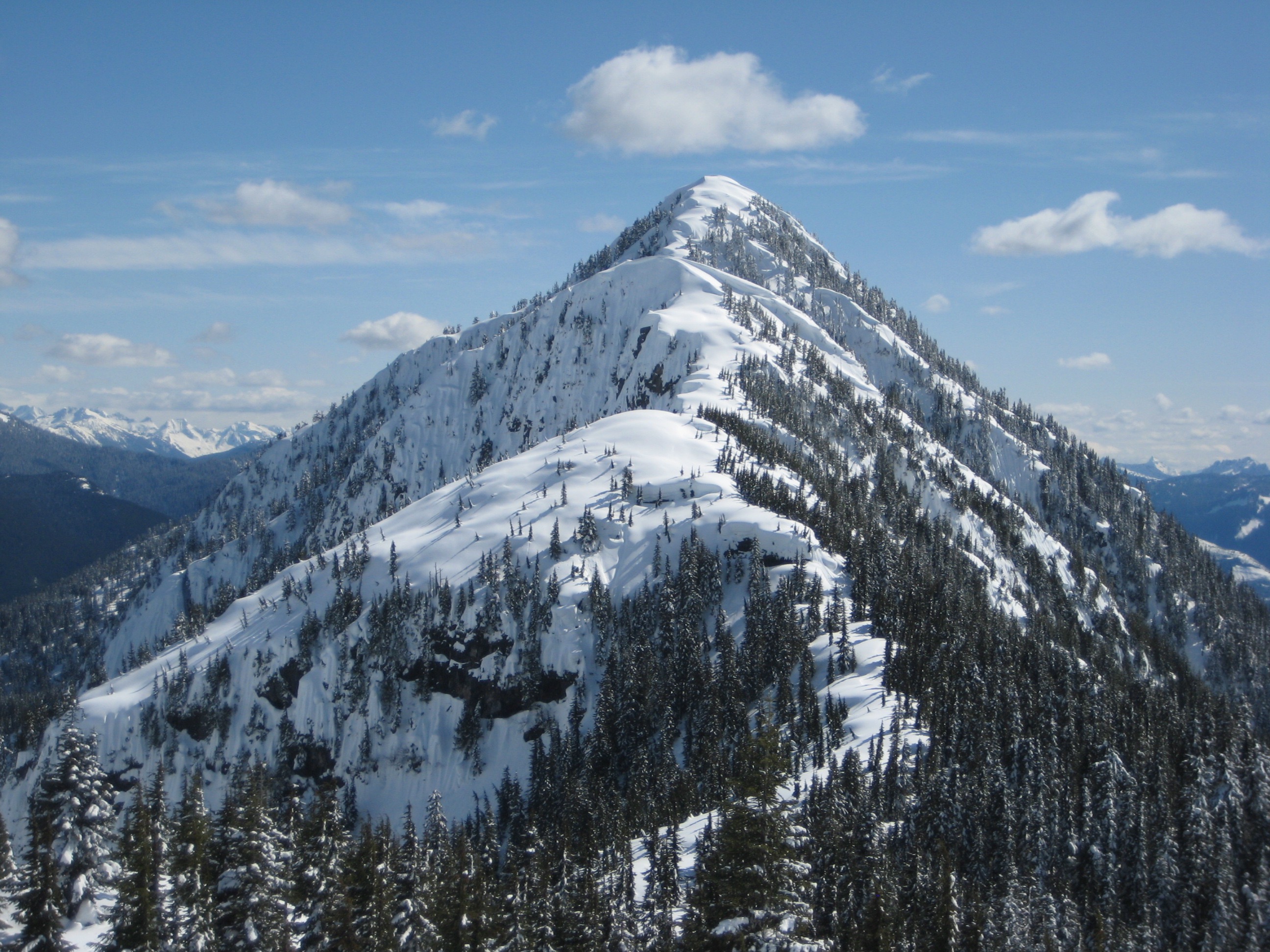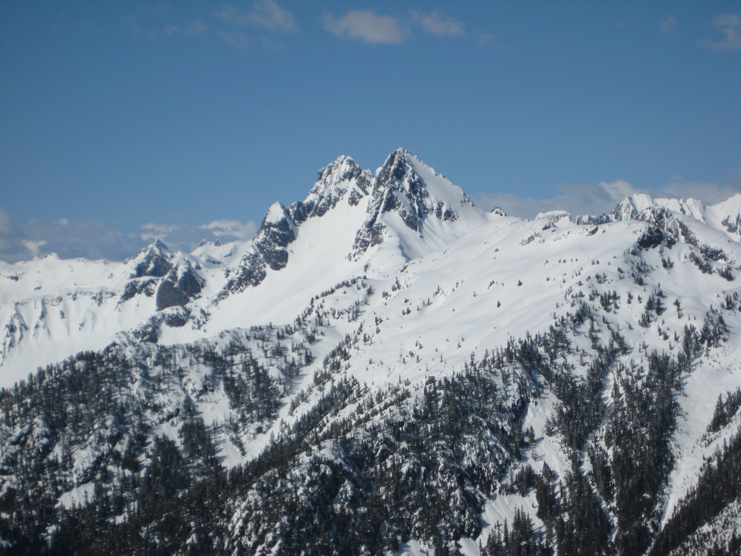 From our cars, we walked up the spur road, crossed Jumbo Creek, and ascended steep but open forest eastward until encountering snow at 2200 feet. We donned snowshoes and climbed to the ridge crest at the saddle between Salvation Peak and Oakes Peak, then made an undulating traverse along the crest to gain the summit (6.2 hours from car). Views were marvelous and totally dominated by nearby Mt. Triumph.