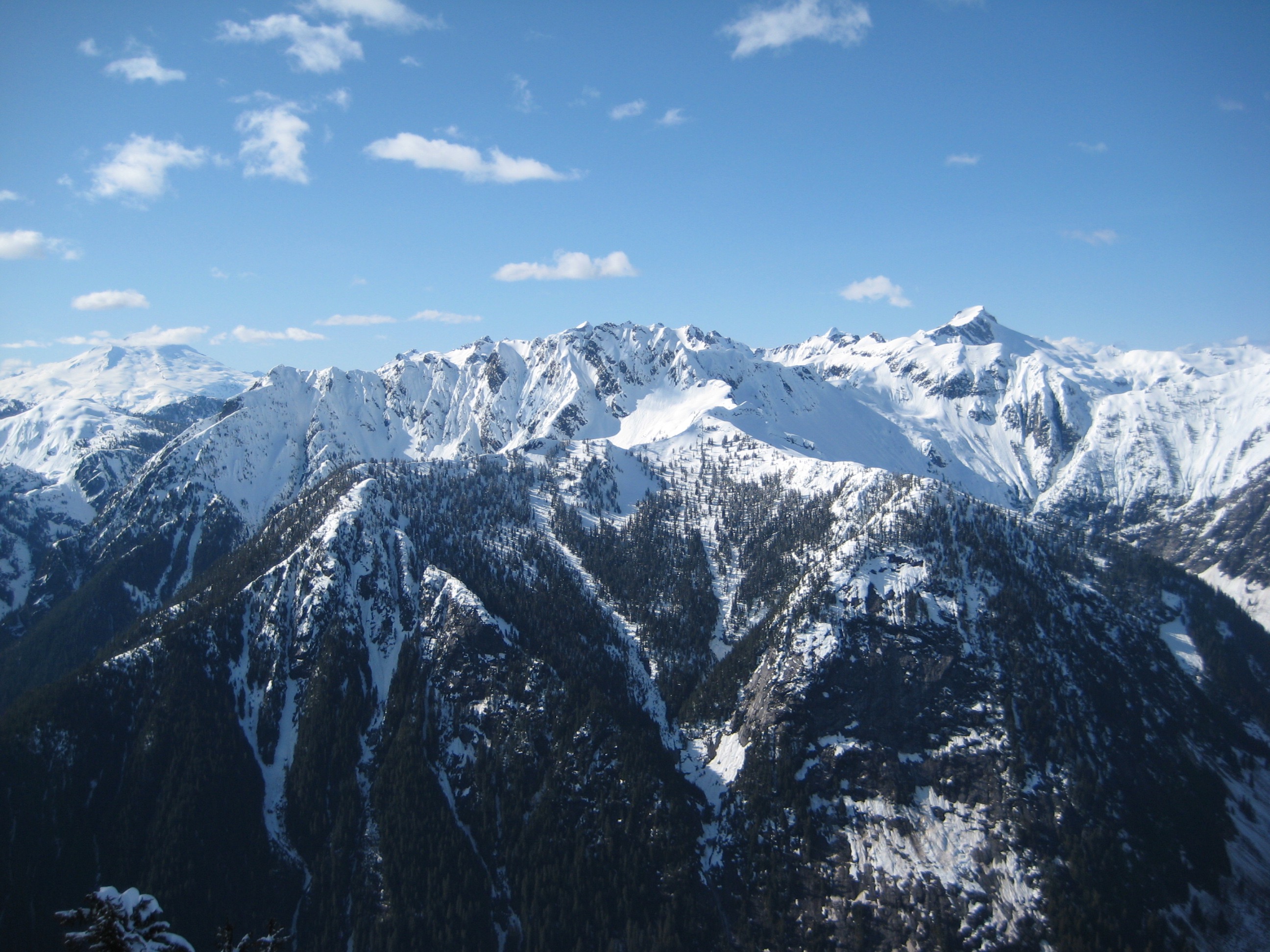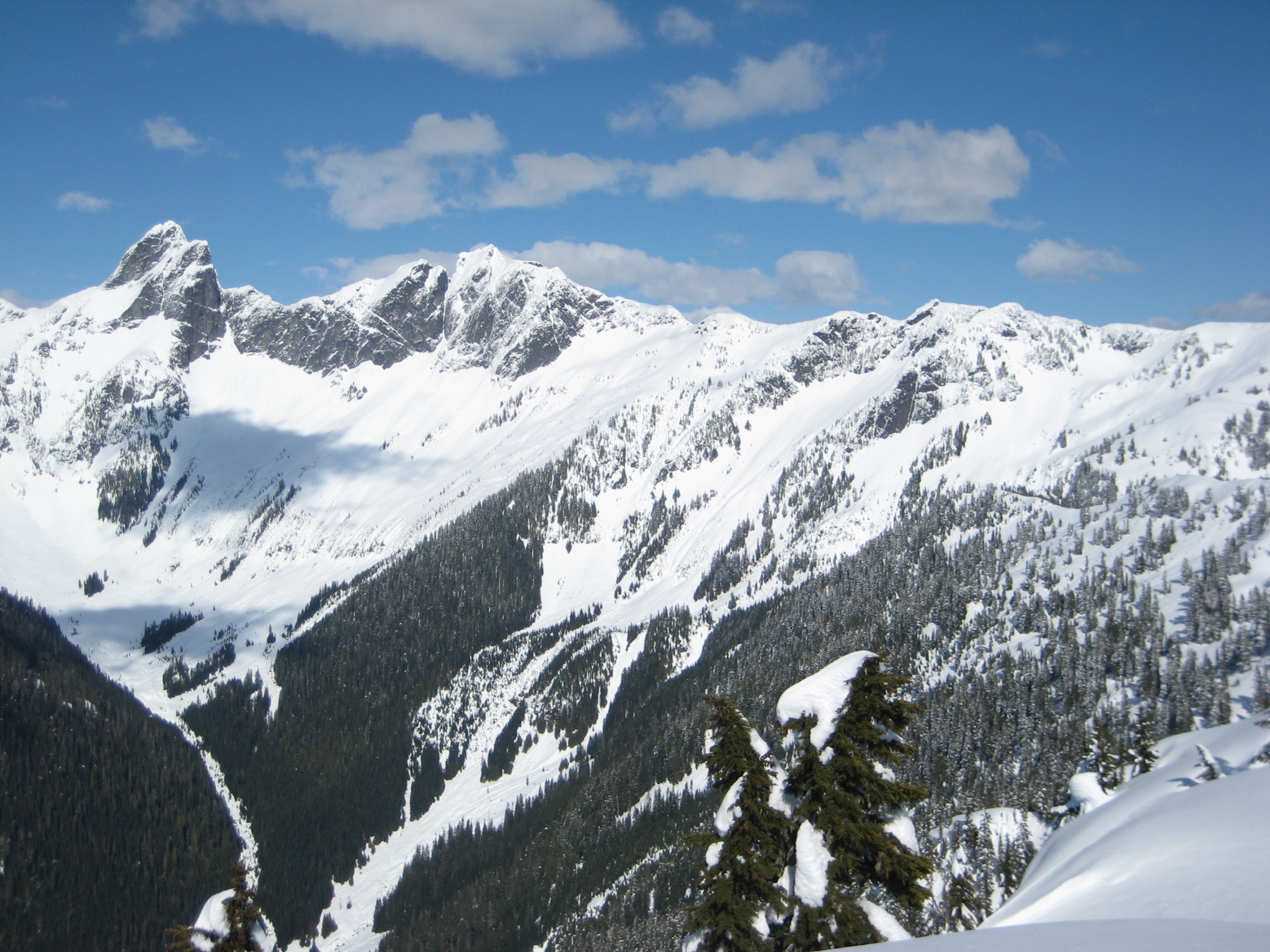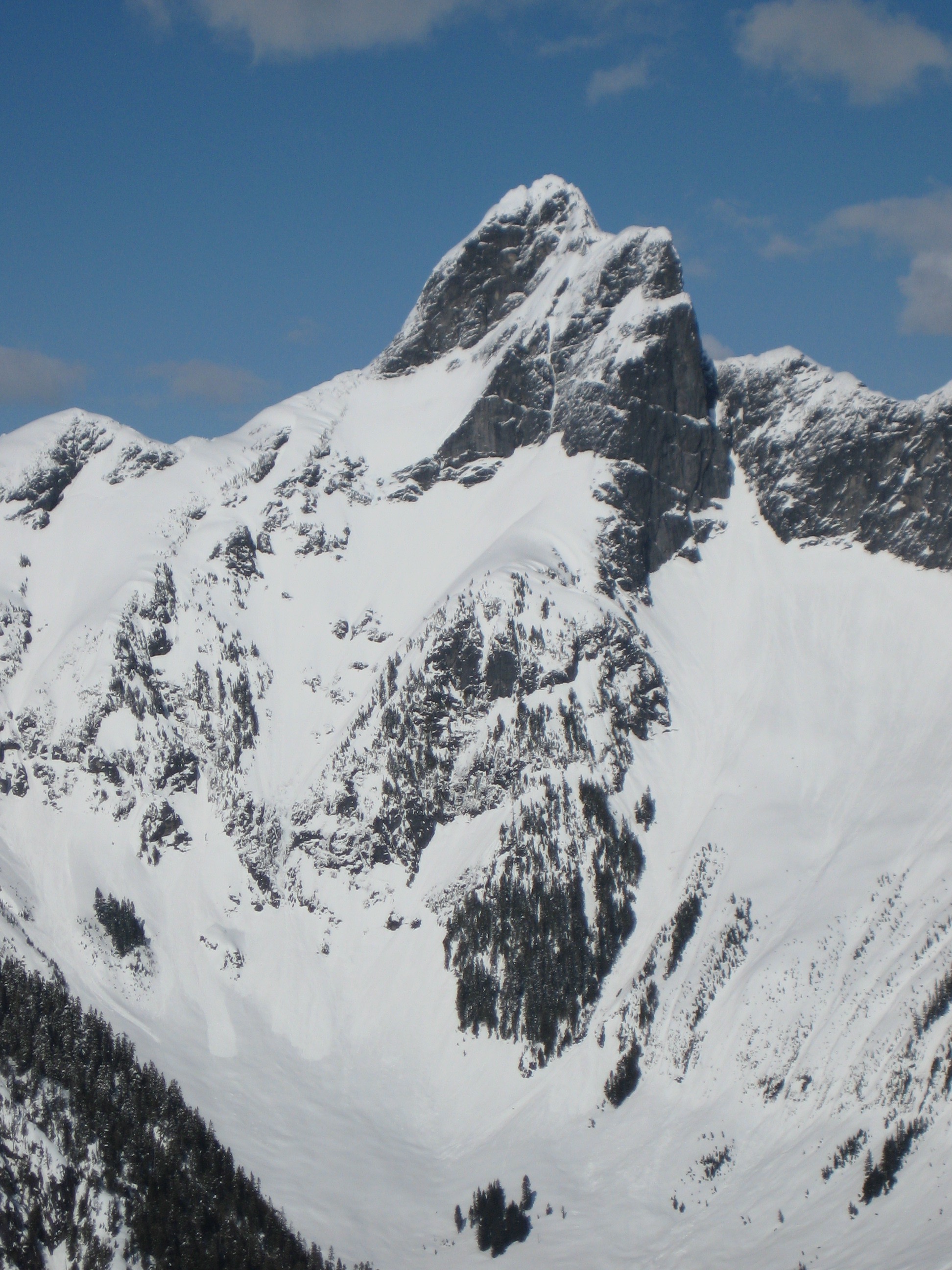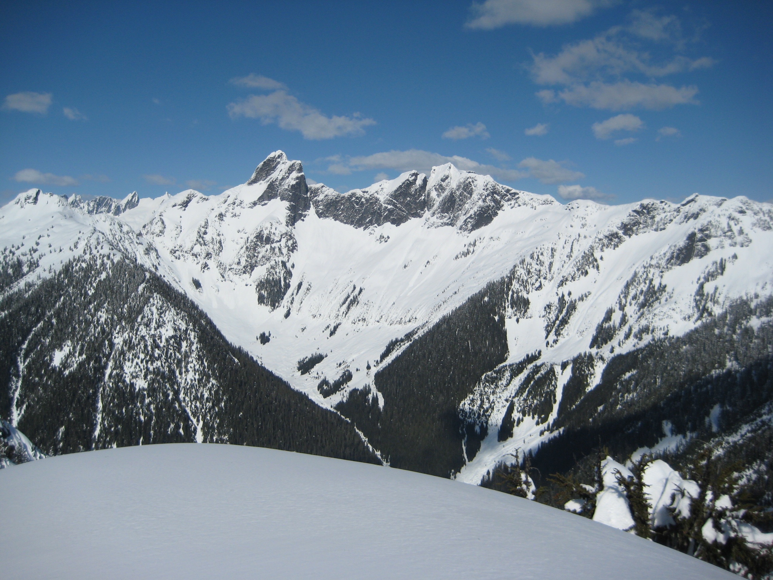 From our cars, we walked up the spur road, crossed Jumbo Creek, and ascended steep but open forest eastward until encountering snow at 2200 feet. We donned snowshoes and climbed to the ridge crest at the saddle between Salvation Peak and Oakes Peak, then made an undulating traverse along the crest to gain the summit (6.2 hours from car). Views were marvelous and totally dominated by nearby Mt. Triumph.