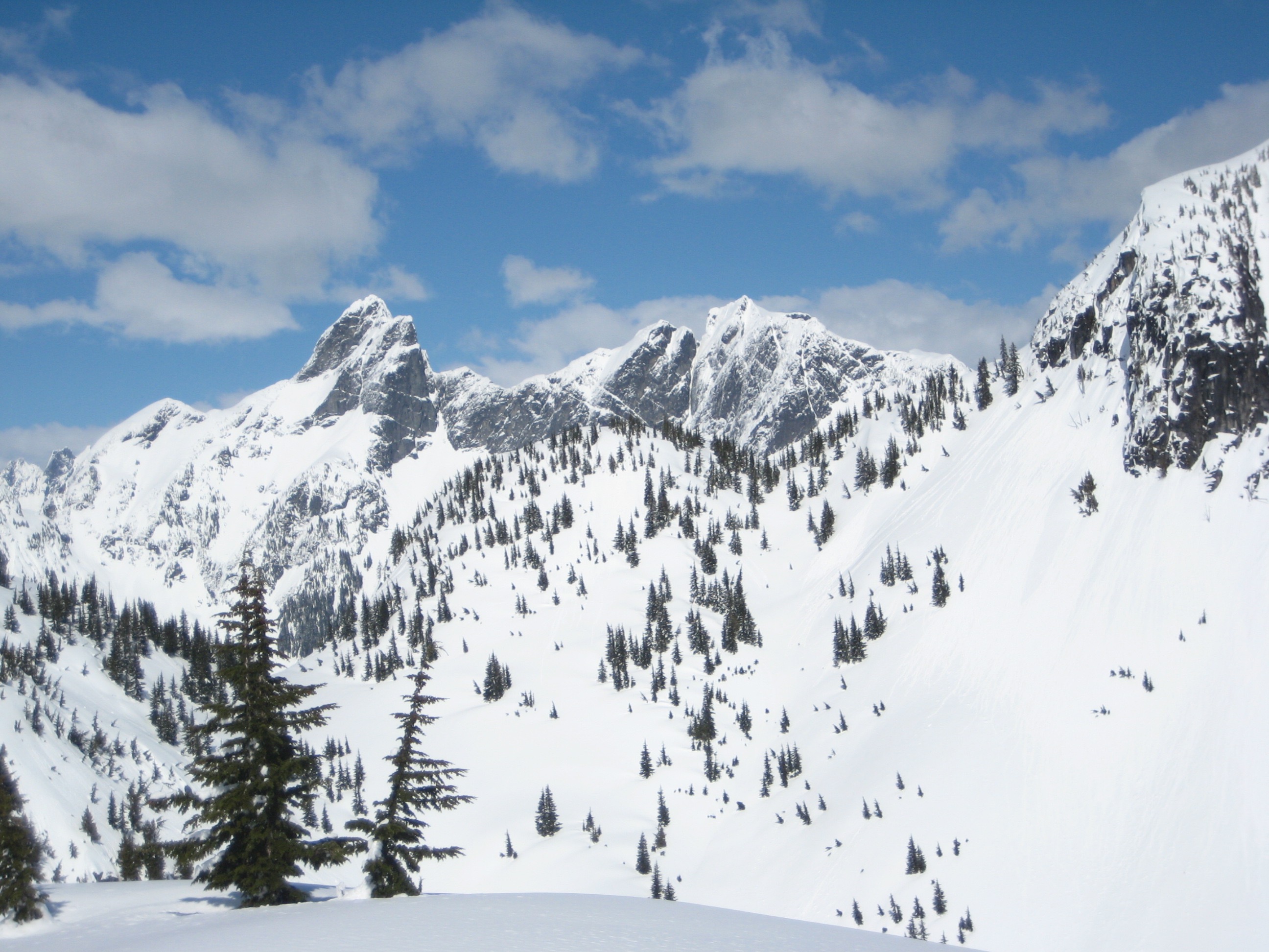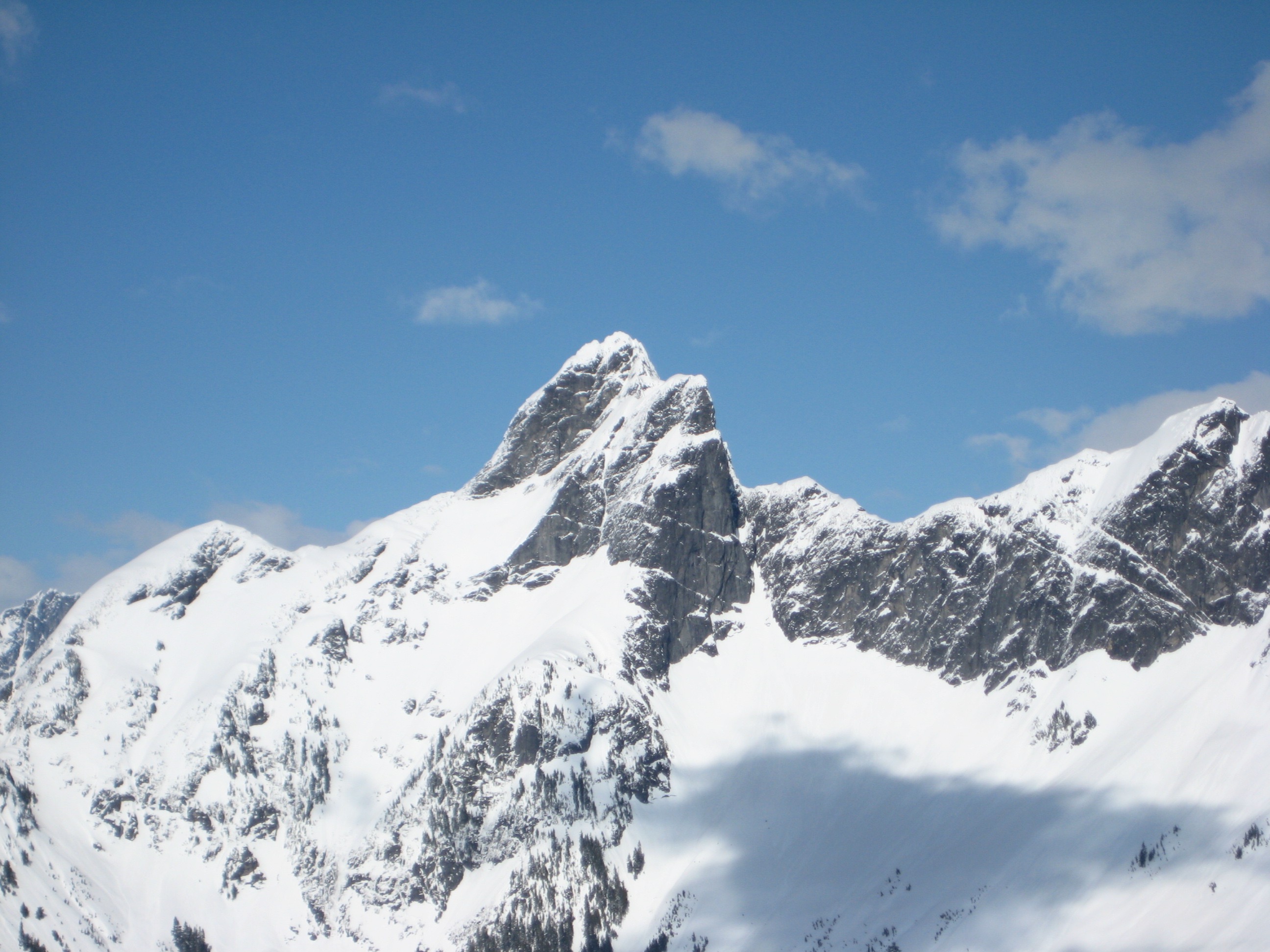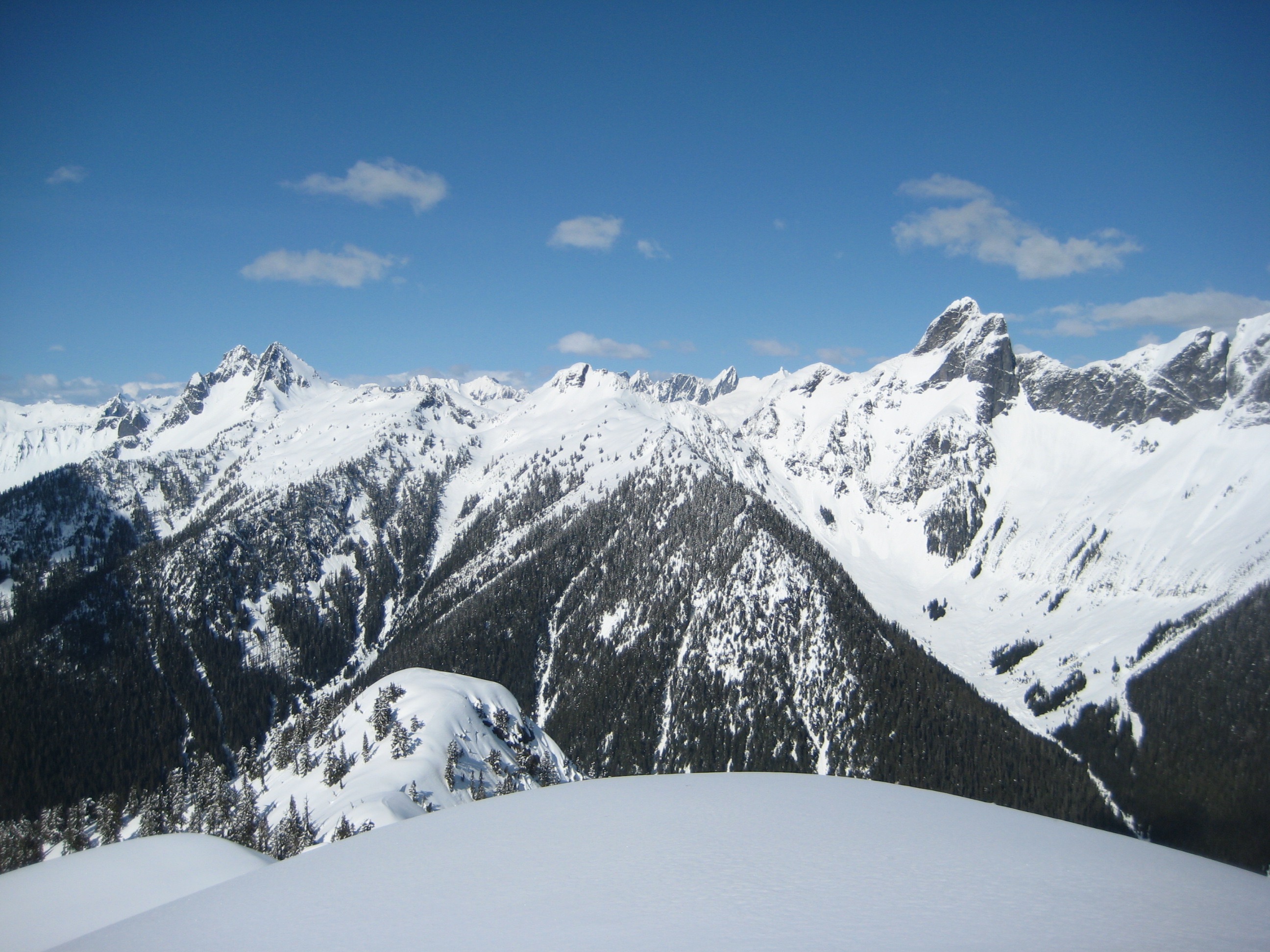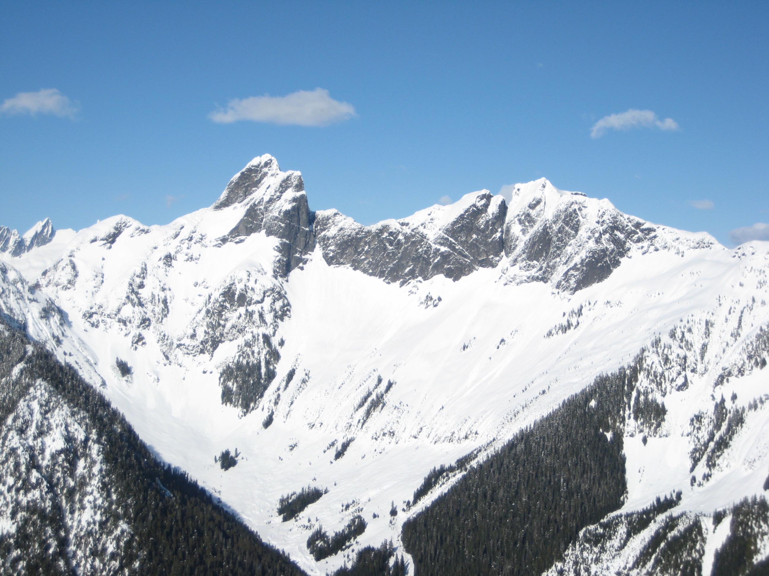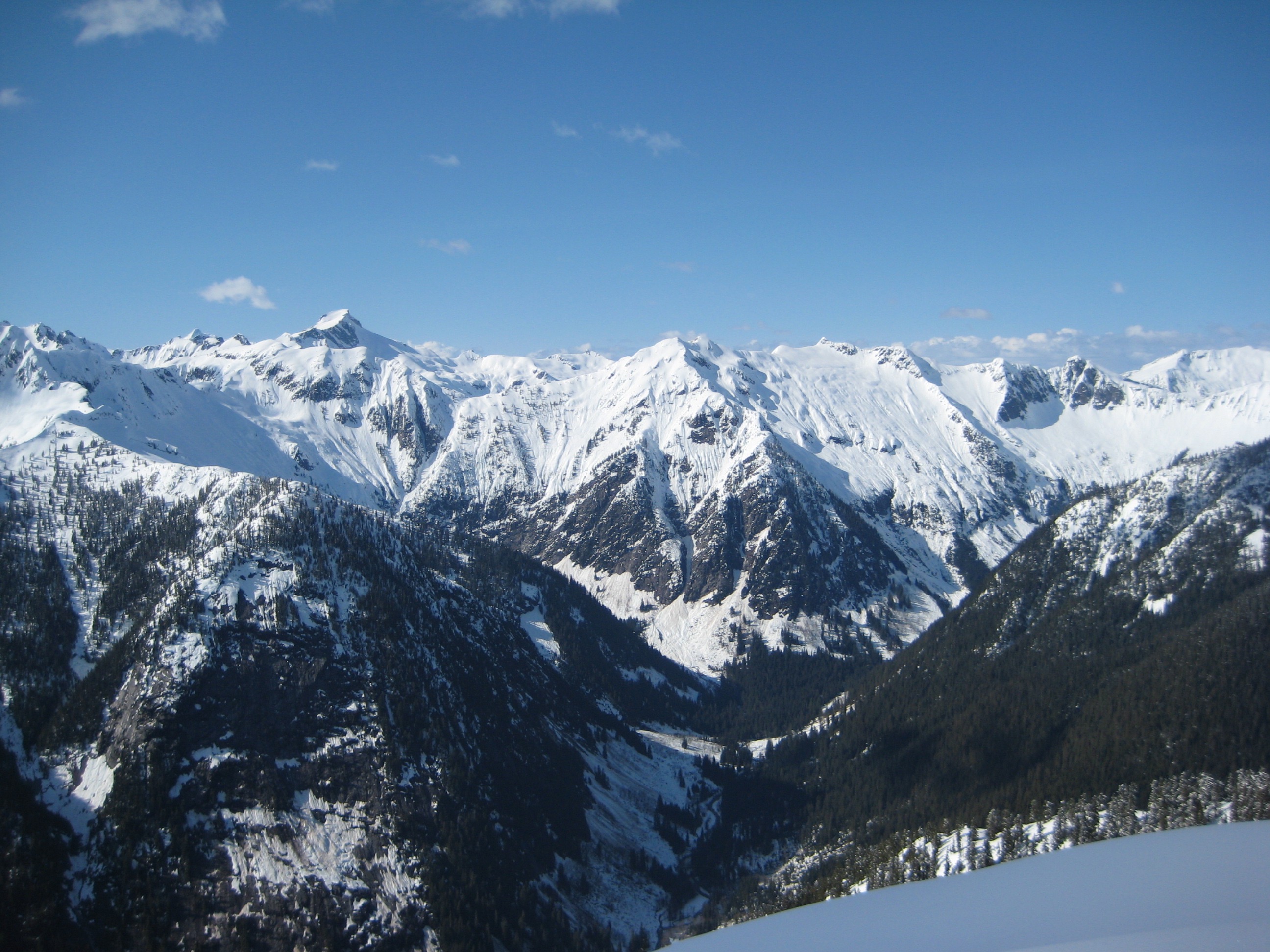 From our cars, we walked up the spur road, crossed Jumbo Creek, and ascended steep but open forest eastward until encountering snow at 2200 feet. We donned snowshoes and climbed to the ridge crest at the saddle between Salvation Peak and Oakes Peak, then made an undulating traverse along the crest to gain the summit (6.2 hours from car). Views were marvelous and totally dominated by nearby Mt. Triumph.