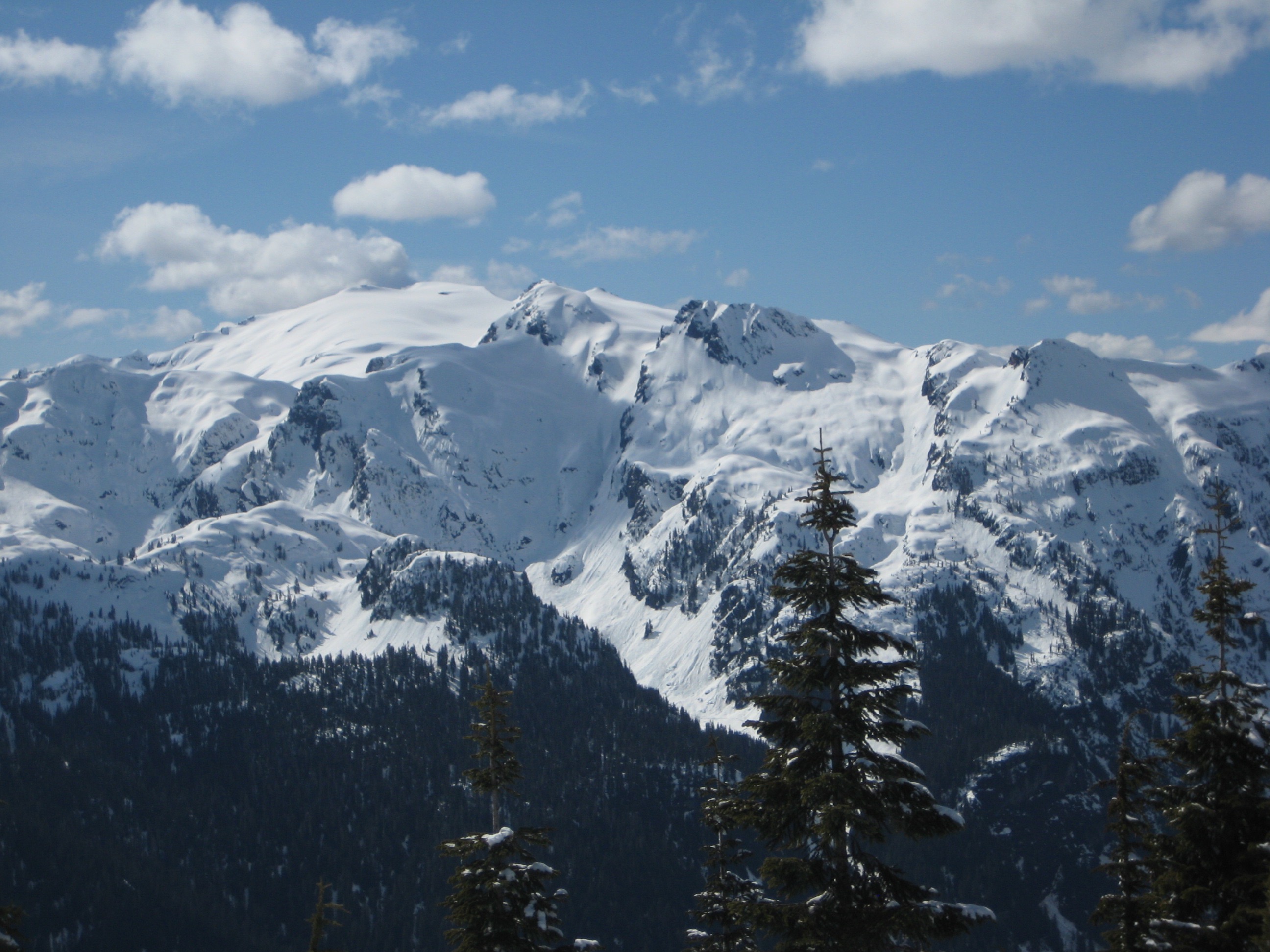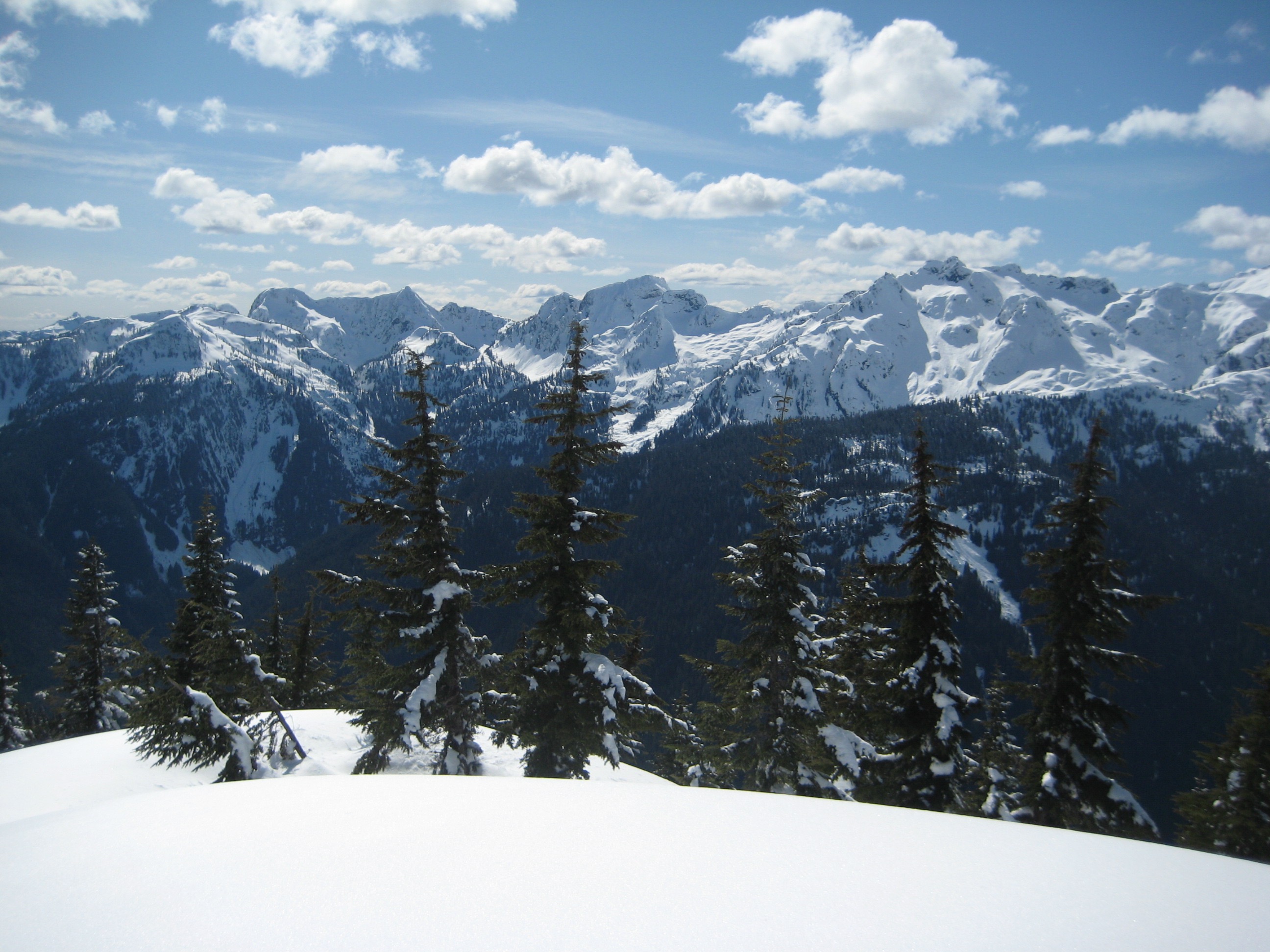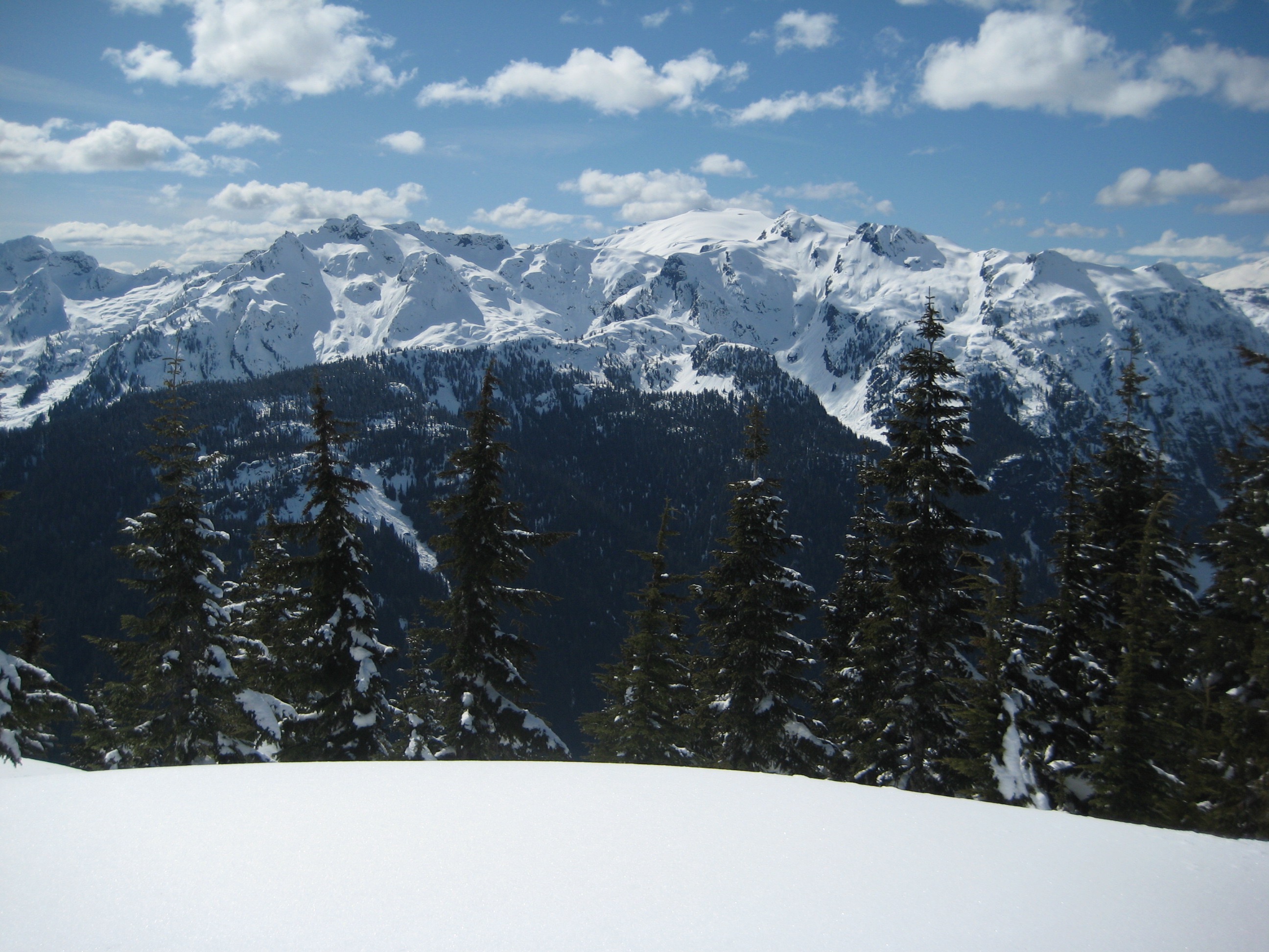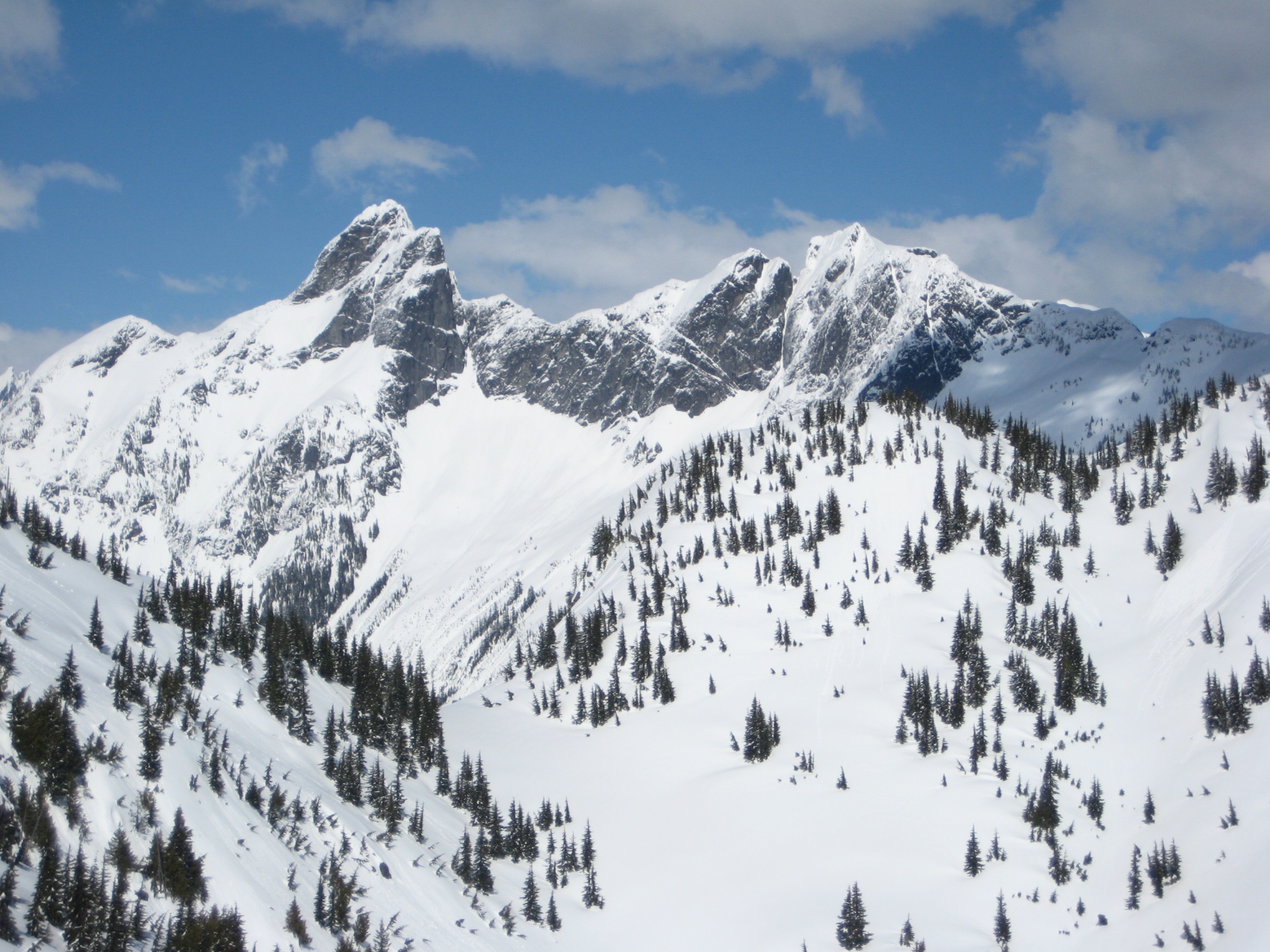 From our cars, we walked up the spur road, crossed Jumbo Creek, and ascended steep but open forest eastward until encountering snow at 2200 feet. We donned snowshoes and climbed to the ridge crest at the saddle between Salvation Peak and Oakes Peak, then made an undulating traverse along the crest to gain the summit (6.2 hours from car). Views were marvelous and totally dominated by nearby Mt. Triumph.