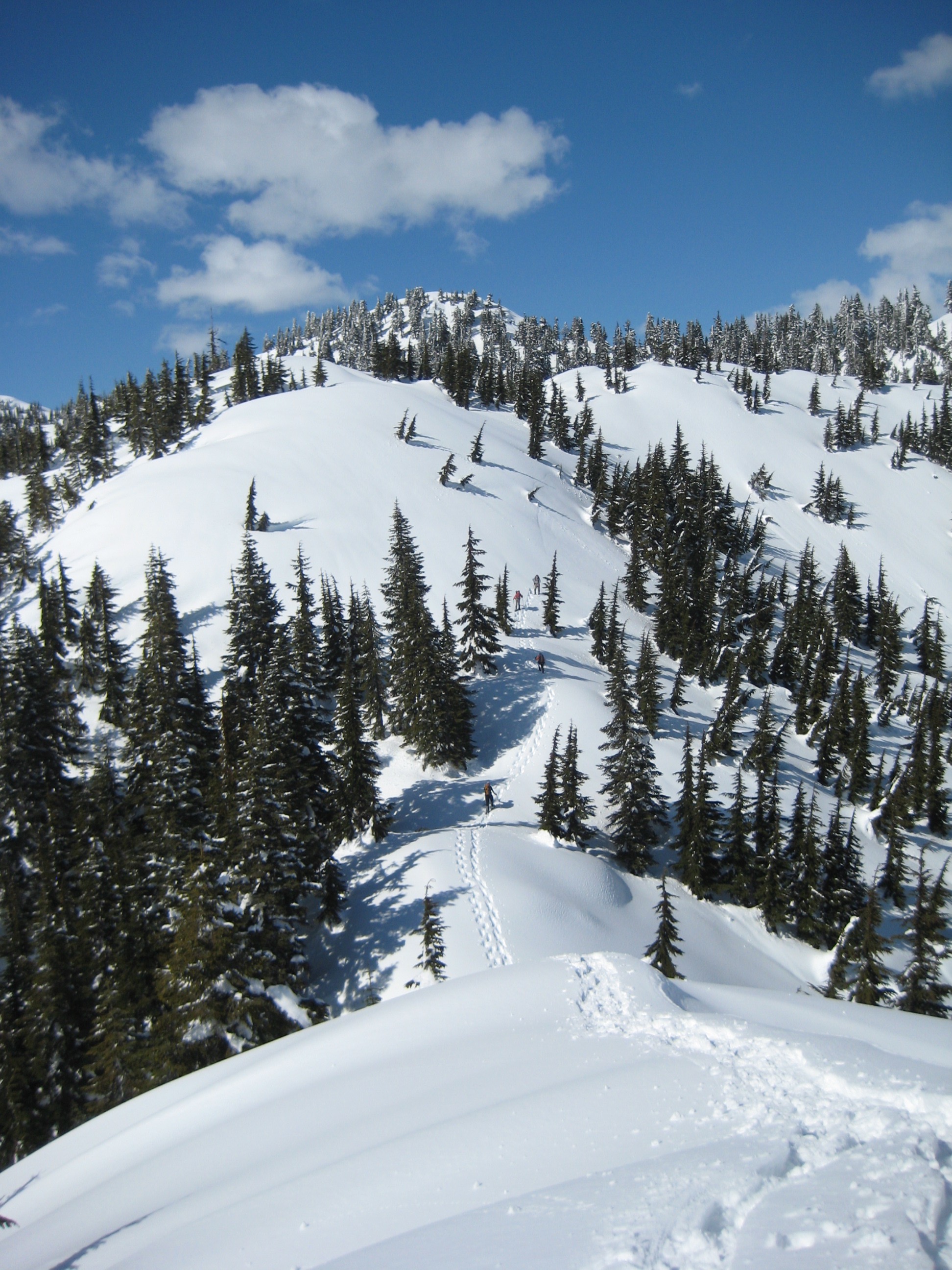 For our return, we followed our tracks back along the ridge crest and down the forest slope, using headlamps for the last couple hours, and arriving at our cars in early evening (4.2 hours from summit).