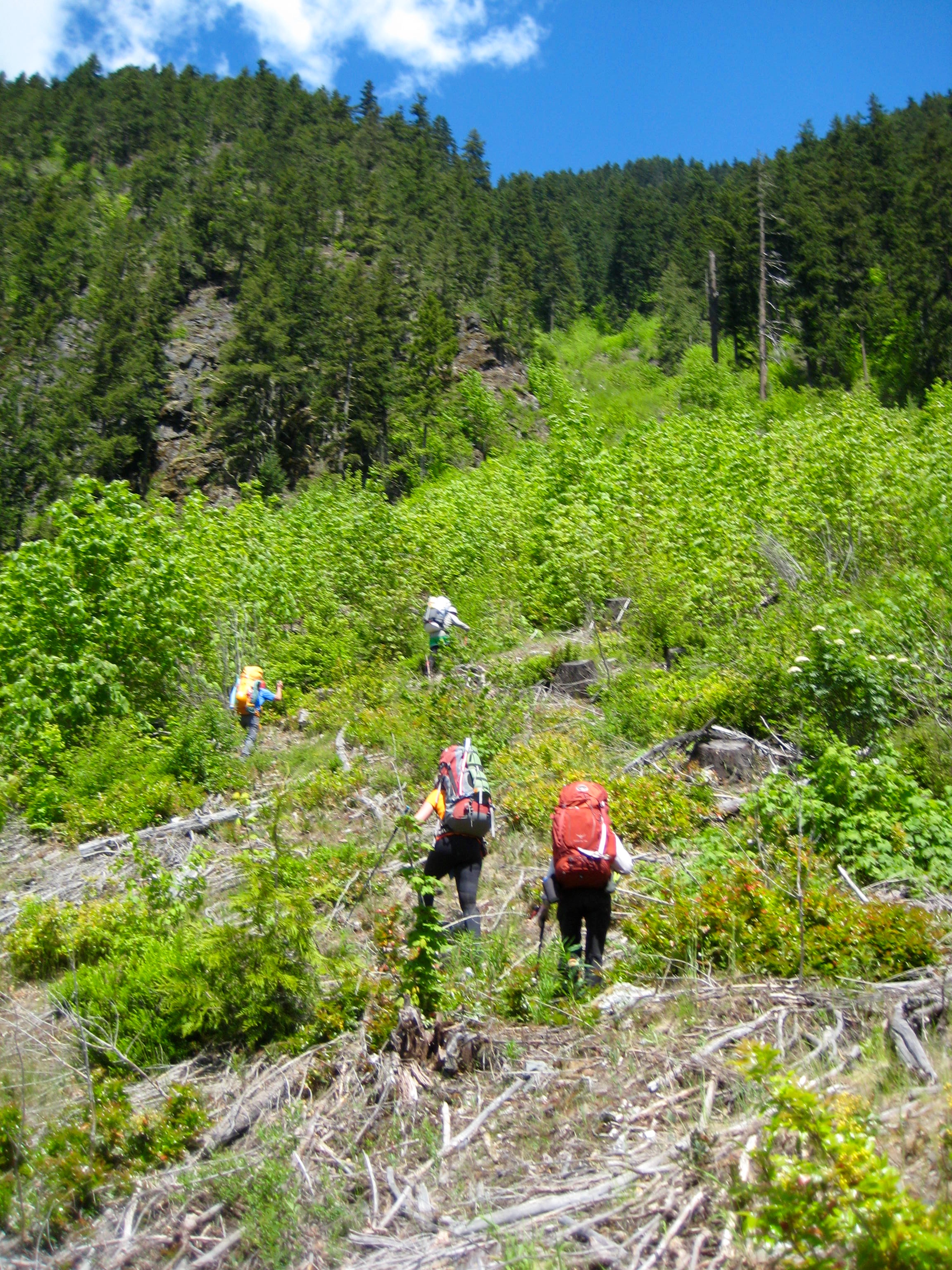 Our first leg of the approach involved a hot, sweaty slog for 700 vertical feet up a clearcut directly above the parking lot. This clearcut slope is steep and rocky but, surprisingly, not at all brushy. Near the top, we veered left onto a faint climber’s path that led up to a rib. The final few feet went up a very steep Class 3 rock and dirt headwall with a fixed handline. We took our first of many rest breaks at the top of this portion, about 1000 feet above the parking lot.