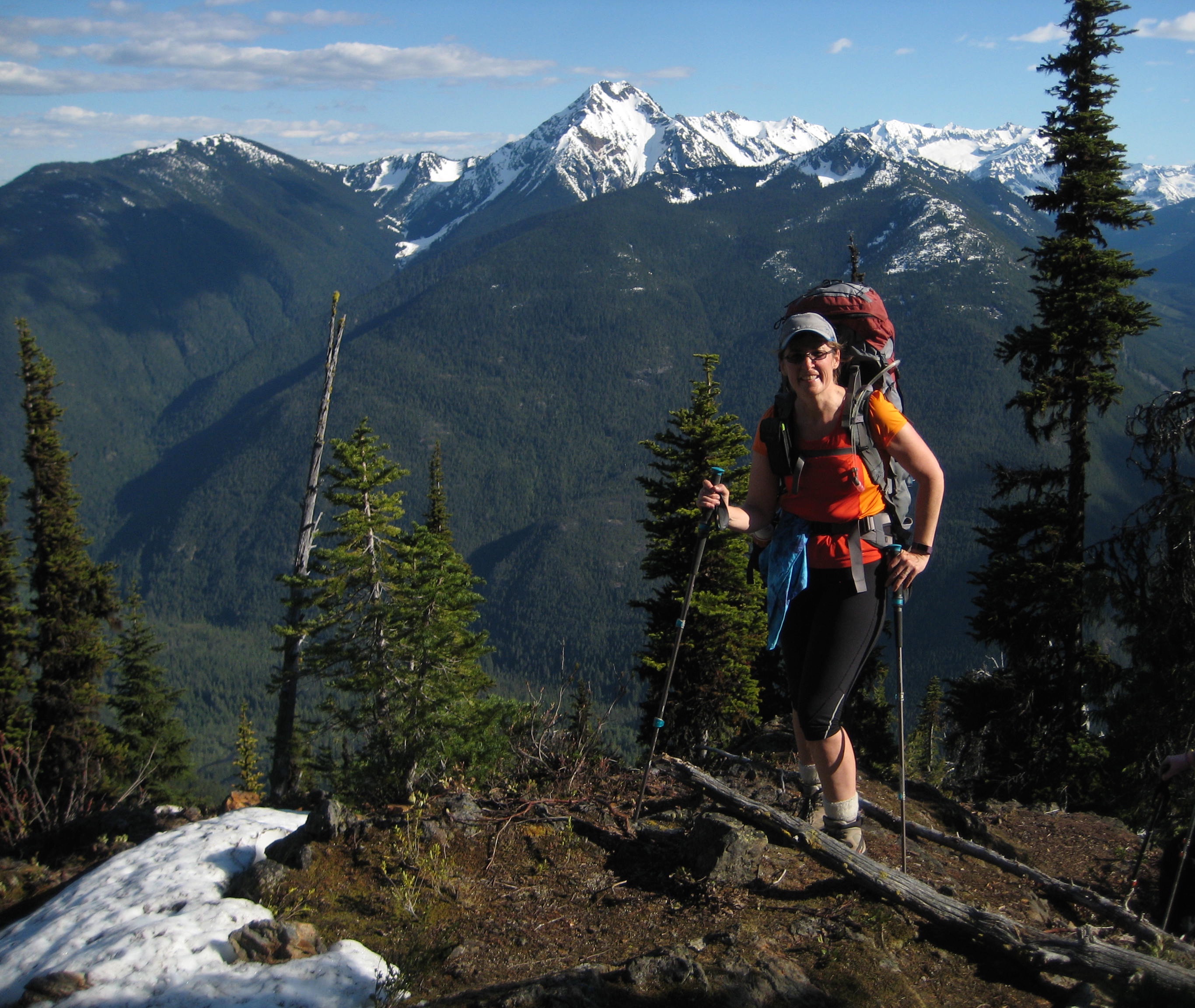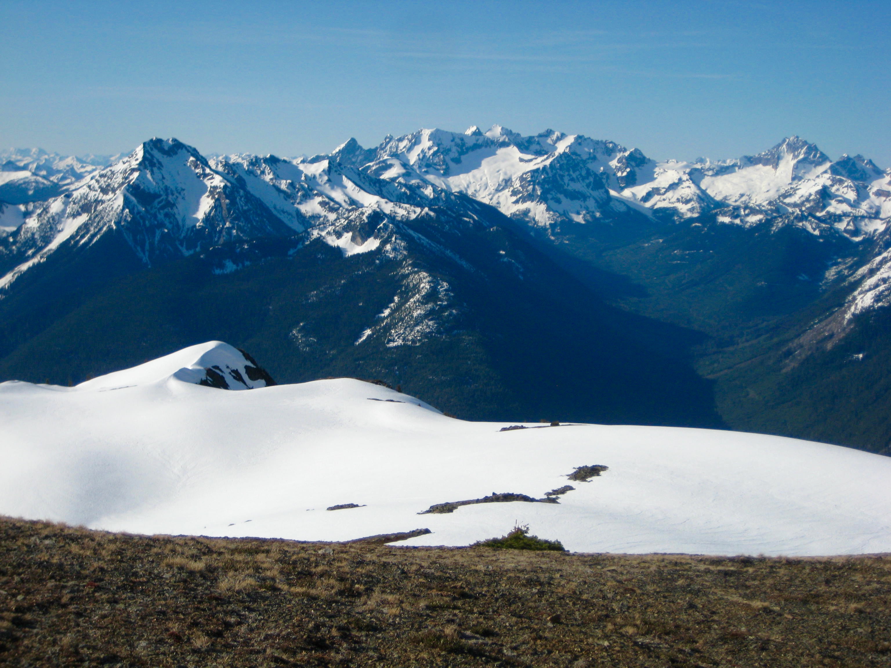We drove the Silver–Skagit Road approximately 22 miles southeast from Hope, B.C., went slightly past the Maselpanik Creek road, and turned onto an obscure spur road that quickly ended in a small parking lot at the edge of the valley (Elev. 2000 feet). It was high noon and quite warm (hot, by May standards) when we arrived. We finished sorting gear, shoulders packs, and then headed up with full water bottles.