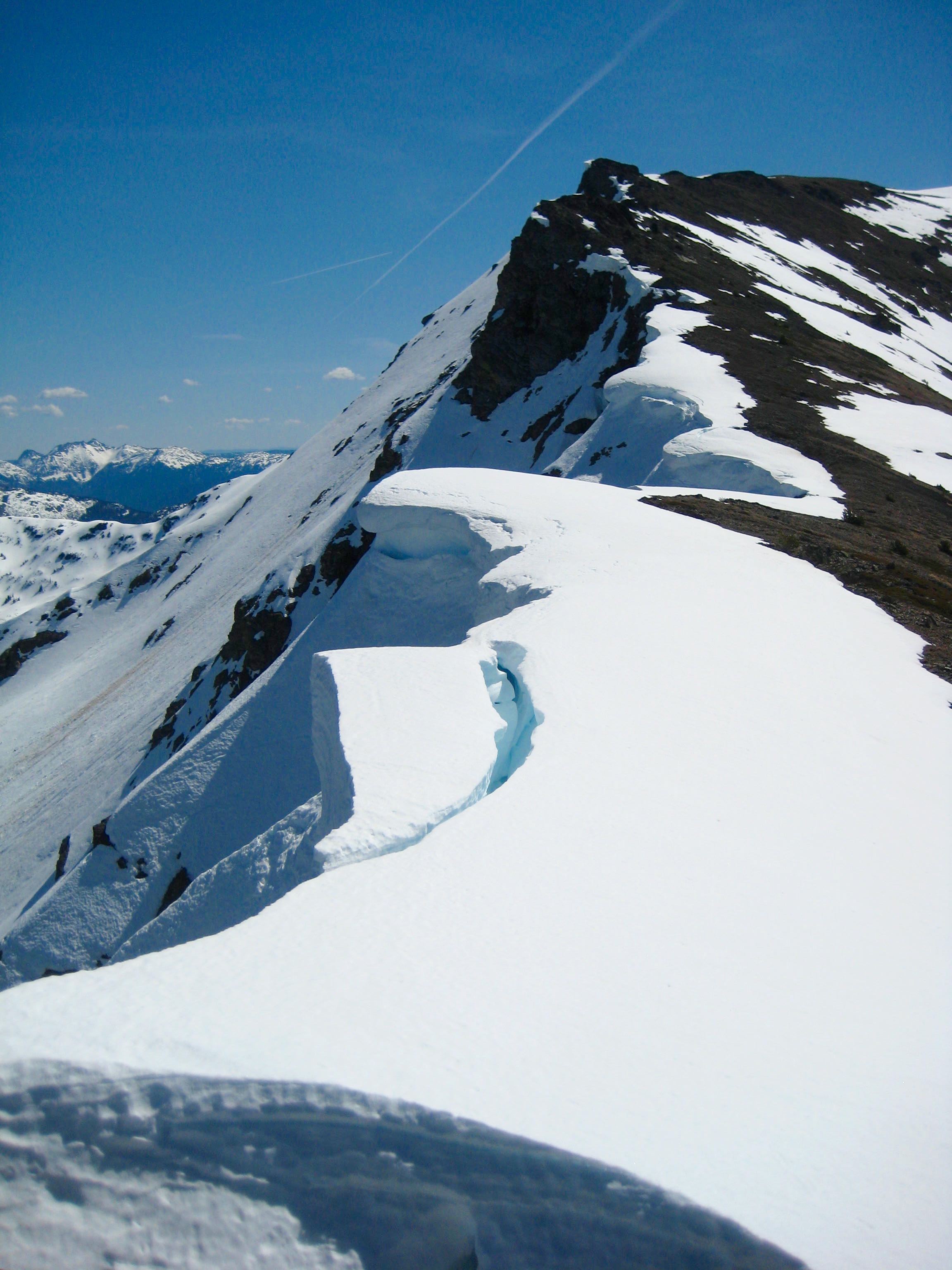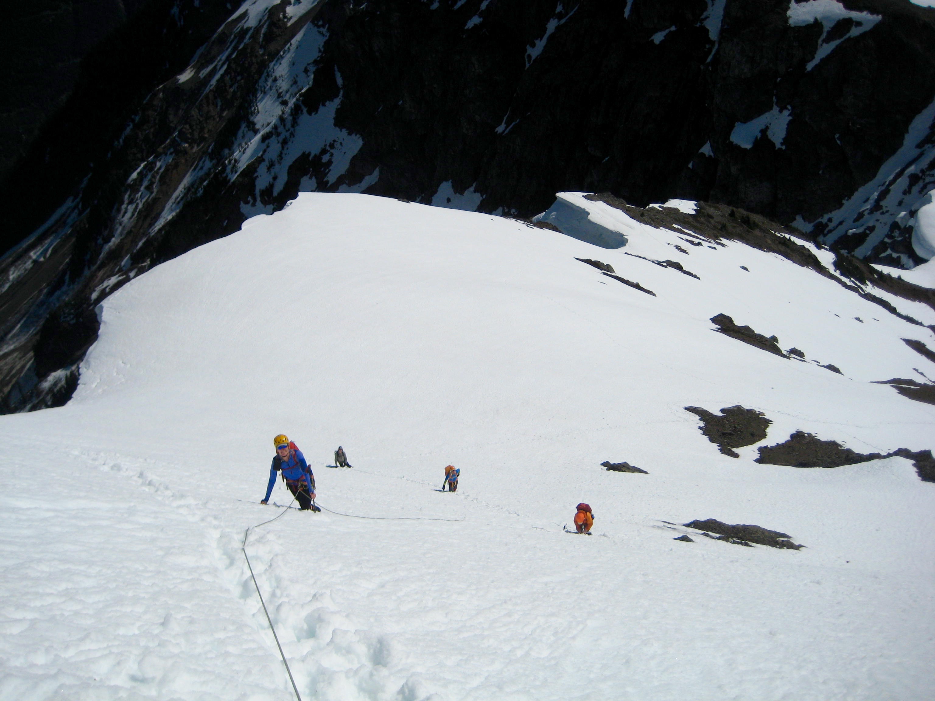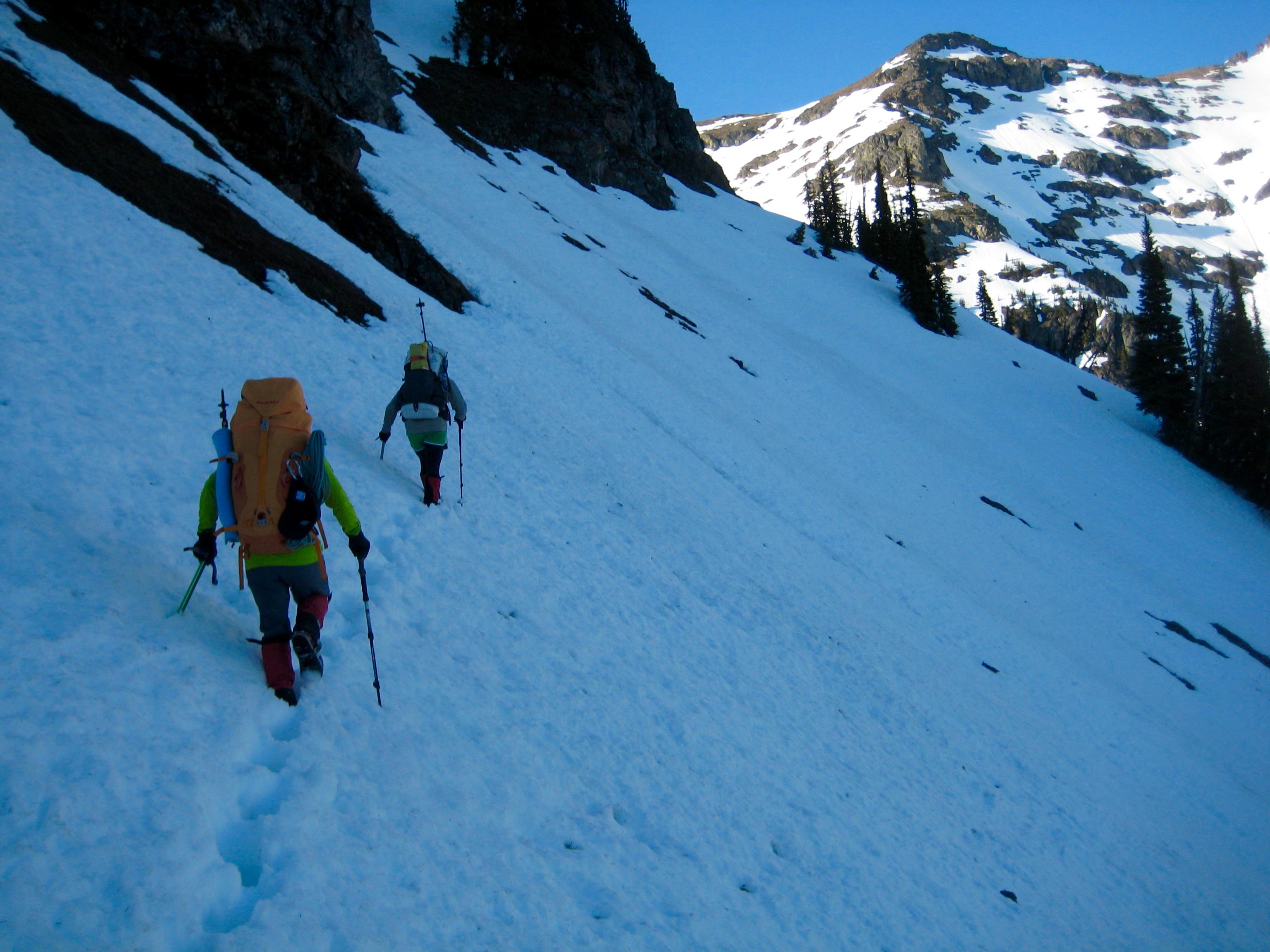 Our plan worked nicely for the first 800 feet, at which point the slope steepened and the snowpack became very unconsolidated. While trying to kick steps up a little chute, I triggered a snow slough that raced down our ascent route. We pulled the plug immediately after this scary incident and later agreed that mid-summer or autumn seems like a better time for a Rideout climb.