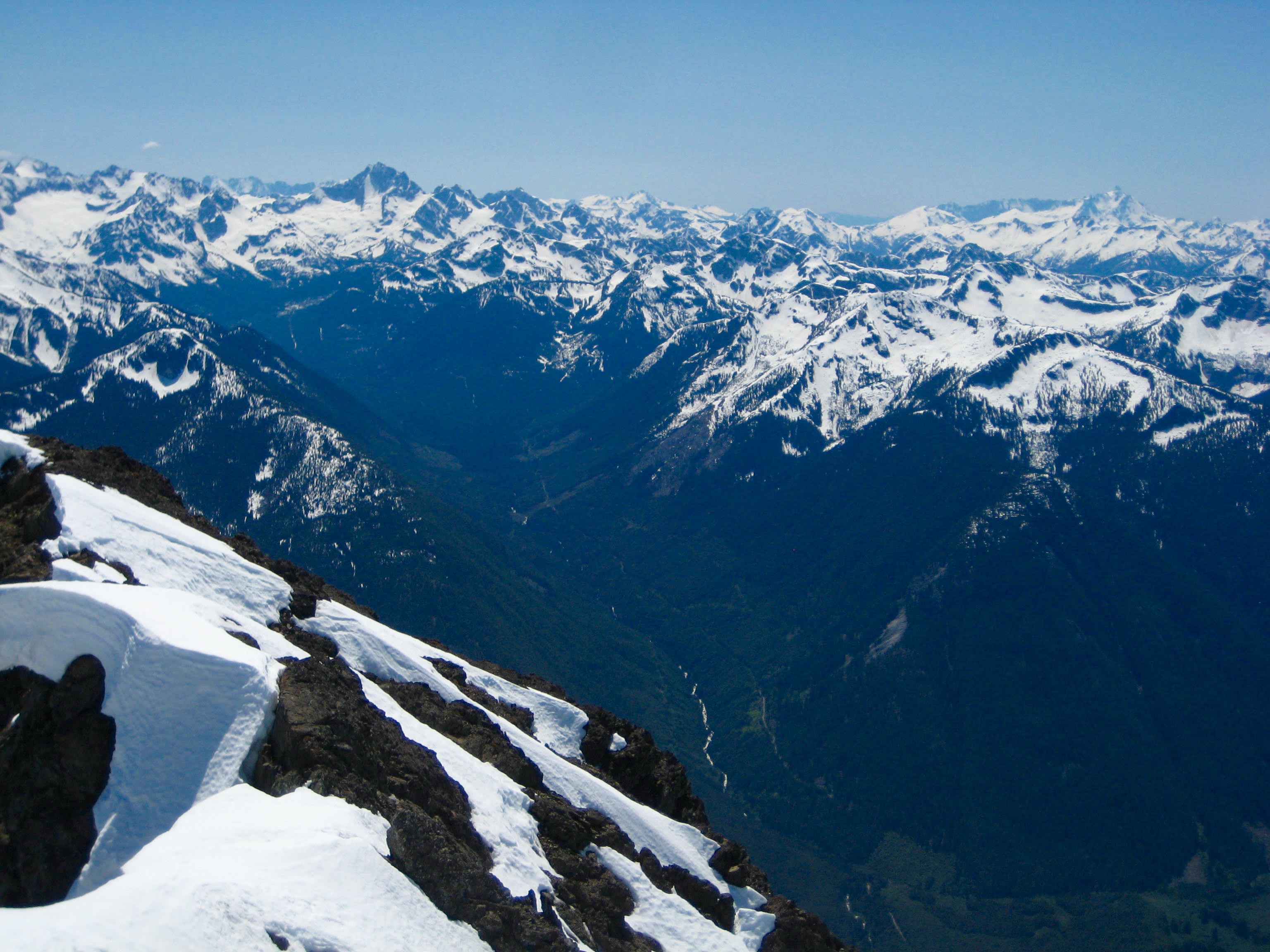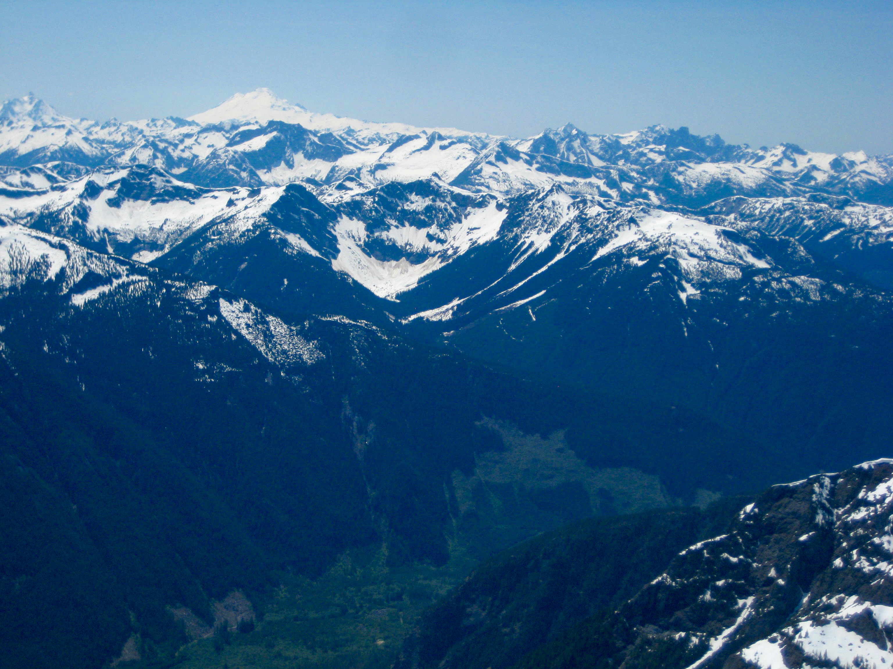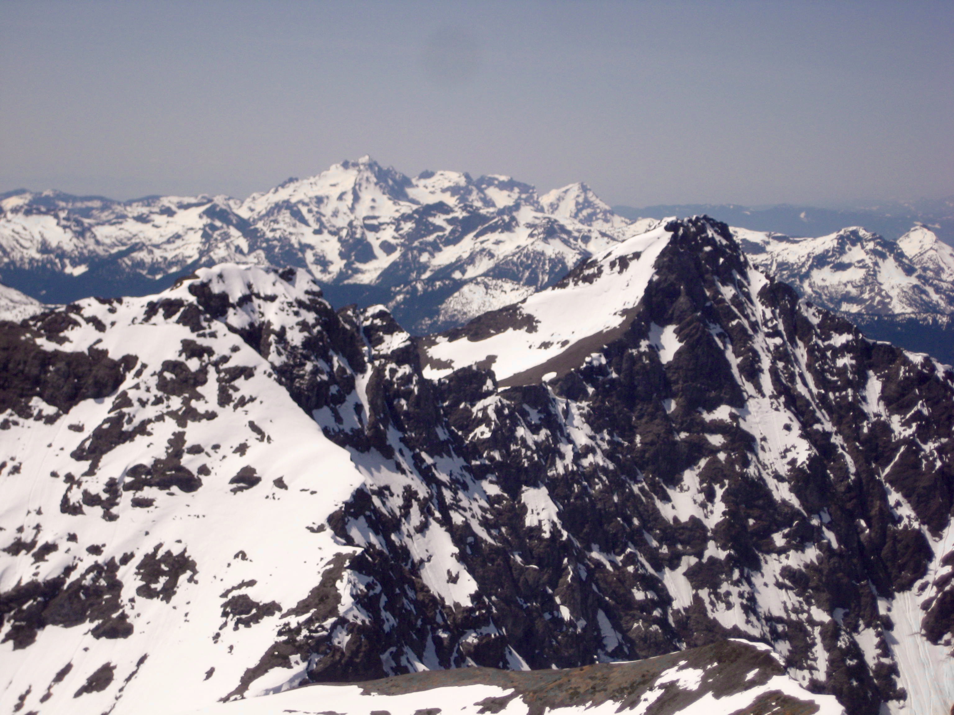 Being the highest and most prominent peak in the region, Silvertip provides a splendid vantage point. The northern side of the nearby American Chilliwack Mountains shown below (a view seldom seen by Washington climbers) was particularly impressive. The Coast Range extended off to our northwest, and the Coquihalla Mountains rose directly to our north.
