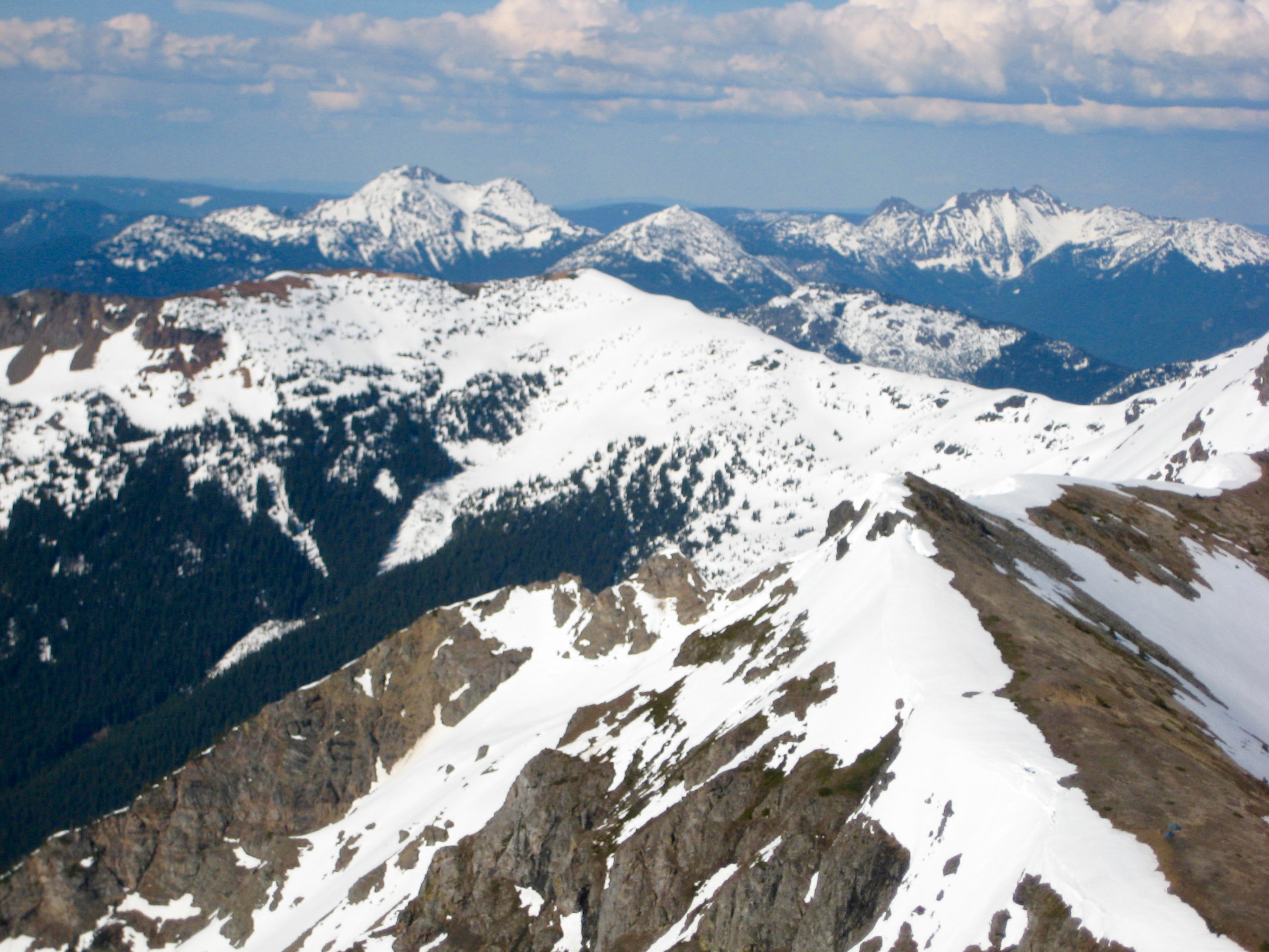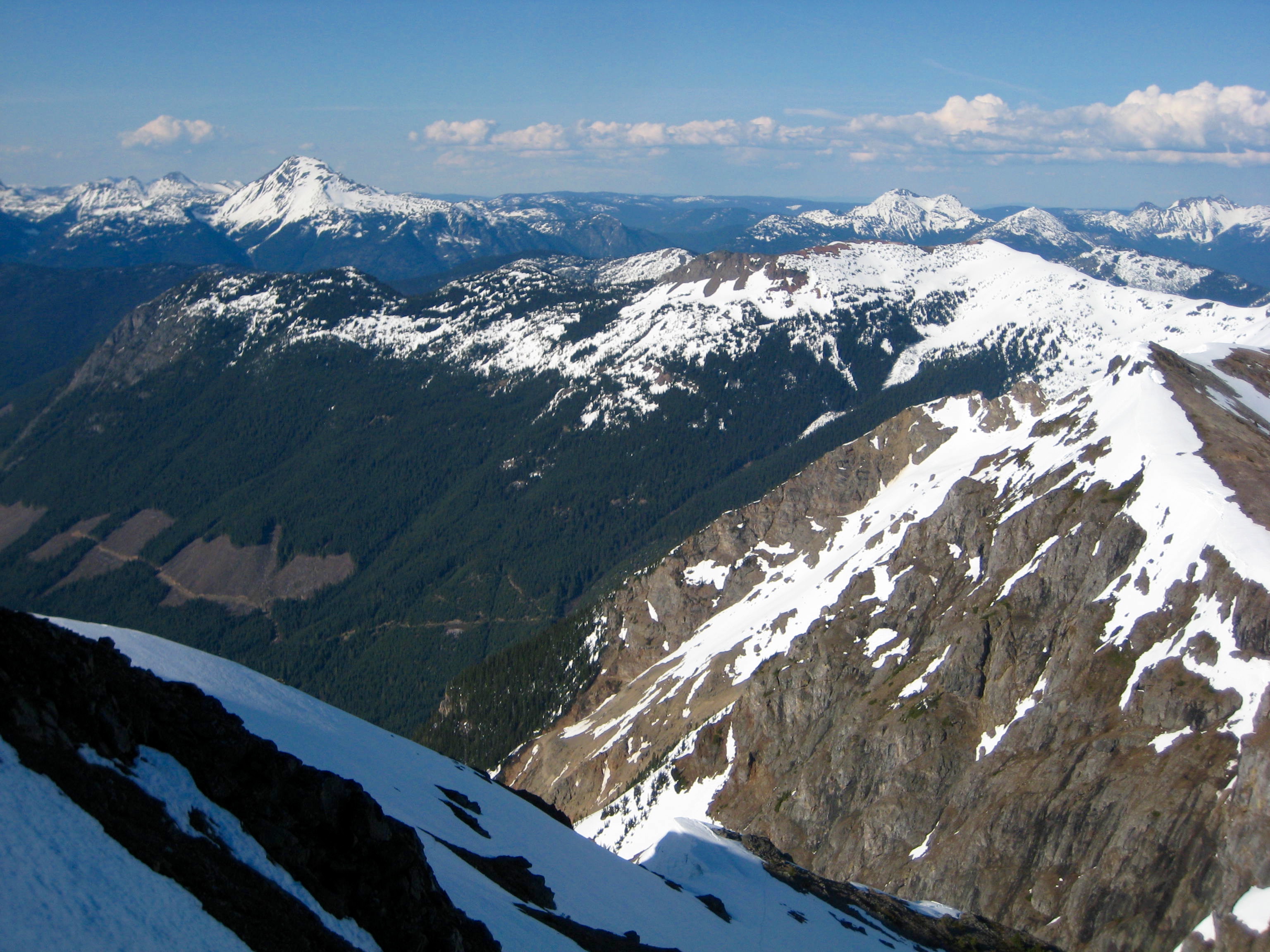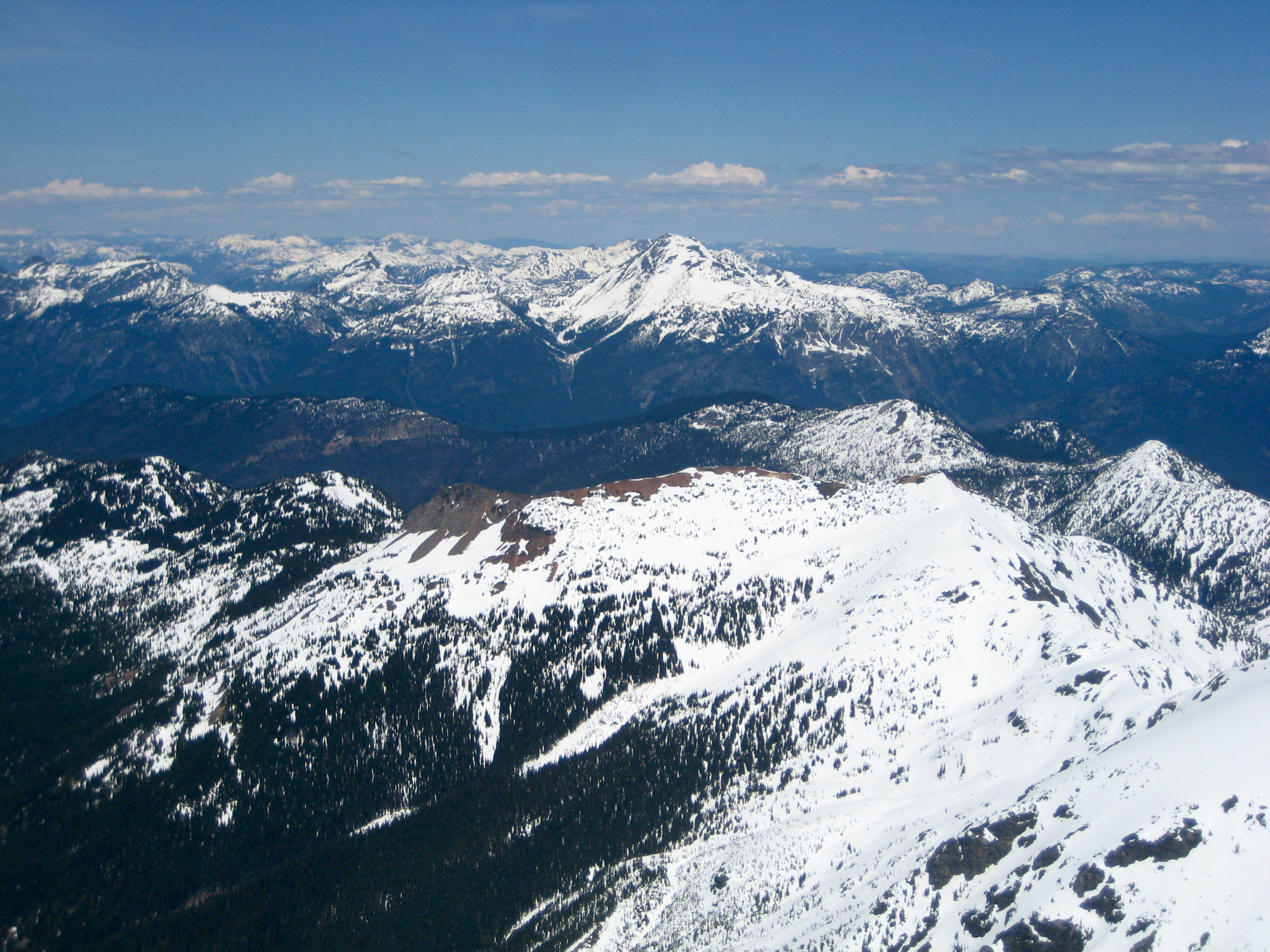 Being the highest and most prominent peak in the region, Silvertip provides a splendid vantage point. The northern side of the nearby American Chilliwack Mountains shown below (a view seldom seen by Washington climbers) was particularly impressive. The Coast Range extended off to our northwest, and the Coquihalla Mountains rose directly to our north.