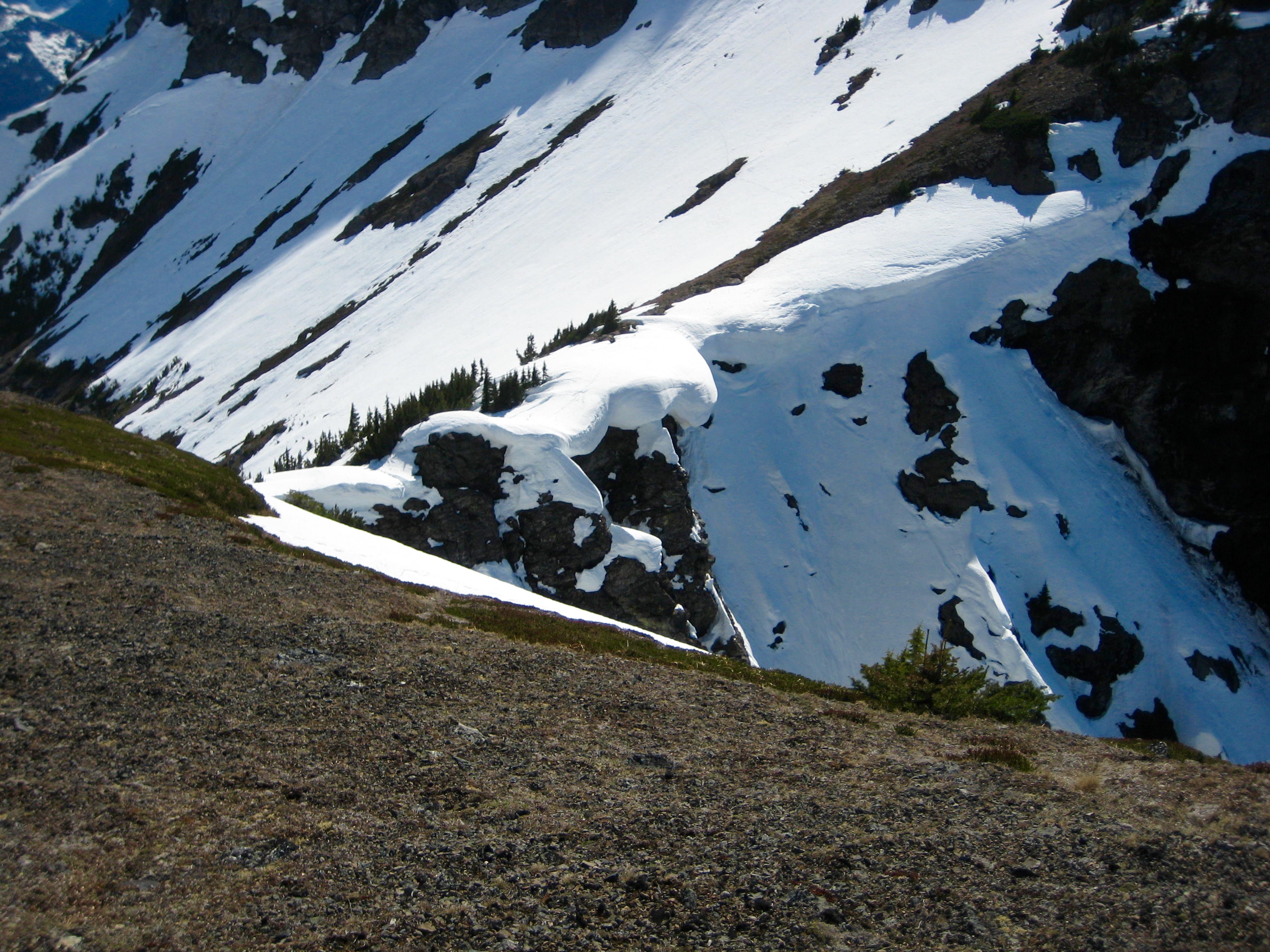 Progress along the ridge crest is blocked by a rock buttress at 5800 feet, forcing a detour around to the right (eastern) side of the ridge. We traversed a series of steep snow slopes around the buttress to gain a snowy basin below Silvertip Mountain. Some of the traverse route crosses between tall cliff bands; this is no-slip territory!