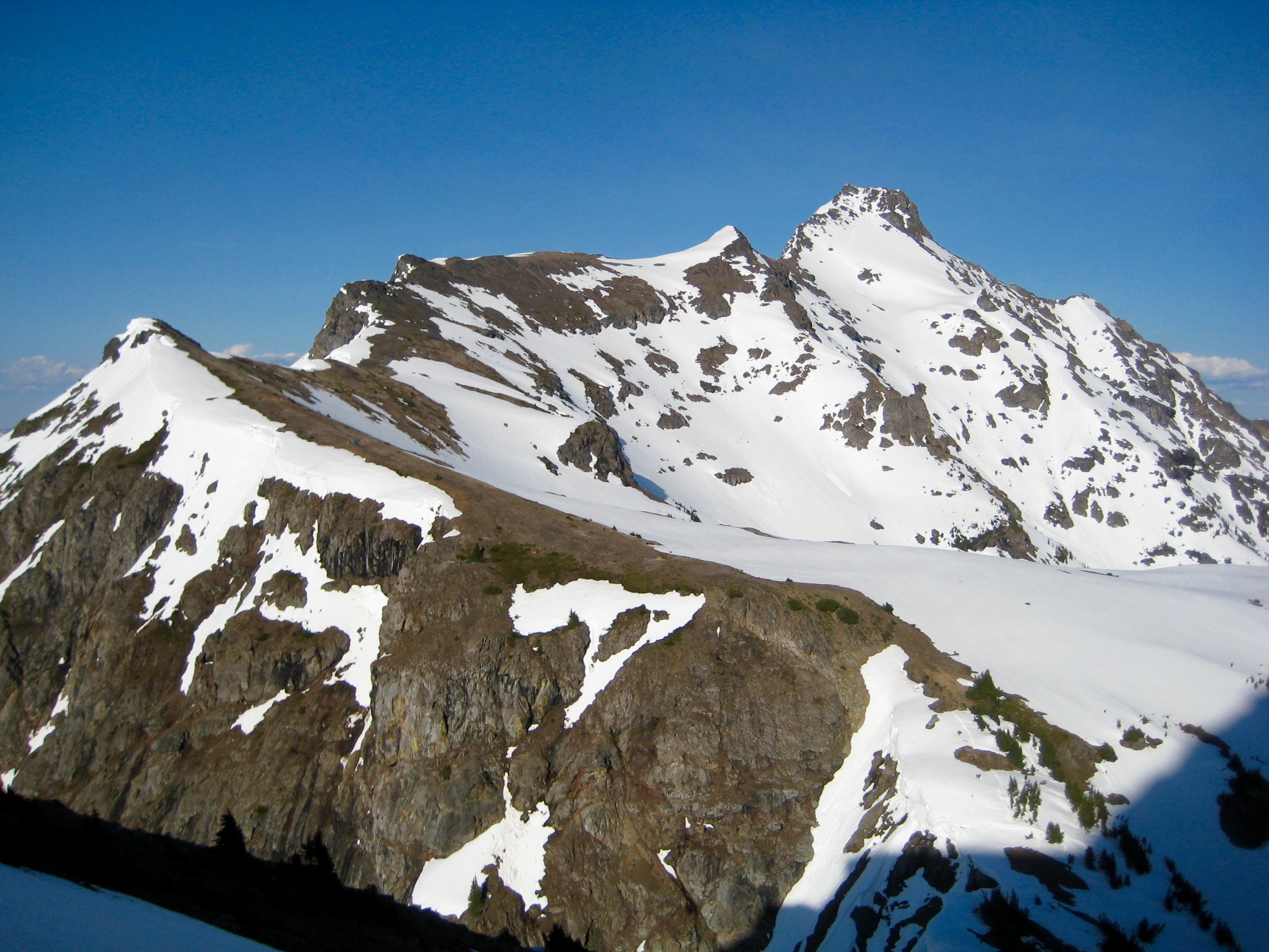 We filled up our water bottles and carboys at a meltwater trickle in the snow basin, then continued up toward the saddle in the Silvertip–Rideout connecting ridge. Despite a healthy snowpack this winter, prevailing southerly winds have kept the ridge crest bare and dry. We happily set up camp on some gravel benches at 6900 feet with sweeping views of the Cascade range to the north and south (8.4 hours + 5000 feet from car).
