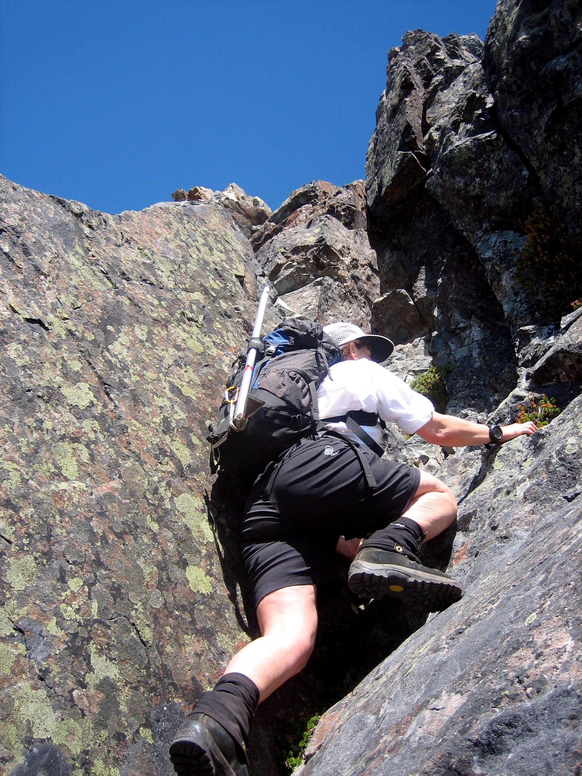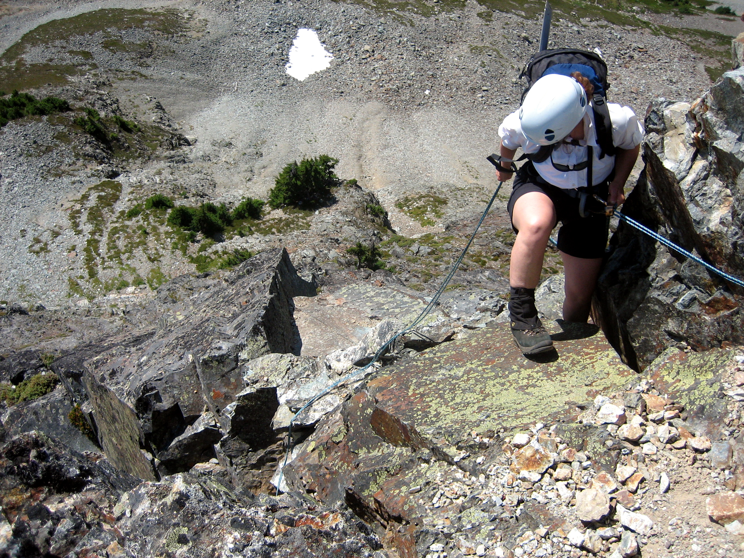 The southwest corner of the summit block goes by way of an exposed-but-solid Class 4 step. We didn’t rope for the ascent but were glad to have a rope for the rappel back down.
