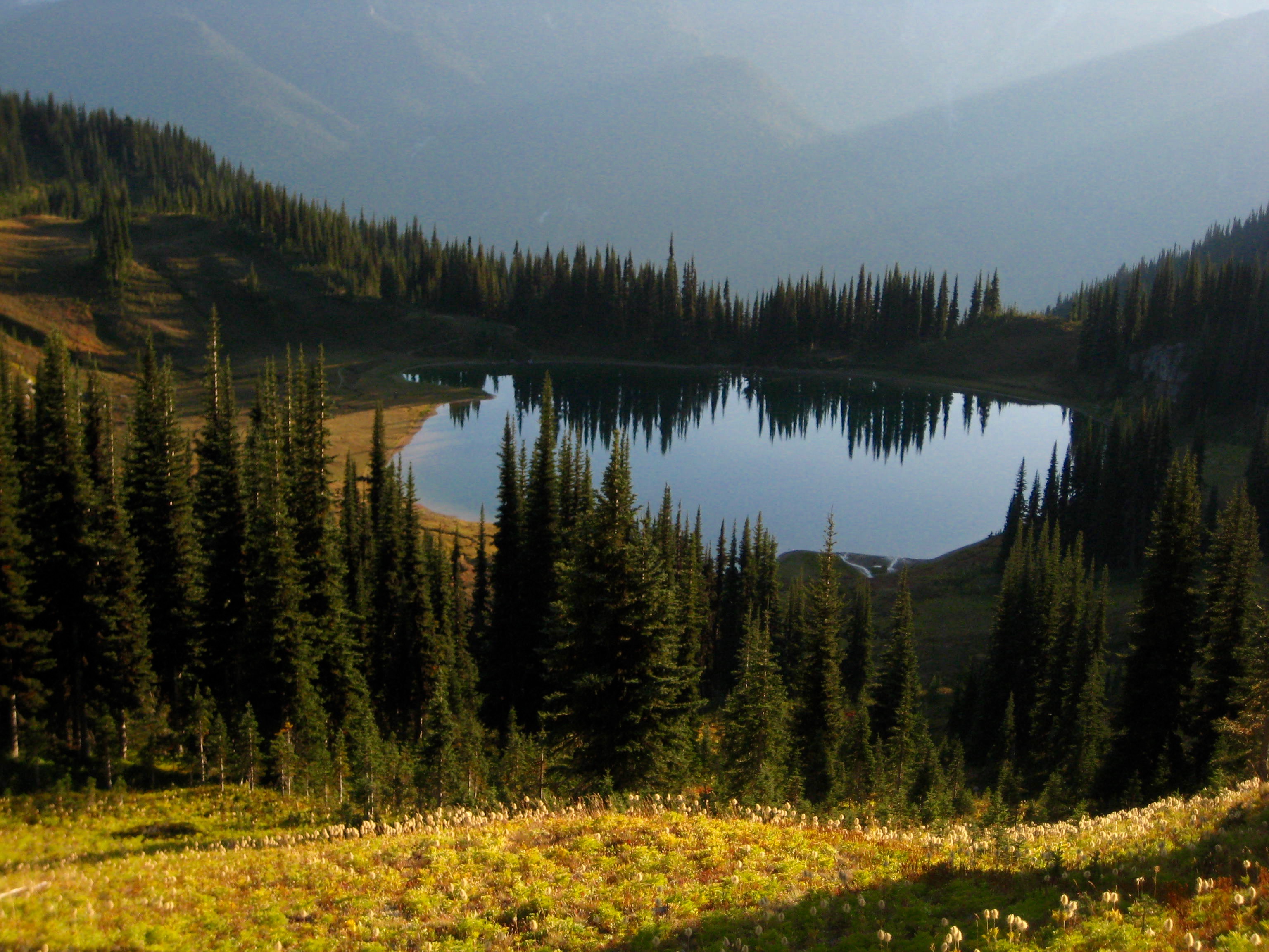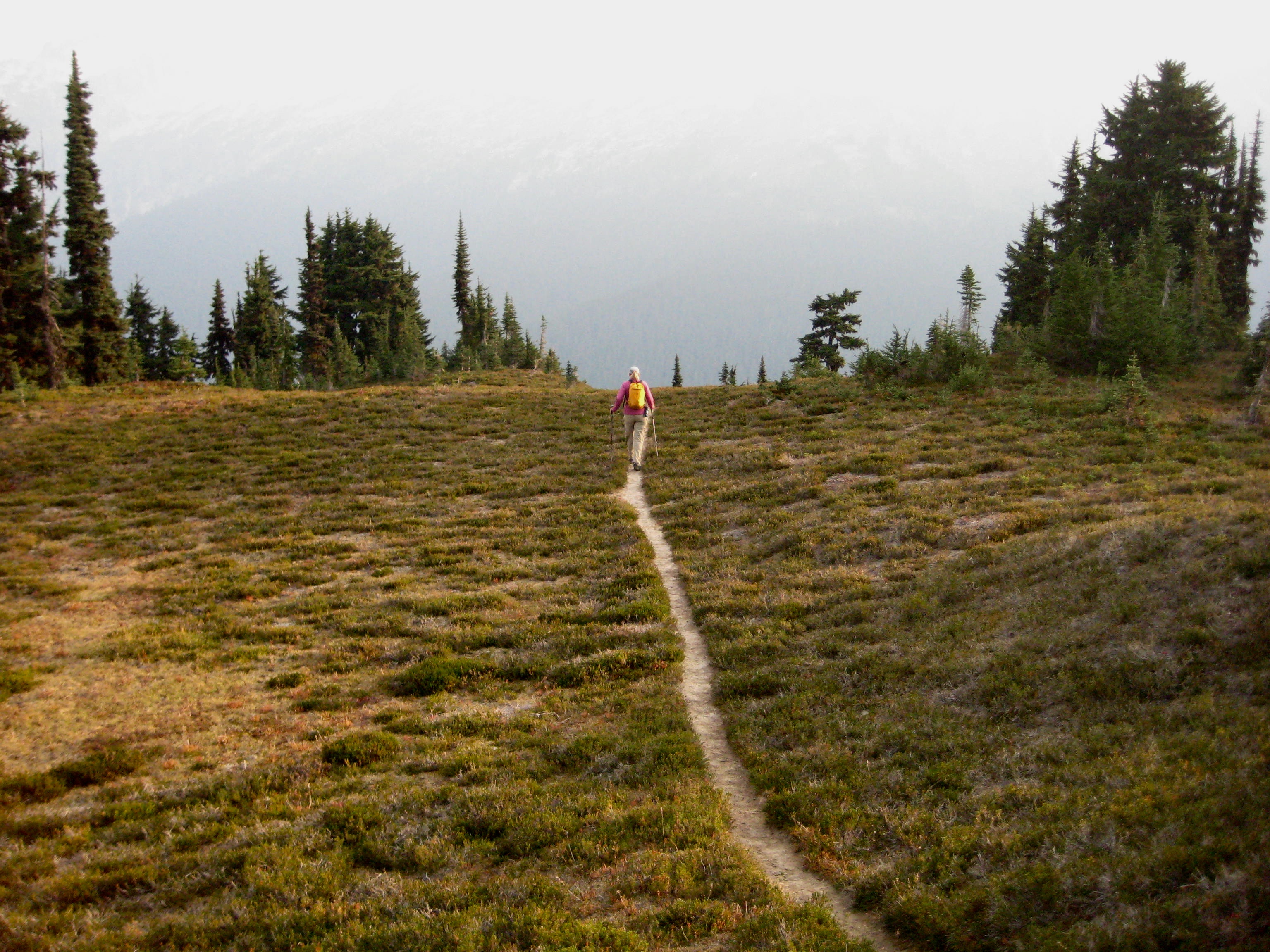 After enjoying yesterday’s clear air and long-range visibility, we were dismayed to awaken to a morning of heavy smoke. Apparently, the winds had shifted overnight, and forest-fire smoke was snow blowing in from the Pasayten Wilderness. Nonetheless, we loaded summit packs and headed down the Canyon Lake Trail.