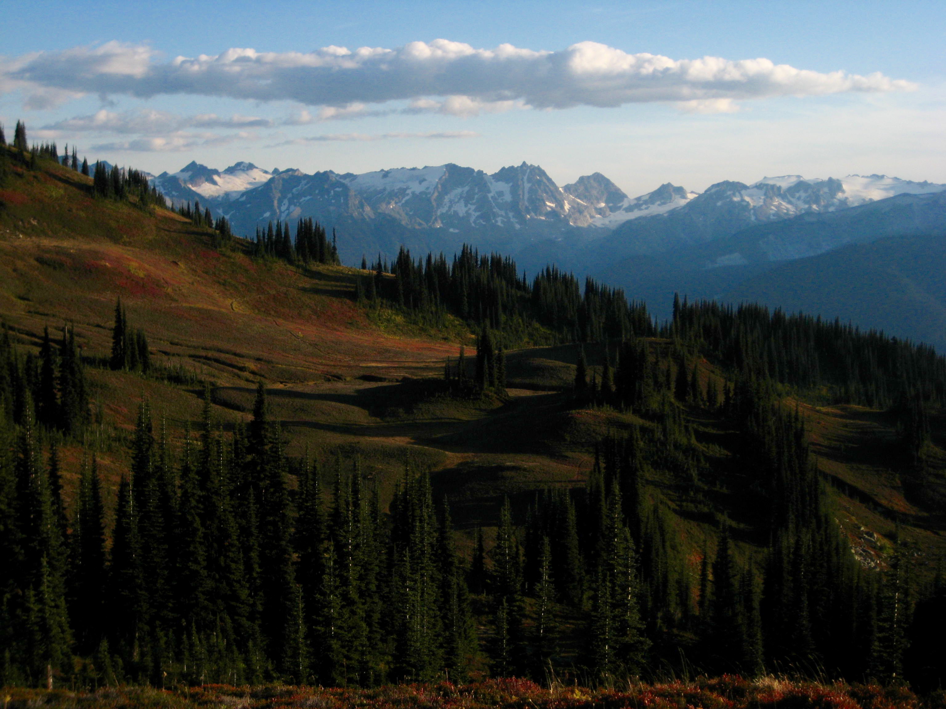In mid-afternoon, I encountered Fay hiking down the trail from Image Lake. I gave her a solo tent to use for her last night down the trail, and she gave me some information about Eileen’s whereabouts. Farther up the trail, the forest finally opened up and yielded scenic views across the grand Suiattle River valley