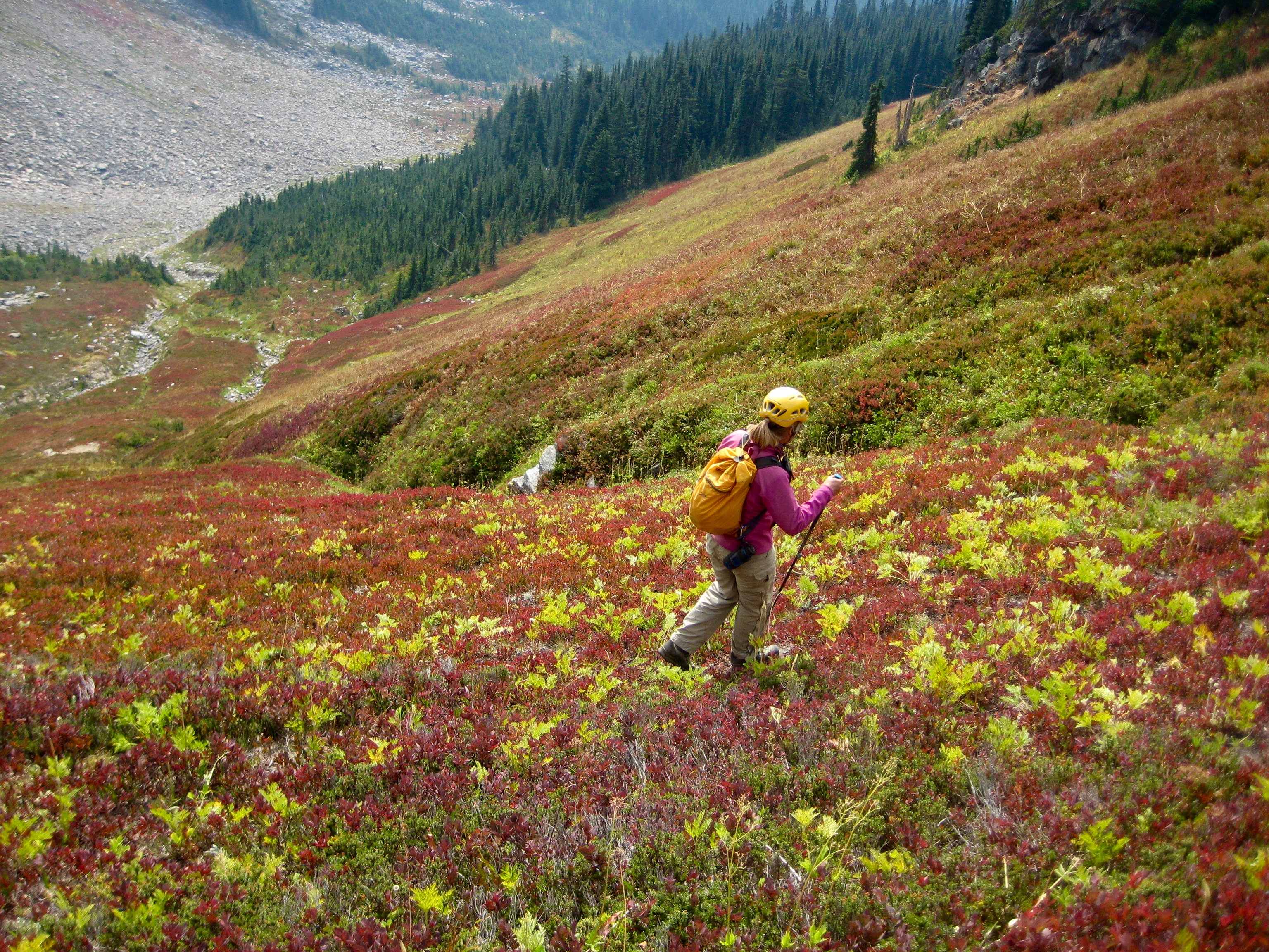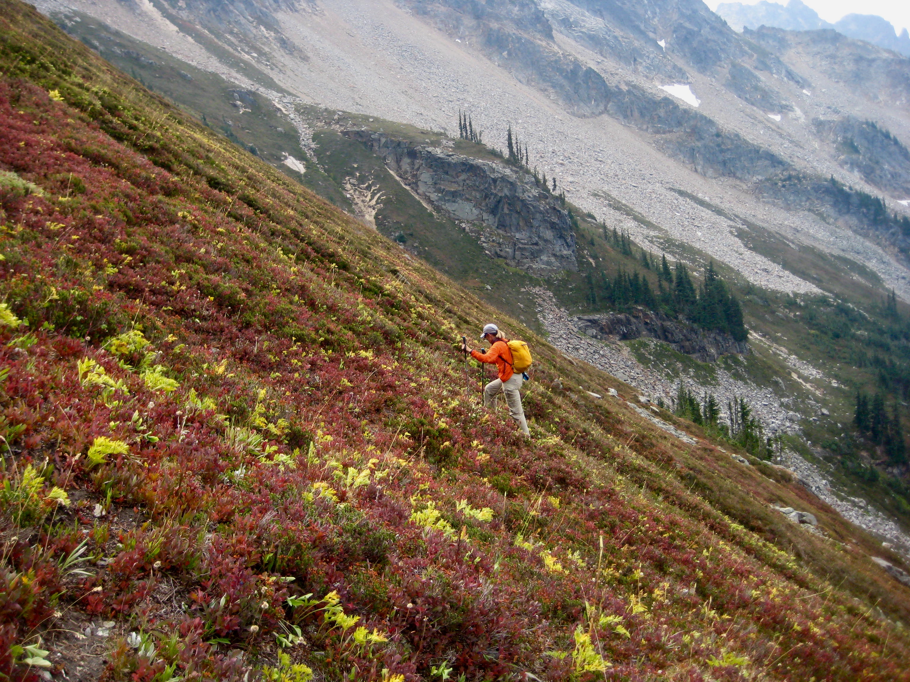 My golden opportunity recently presented itself when Eileen and Fay planned a five-day climbing trip to the Bannock Lakes area, entering via Suiattle Pass and exiting via Image Lake. It was decided that Fay would hike out on Day 5 of their trip, while I hiked in to meet Eileen with resupplies for an additional four days. Our tag-team plan actually worked, and we all had a wonderful time.