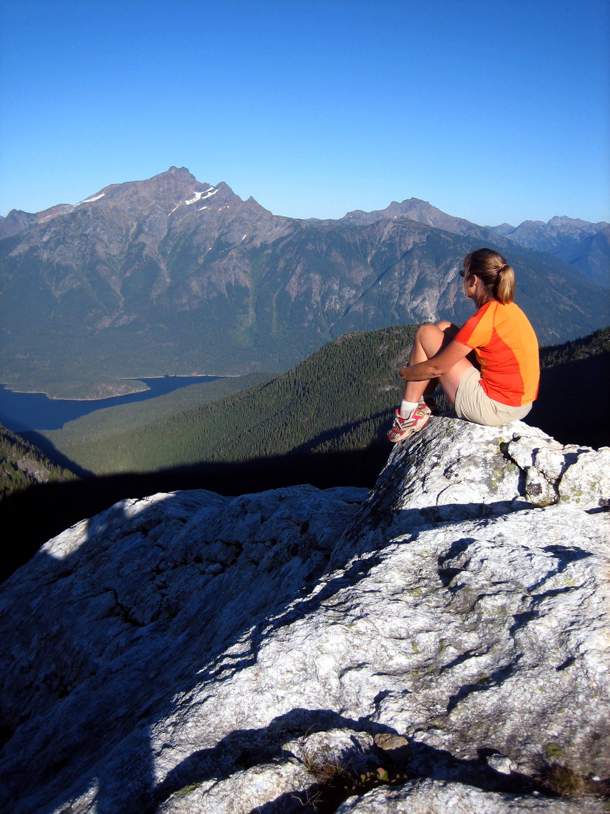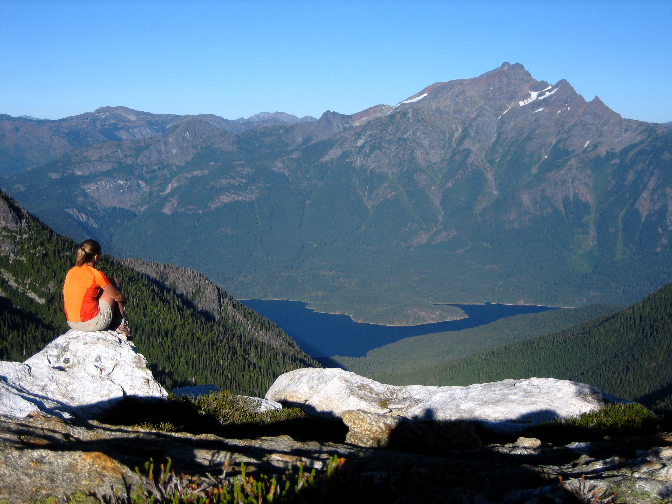 A woman hiker sits on a white rock and looks across Ross Lake at Jack Mountain
