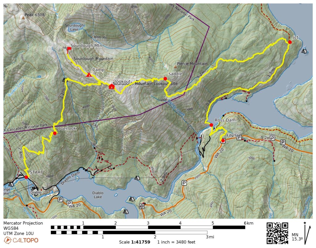 Way Points: Diablo Overlook & Sourdough Creek & Sourdough Knob & Sourdough Lookout & Pierce Mountain saddle & Ross Lake Overlook & Ross Lake & Ross Dam & Highway 20 (trail hike)