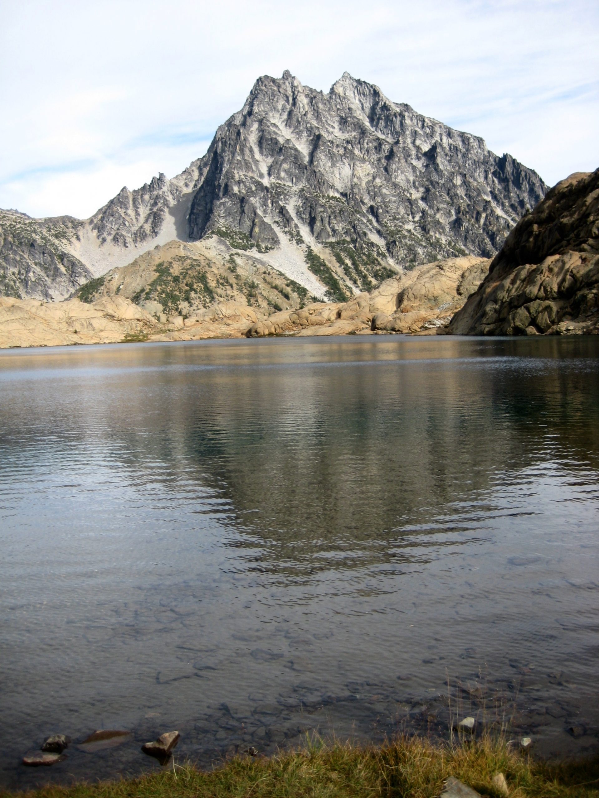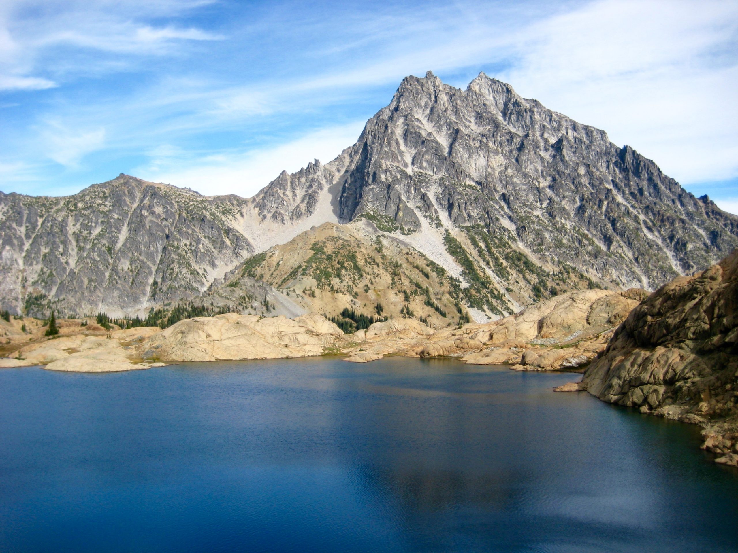A short descent into Headlight Basin led to a glacially polished rock outcrop overlooking Ingalls Creek Valley. We quickly pitched our tent on the outcrop, then followed the lower (alternate) trail over to Ingalls Lake (0.7 hours + 350 feet from camp). I hadn’t been here in more than a decade but was immediately reminded why this is one of the ten most famous alpine lakes in Washington: the granitic countenance of Mt. Stuart towering above the rock-rimmed indigo water is beyond description!