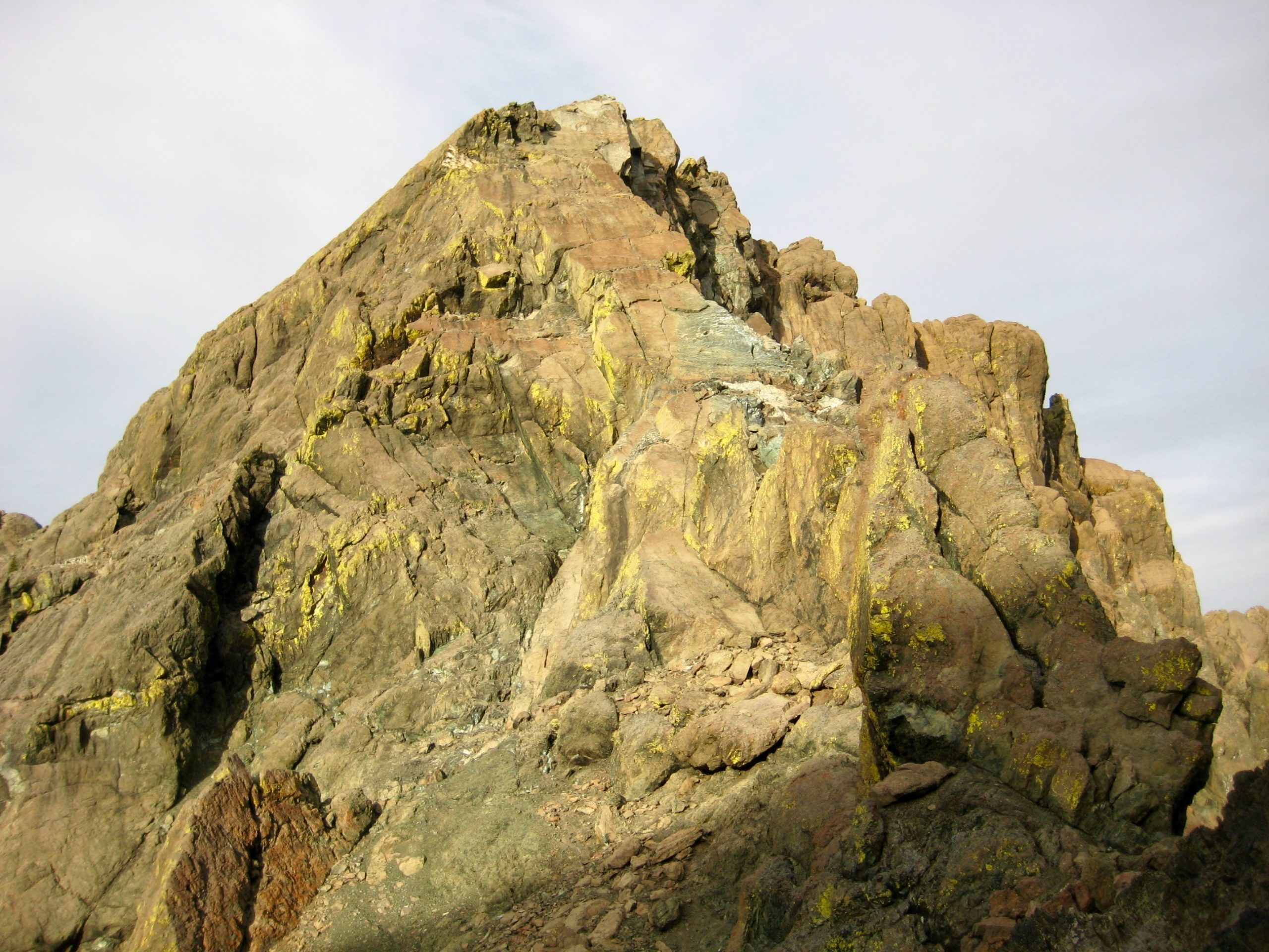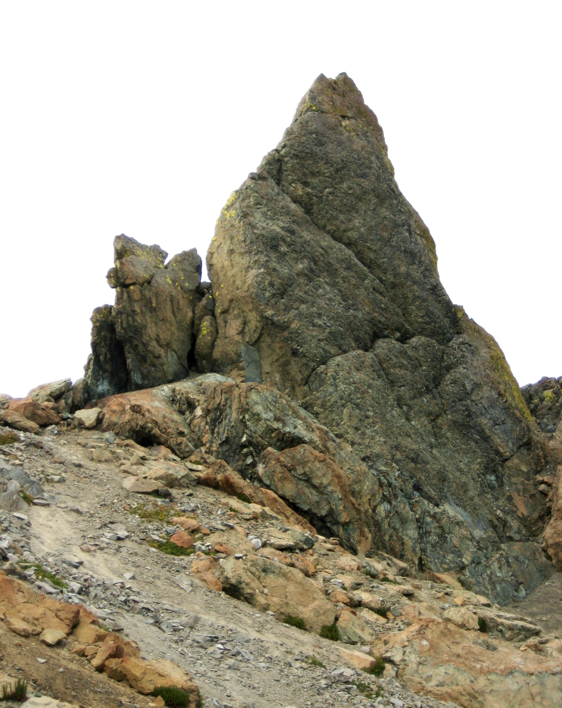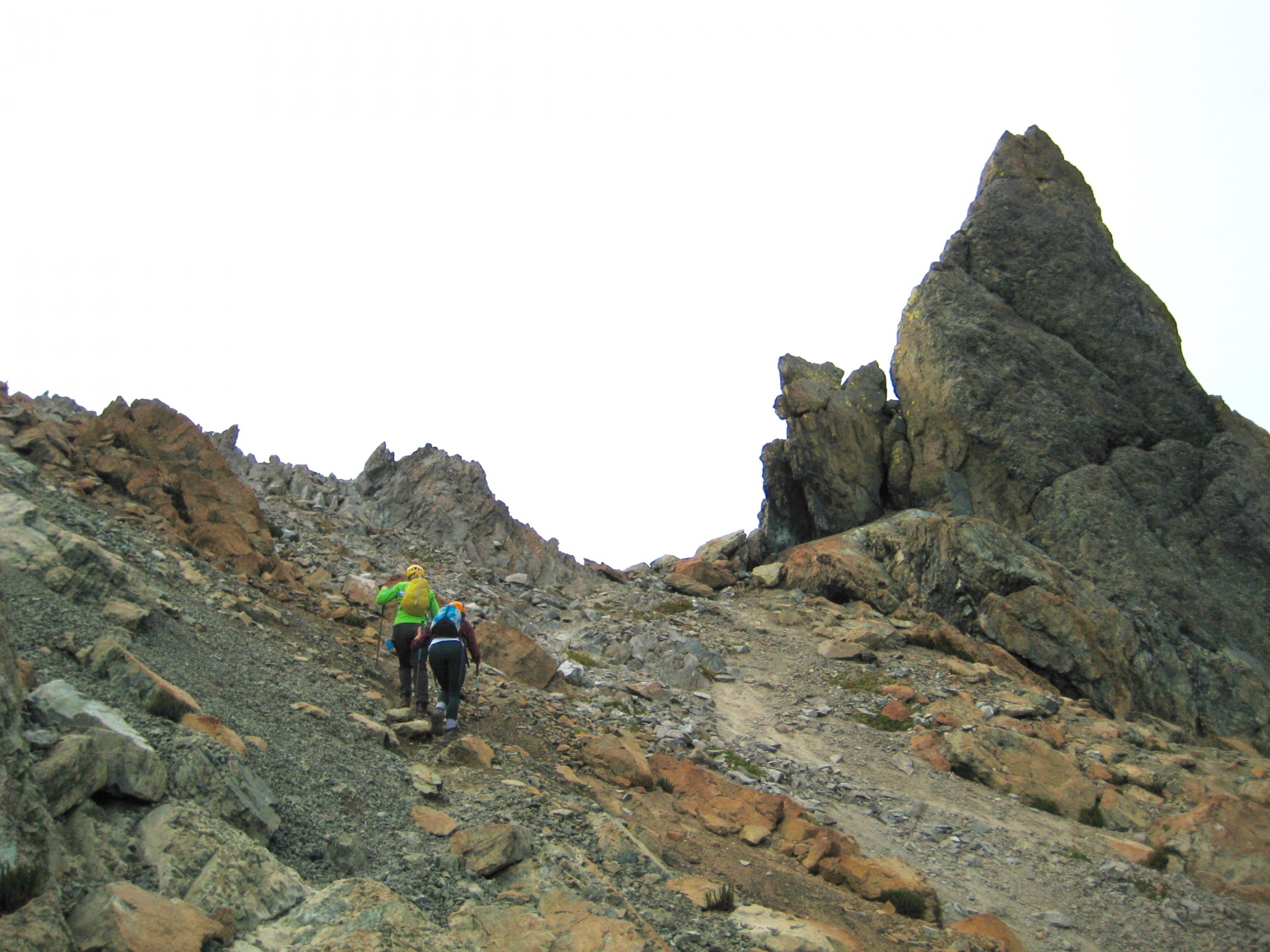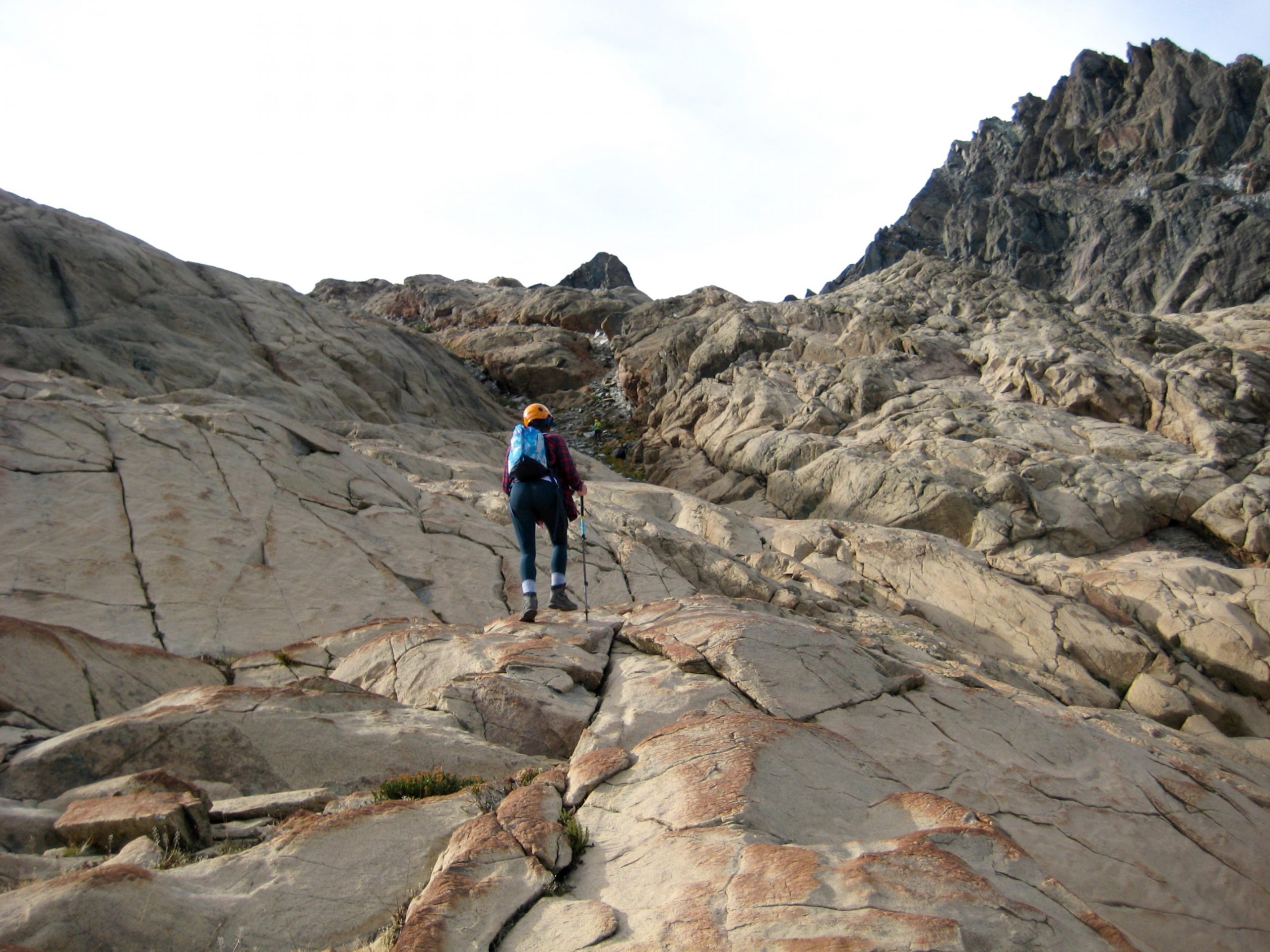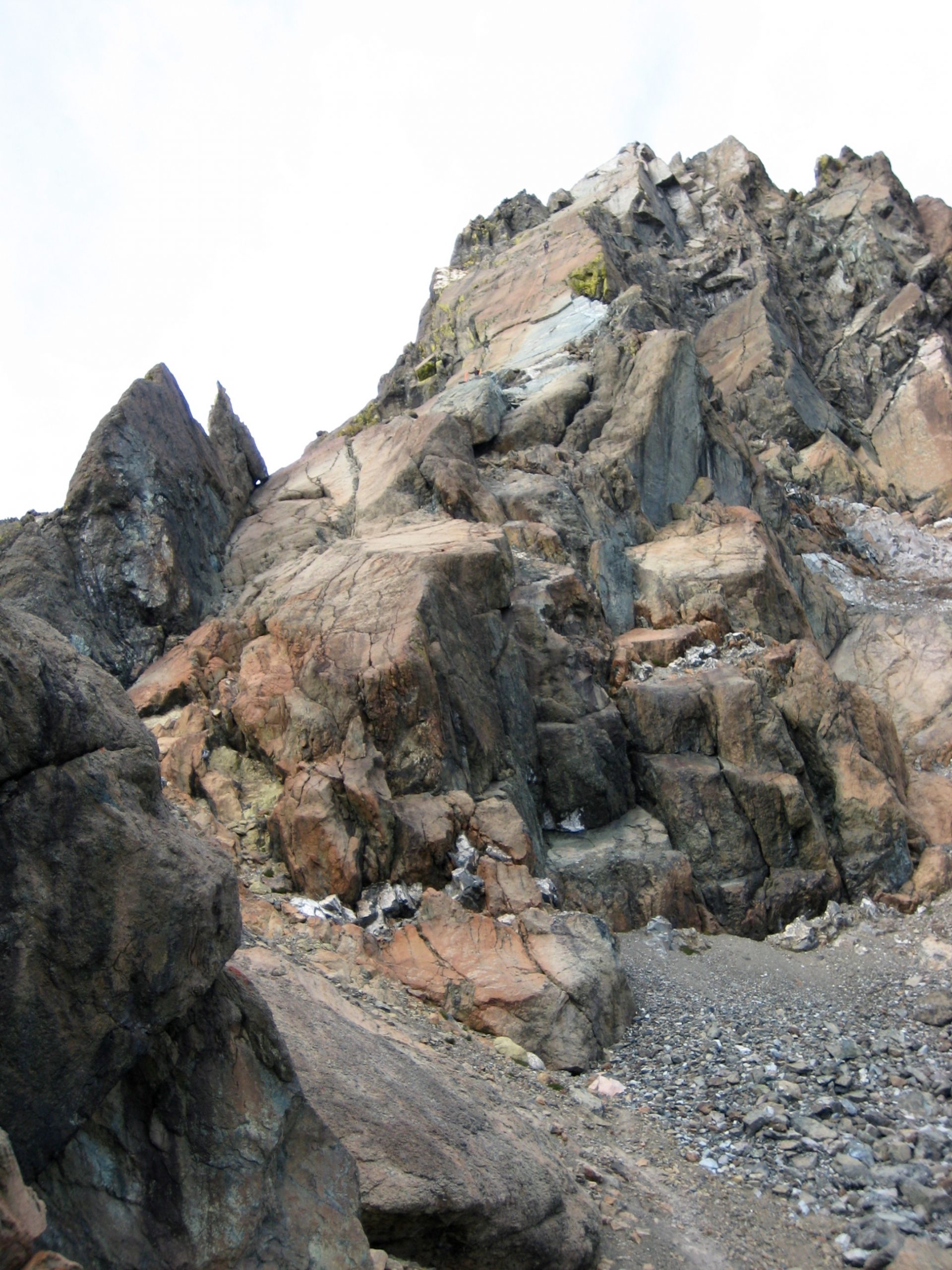 From Ingalls Lake, we parted company with the scads of day-hikers by scrambling westward up a long series of rock slabs, domes, and ramps leading to Ingalls Col. The entire Ingalls Peaks massif consists of rust-colored peridotite, an ultramafic rock that originally formed at great depth in the earth’s mantle and was later pushed up by tectonic action.