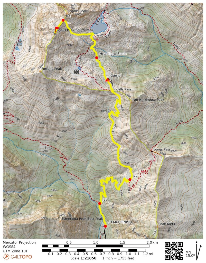 Hastened off by a chilly breeze, we retraced our steps down to Ingalls Lake and then elected to follow the high (main) trail around the top of Headlight Basin. Our hope was that this high route would get us back to camp sooner. It didn’t. It actually took more than twice as long, such that we didn’t reach camp until 7:30pm (3.0 hours + 300 feet from summit)—well after dark.
