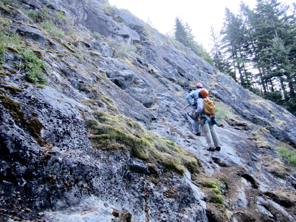 For protection, we used about ten quickdraws, as well as one extended sling to reduce rope drag on the traversing portion of Pitch 3.