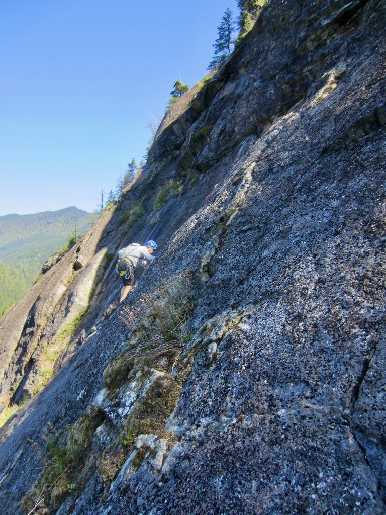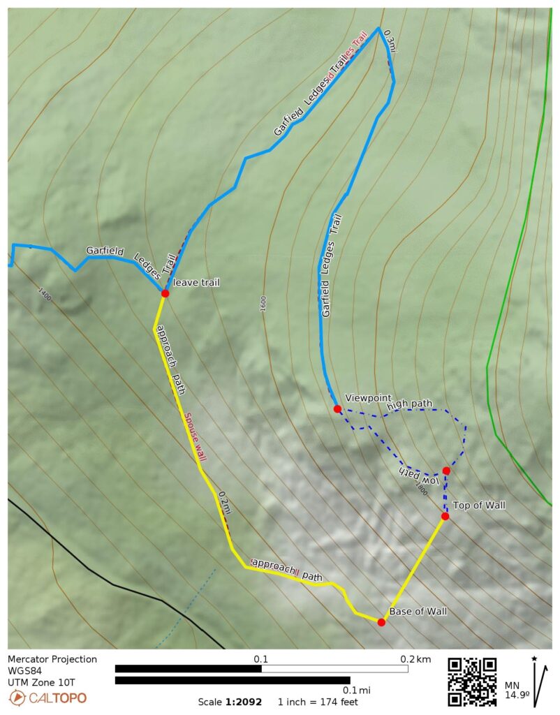 Spouse Wall is sloping rock face located on the lower flank of Mt. Garfield in the Middle Fork Snoqualmie River Valley northeast of North Bend. It can be reached from the Garfield Ledges Trailhead parking lot by a ¾-mile hike on a combination of formal trail and rough climber’s path. The rock consists of a solid, grippy, well-textured, volcanic material—probably a lightly metamorphosed andesite.