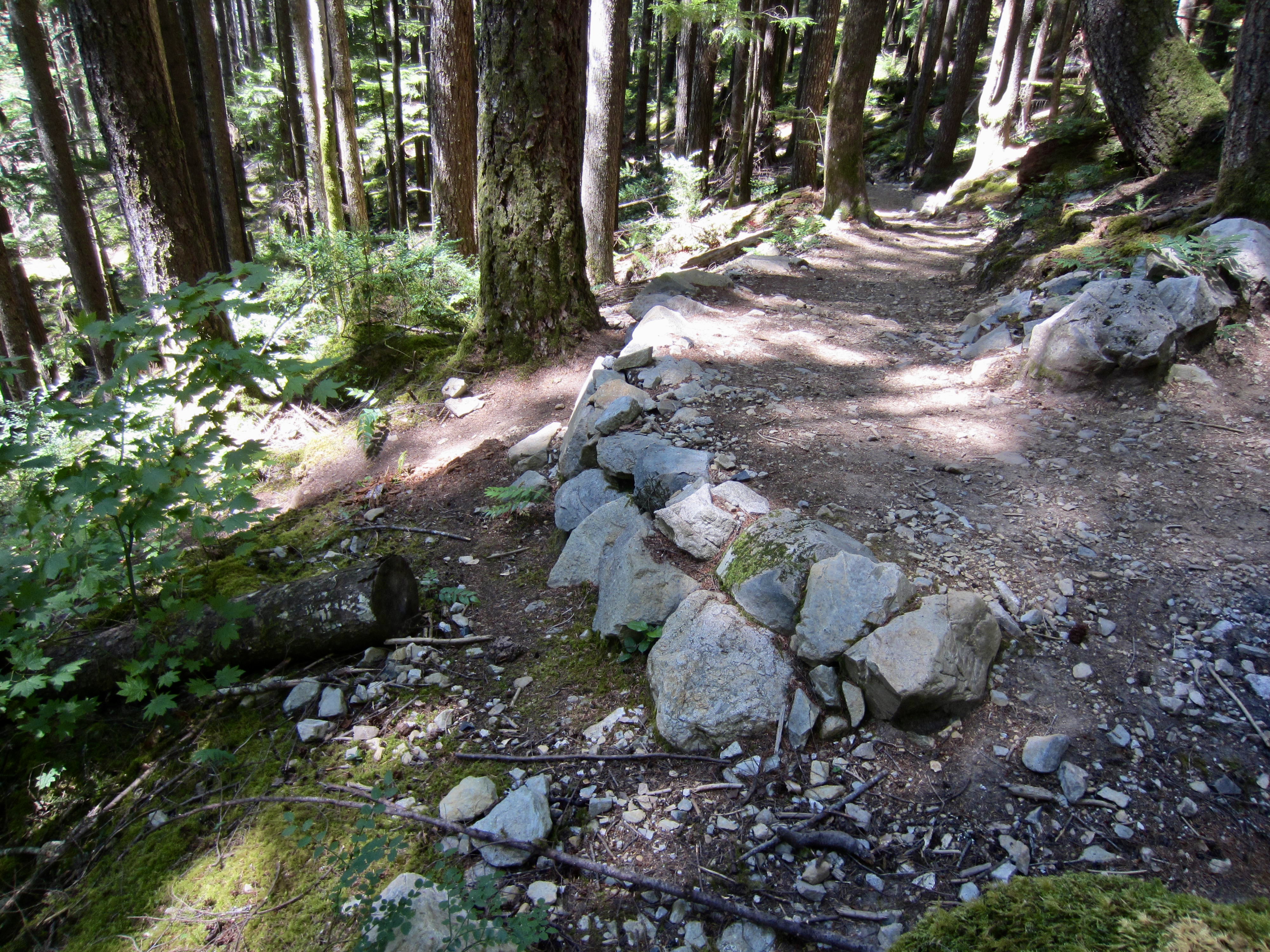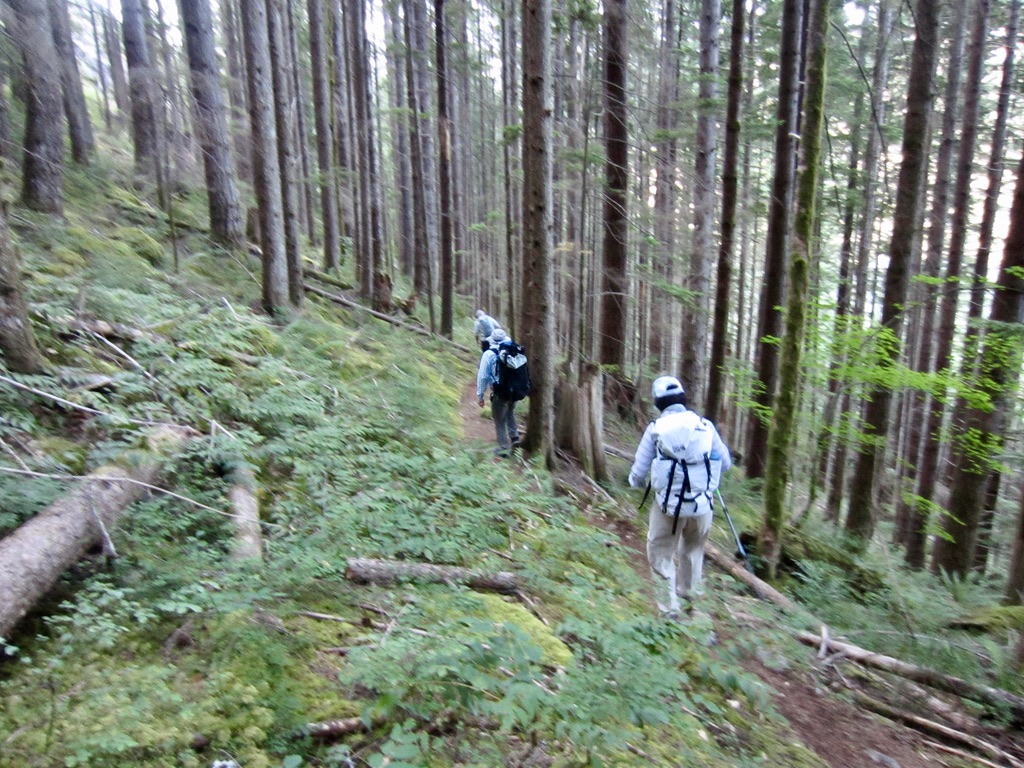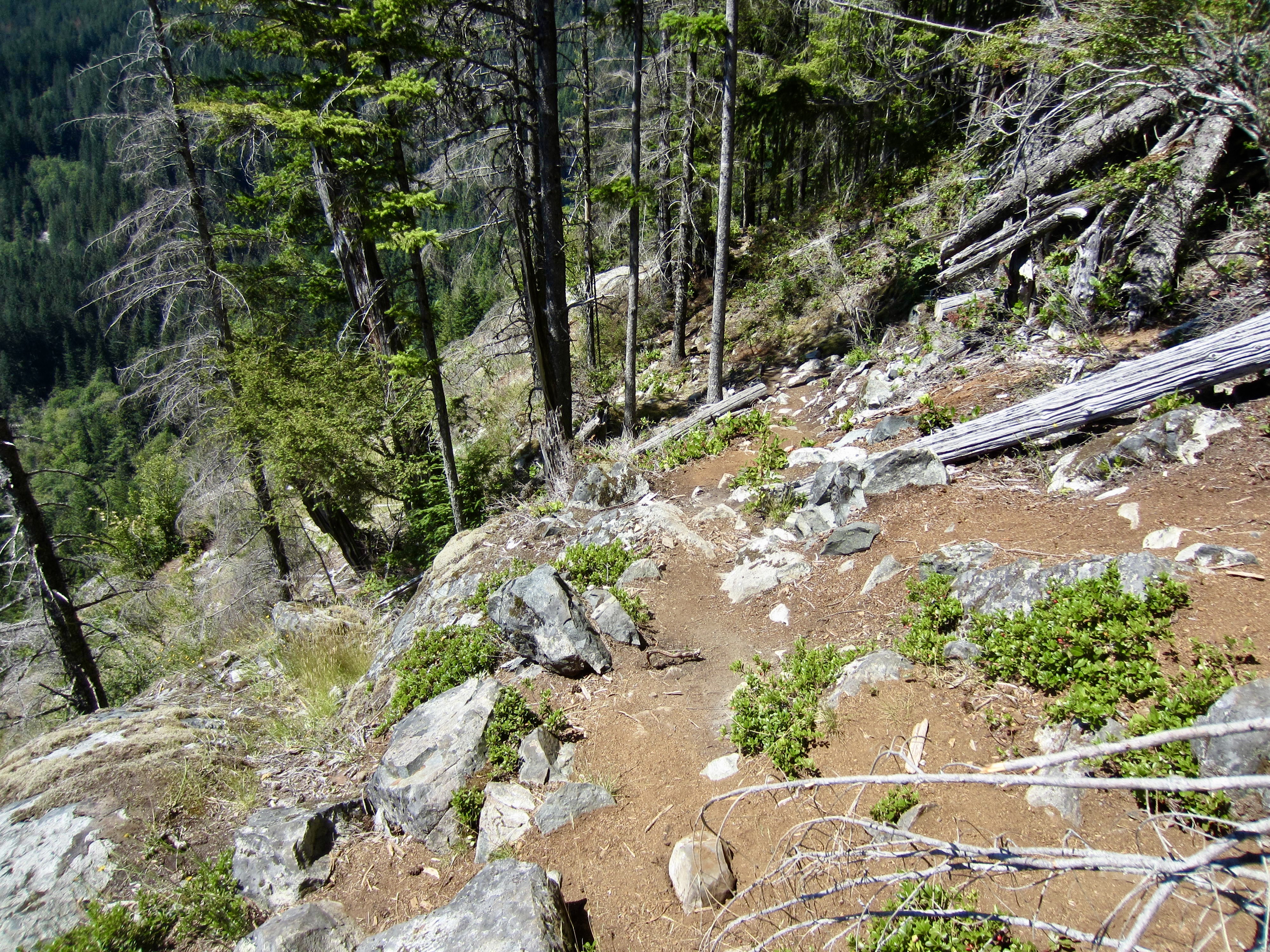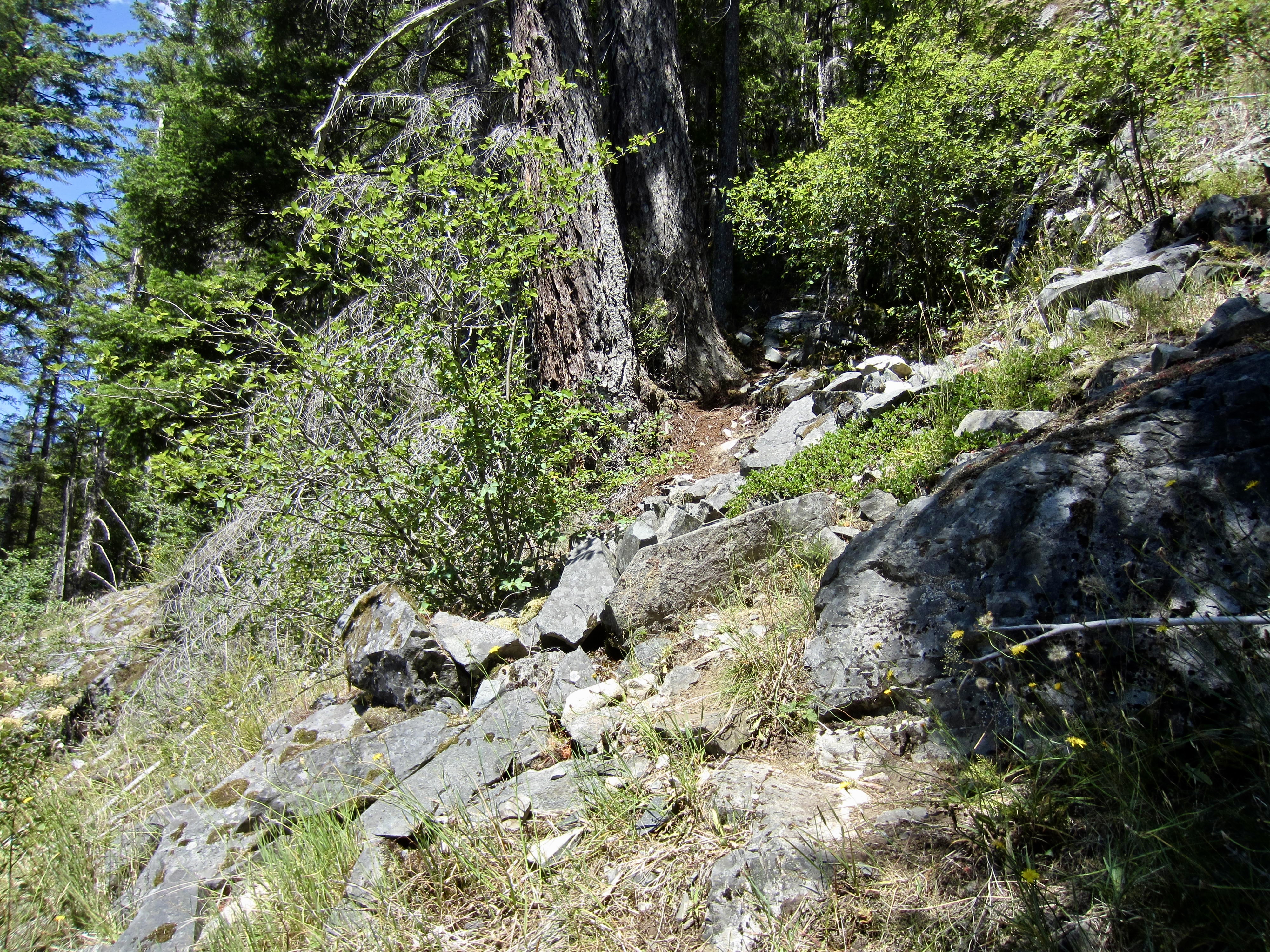 The approach path makes a descending traverse through sparse forest for 100 vertical feet, then climbs steeply for 150 vertical feet. It is well-trodden and easy to follow, with only a few downed logs.