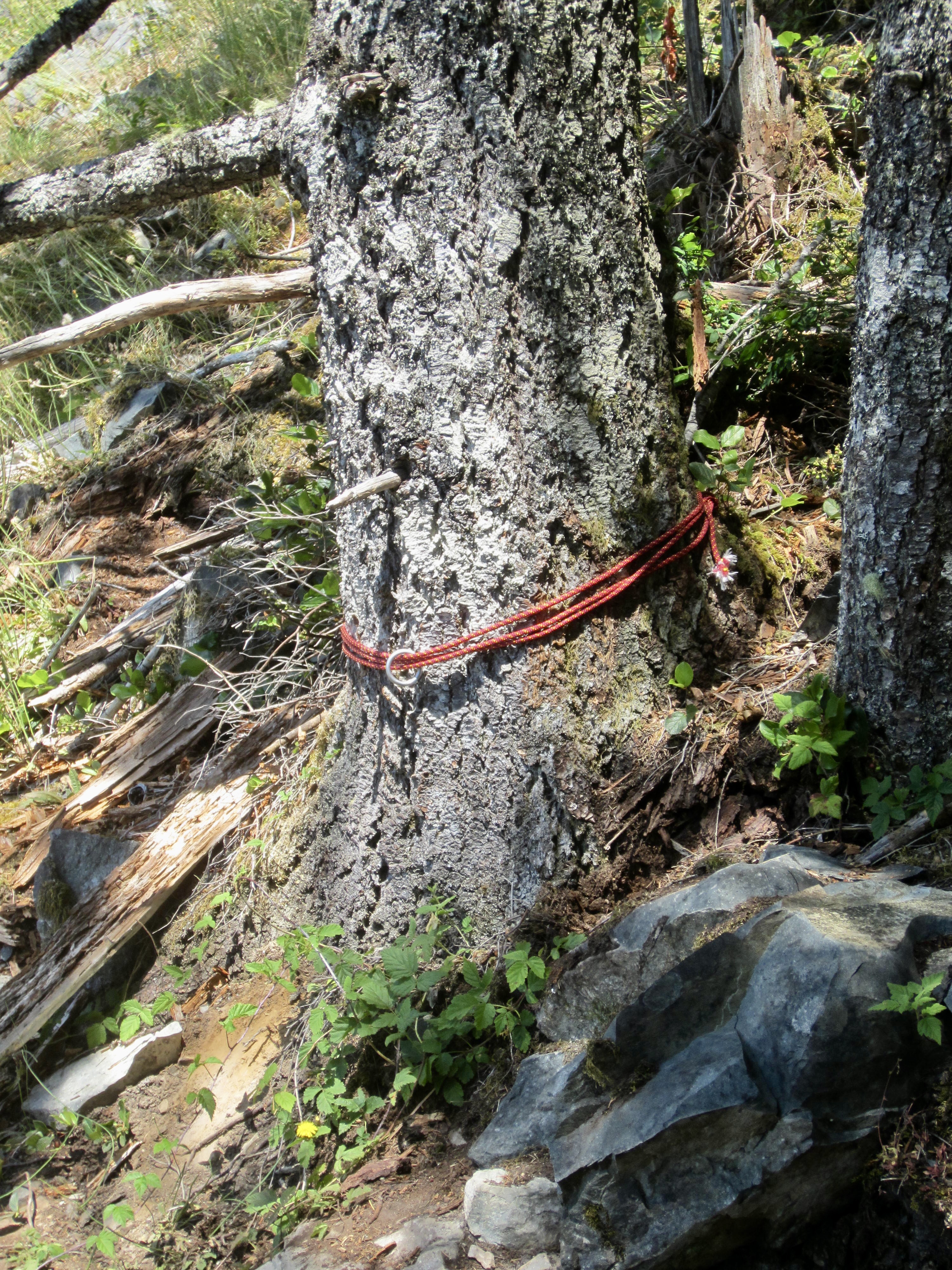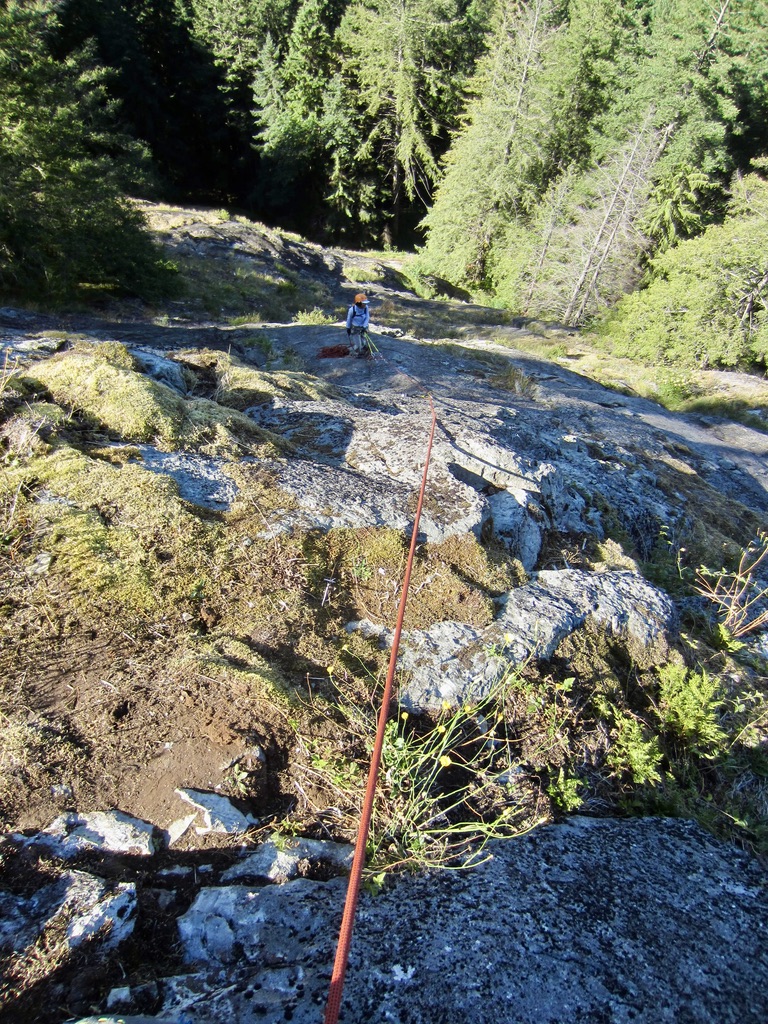 - After topping out on either route, look for a cordelette anchor tied around a large tree. The exit path begins here.